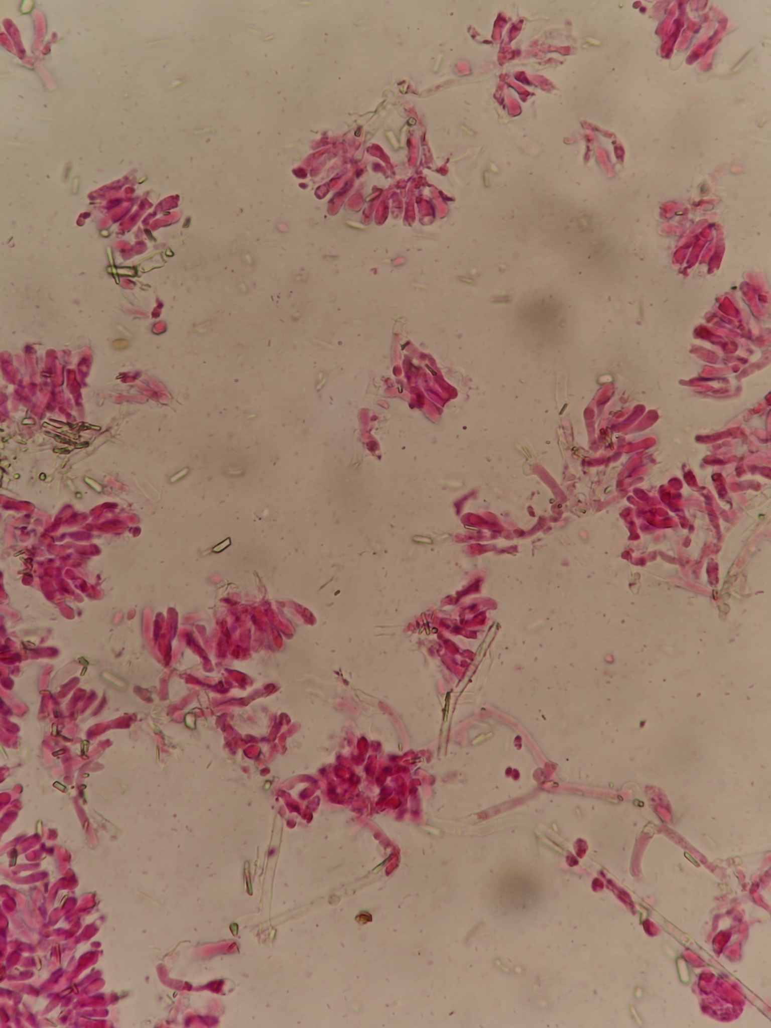 Sporen: Sporen verkehrt- eiförmig oder länglichellipsoidisch, an der Basis mit seitlichem Spitzchen, 3,5—5 µmu lang, 2—2,5 breit. Membran zart, farblos, glatt, Inhalt gleichmässig. Hyphhen unregelmässig, locker verwebt, 2,5—5 µm dick, zartwandig, farblos, glatt, zum Teil inkrustiert oder nur locker, mit kleinen kurzen, stäbchenförmigen Krystallen von oxalsaurem Kalk bedeckt, mit Schnallen an den Septen.