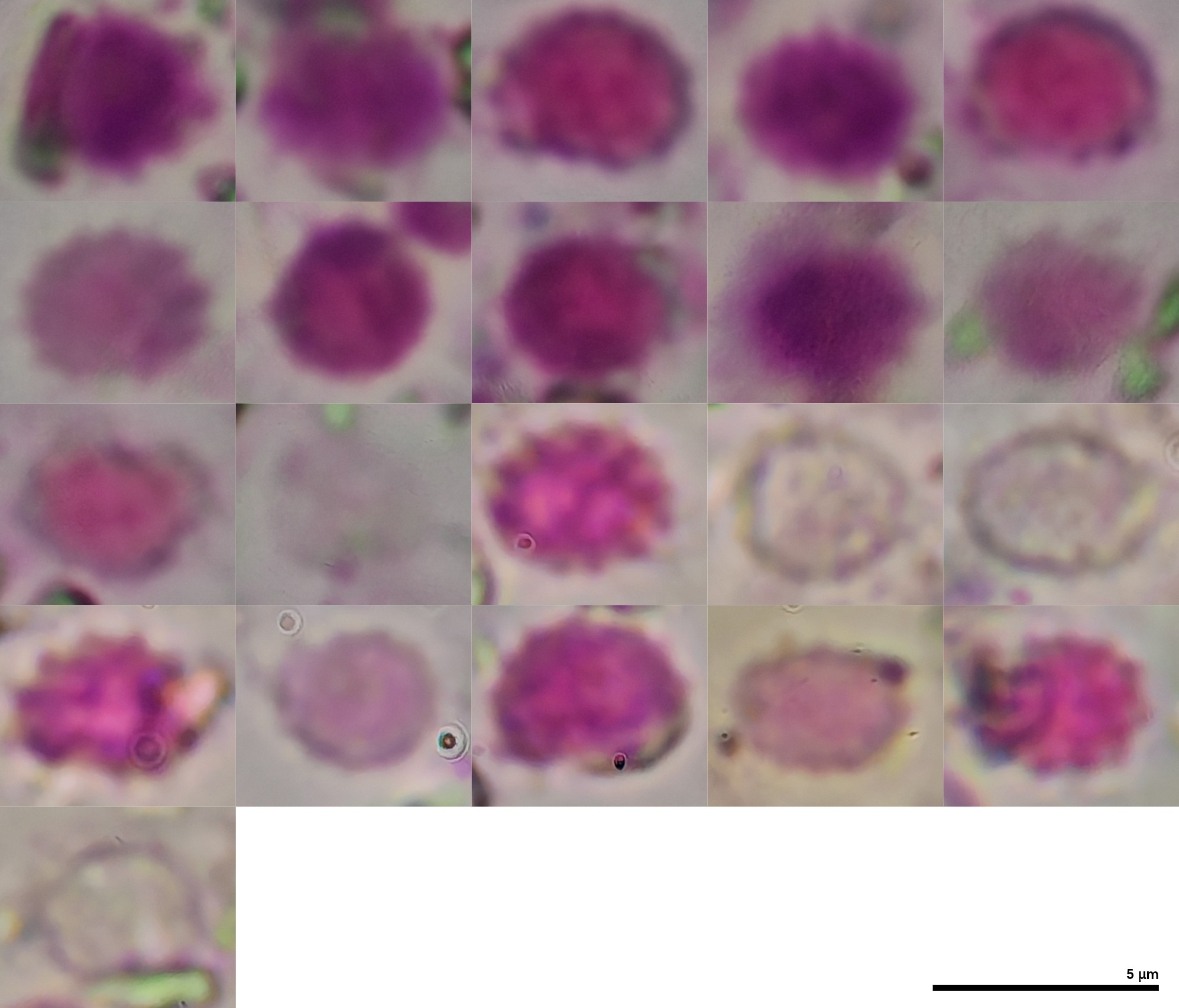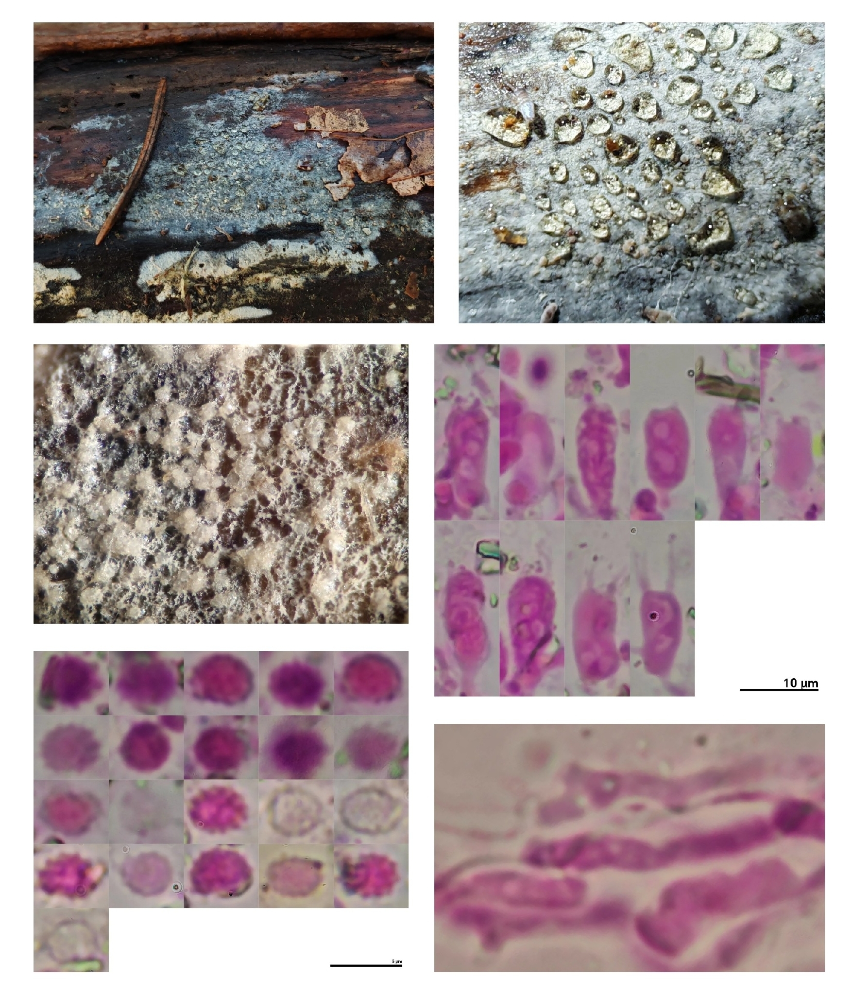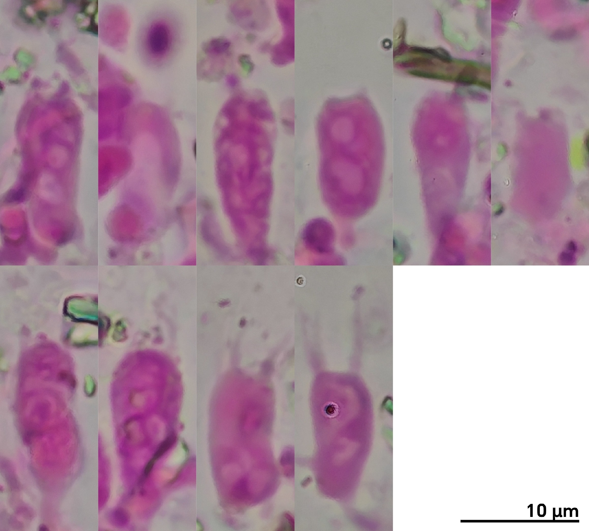 Sporen: Sporen eiförmig bis fast kugelig, auf einer Seite abgeflacht, mit basalem, seitlichem Spitzchen; Membran farblos, zart, deutlich rauh bis fast kurzstachelig; 3,5—6 µm lang, 3—4,5 µm breit. Hyphen undeutlich, verklebt, farblos.