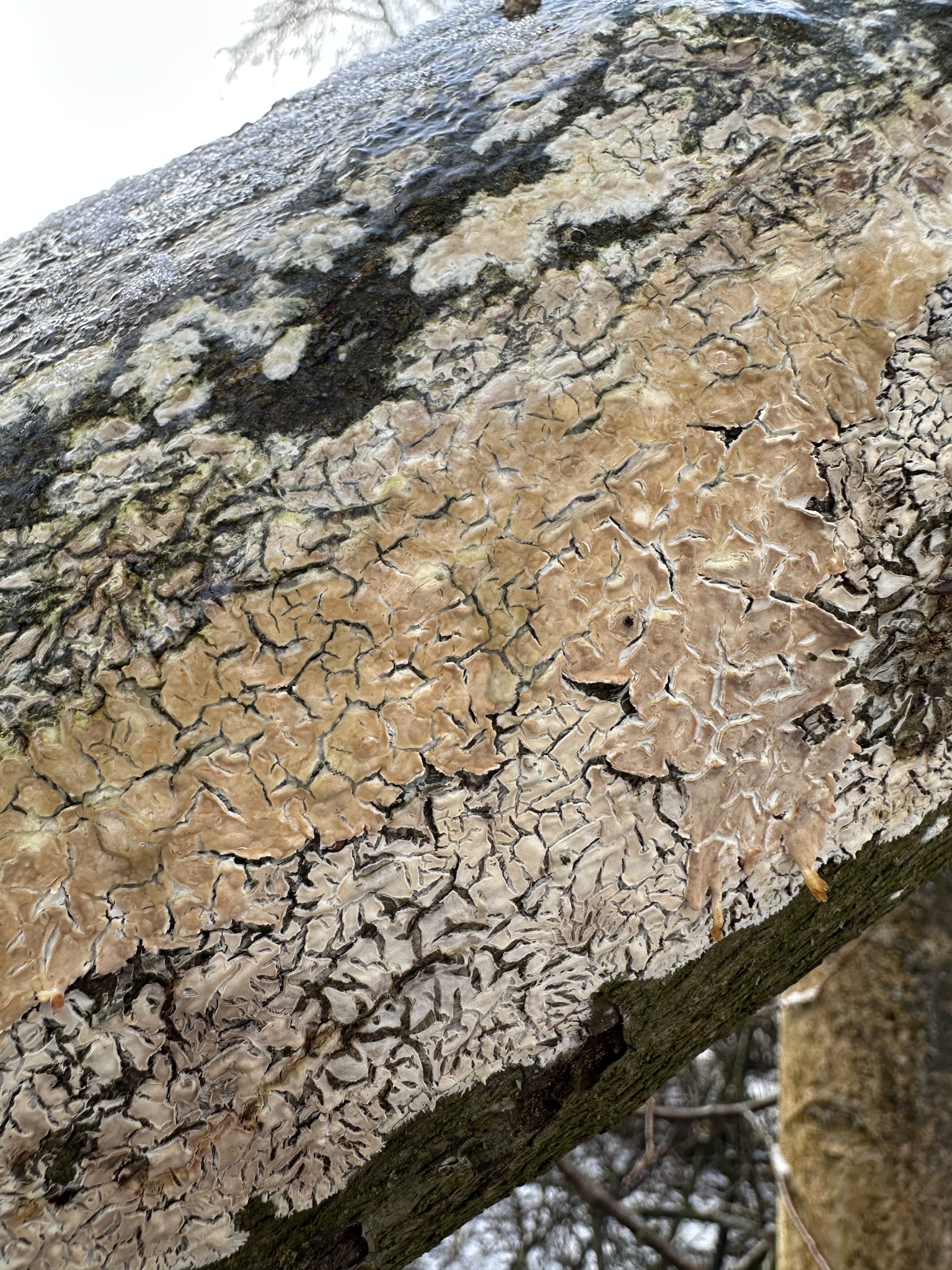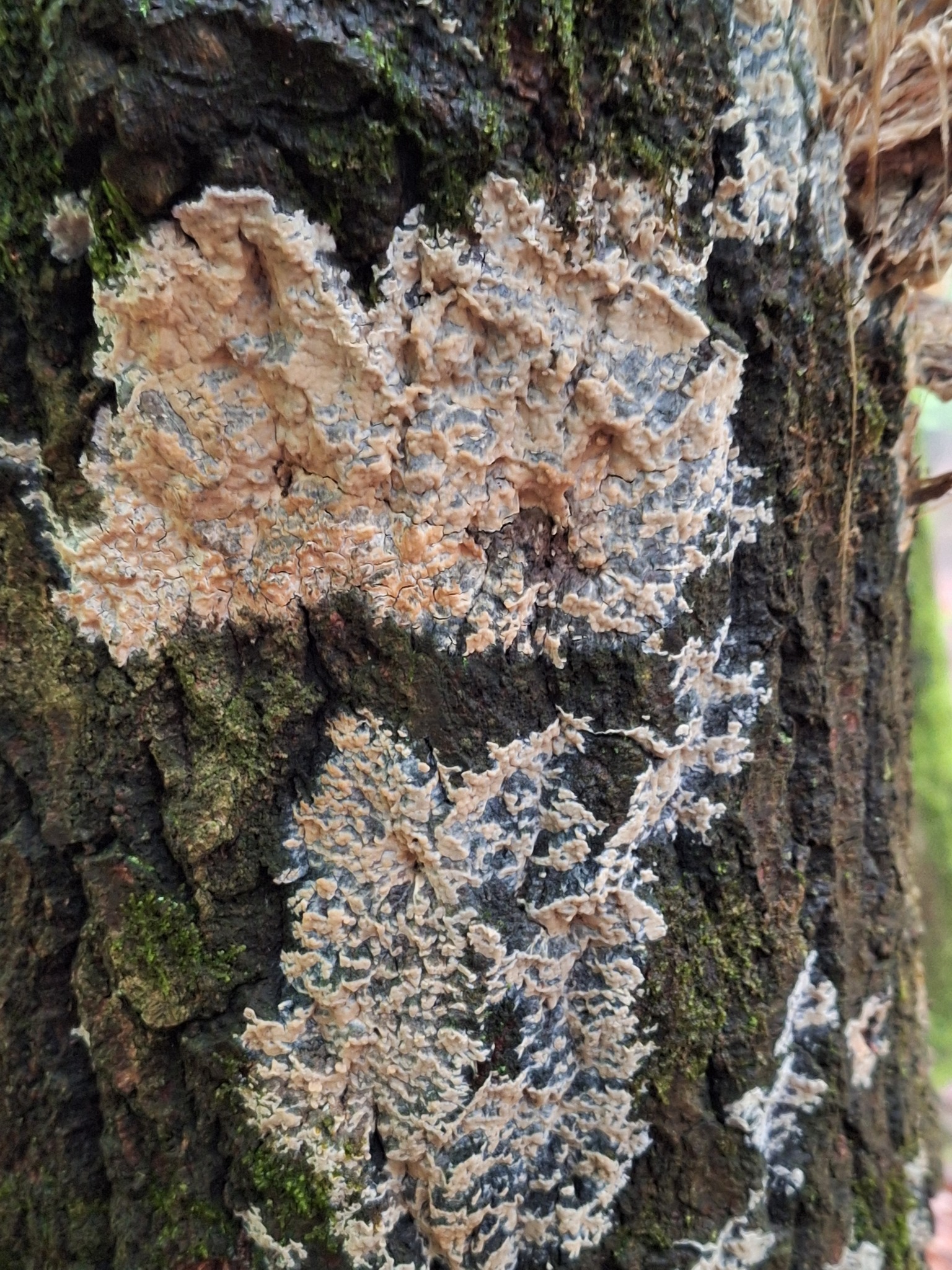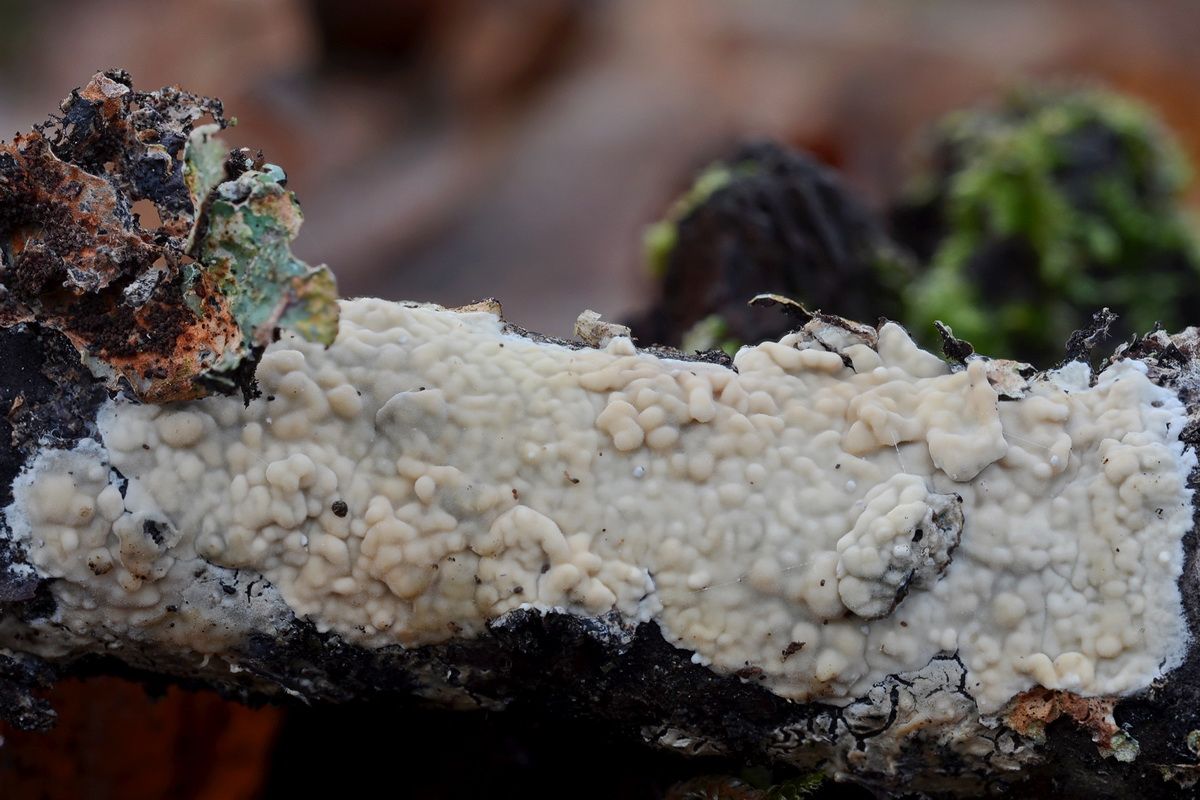 Fruchtkörper: Pilz weit ausgebreitet, unregelmässig rasig. Hymenium feucht aufgeschwollen, in der Mitte knotig, nach dem Rande zu mehr oder weniger gefaltet, trocken zarter, mit fast ebener Oberfläche, rissig, cremgelb oder fleischfarben, am Rande flaumfederig oder etwas faserig, weiss.