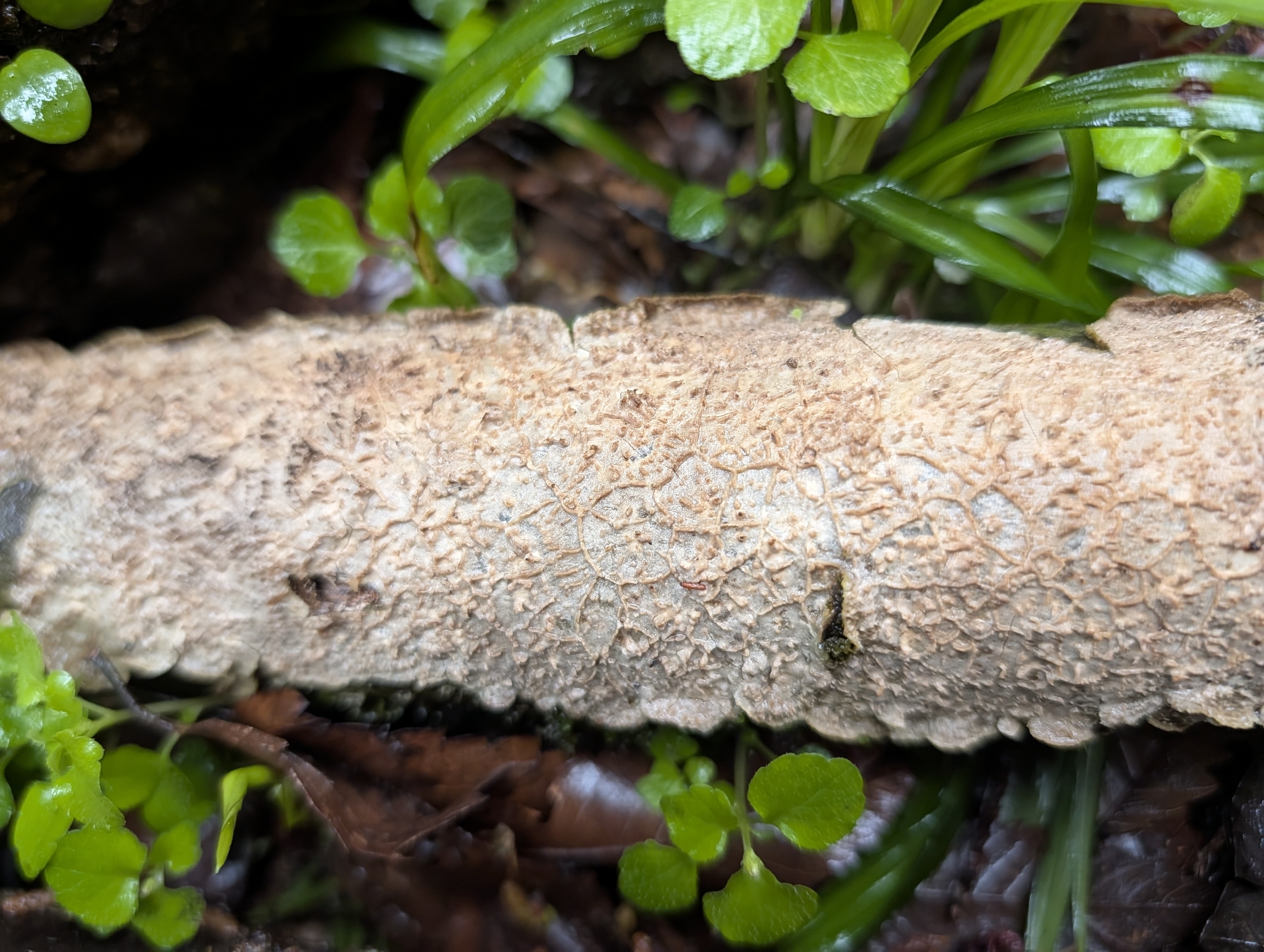 Fruchtkörper: Fruchtkörper hutförmig und zurückgebogen ausgebreitet, lederartig. Hüte halbiert, zusammenfliessend, striegelhaarig-gezont, einfarbig, weissgrau, 2,5 cm breit, mit zarterem, weniger striegelhaarigem Saume. Hymenium grau bis russbraun -purpurn, trocken an dem umgewendeten Teile gefurcht.