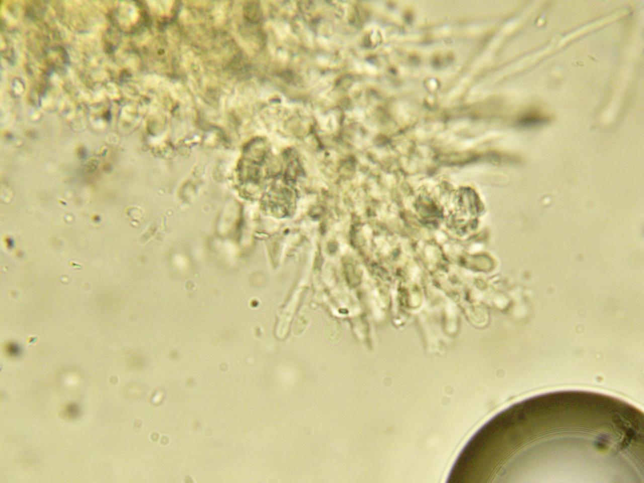Fruchtkörper: Fruchtkörper sehr zart, häutig, weit ausgebreitet, im Umfange schimmelartig-flockig, weiss. Stacheln dichtstehend, gleich lang, kurz, glatt.
