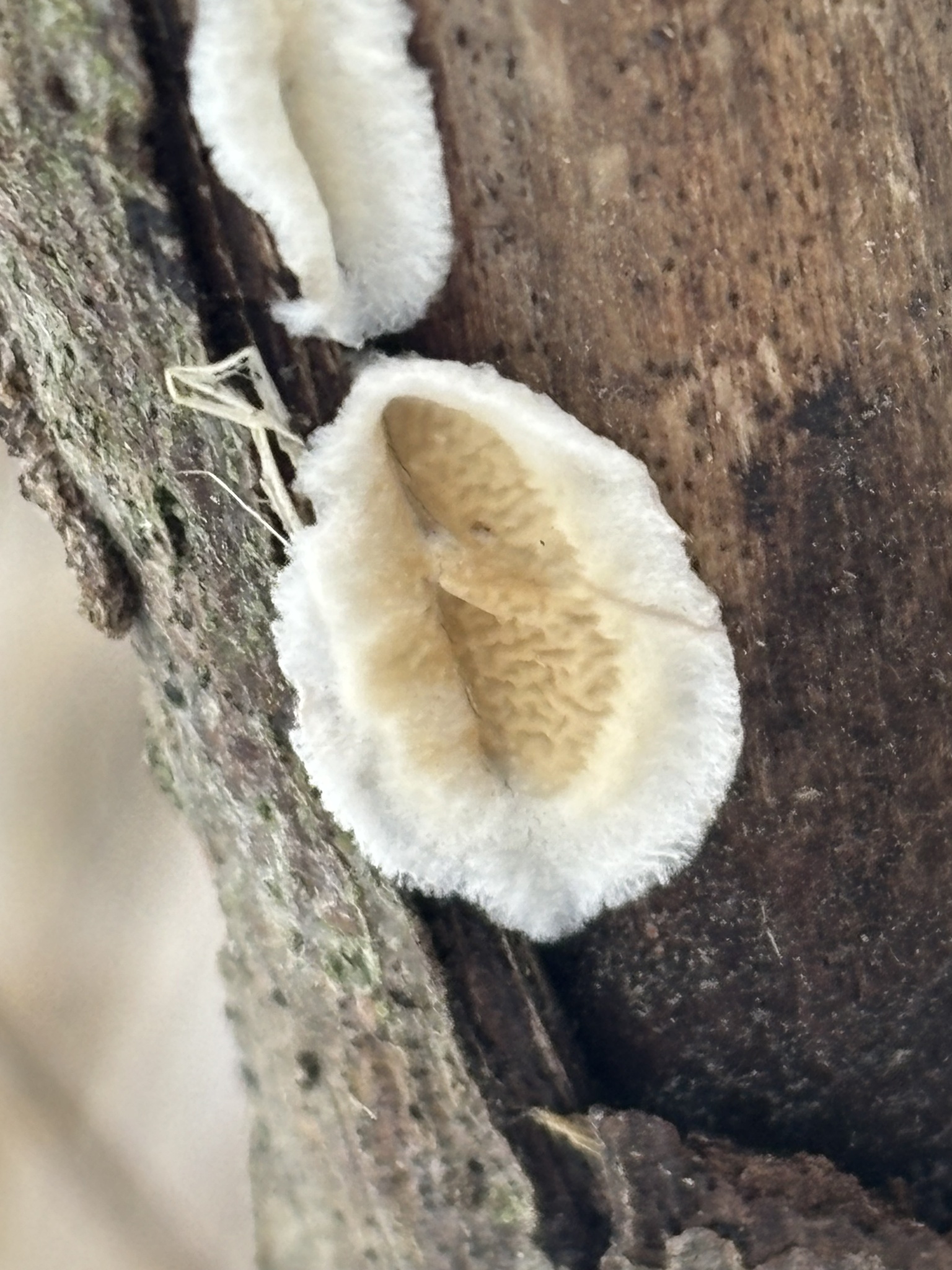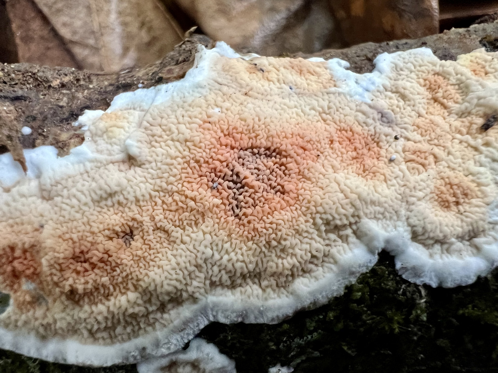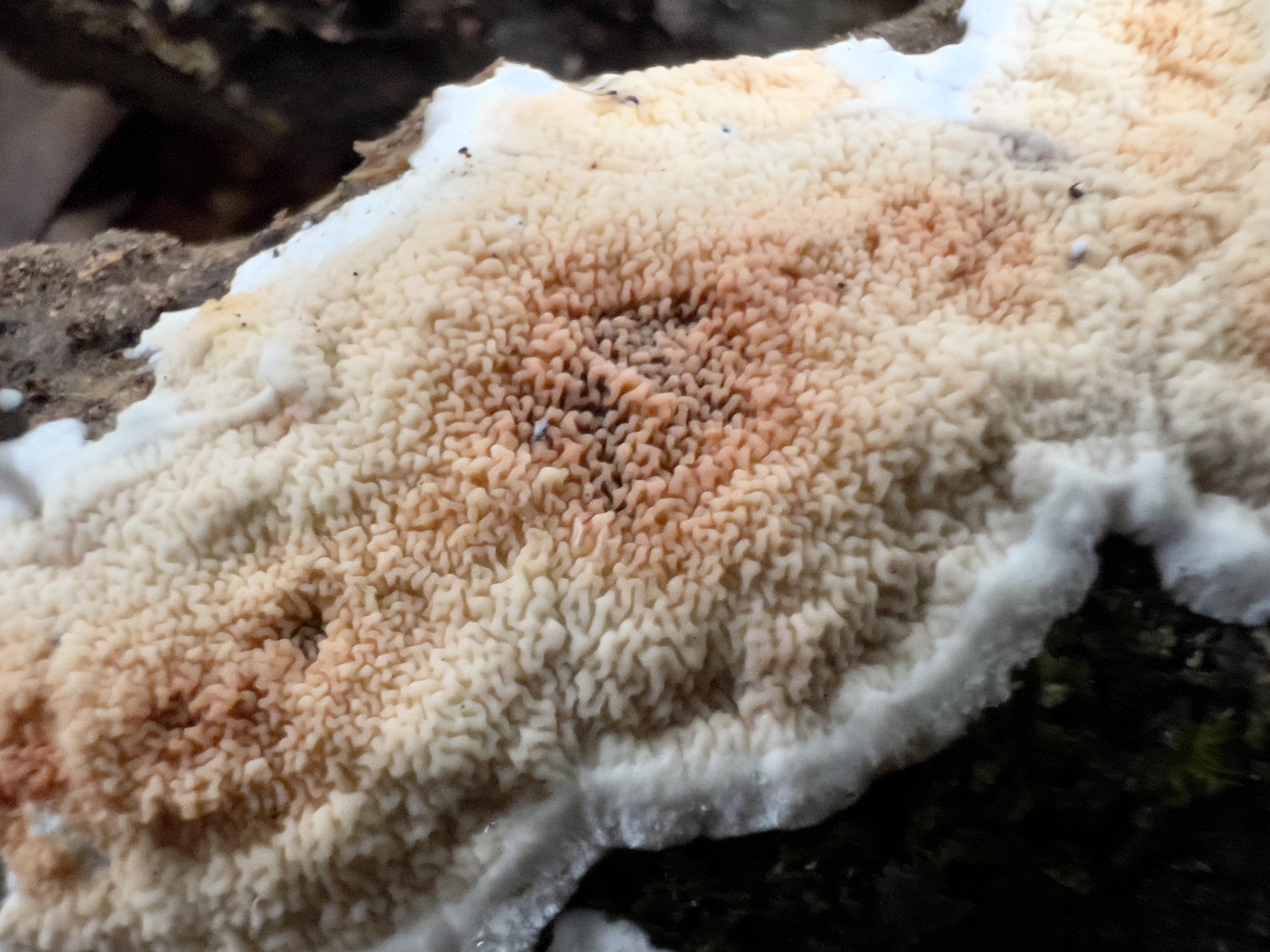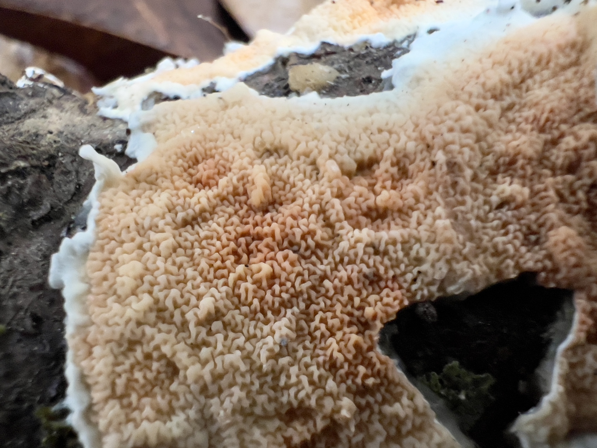 Fruchtkörper: Fruchtkörper weichfleischig, papierdünn, im Umfange frei und später zurückgeschlagen, auf der freien Fläche kurzzottig, weiss, oft gezont. Hymenium anfangs niilchweiss oder gelblich, faltig, später fleischfarben, mit flachen, gewundenen oder netzförmigen Poren.