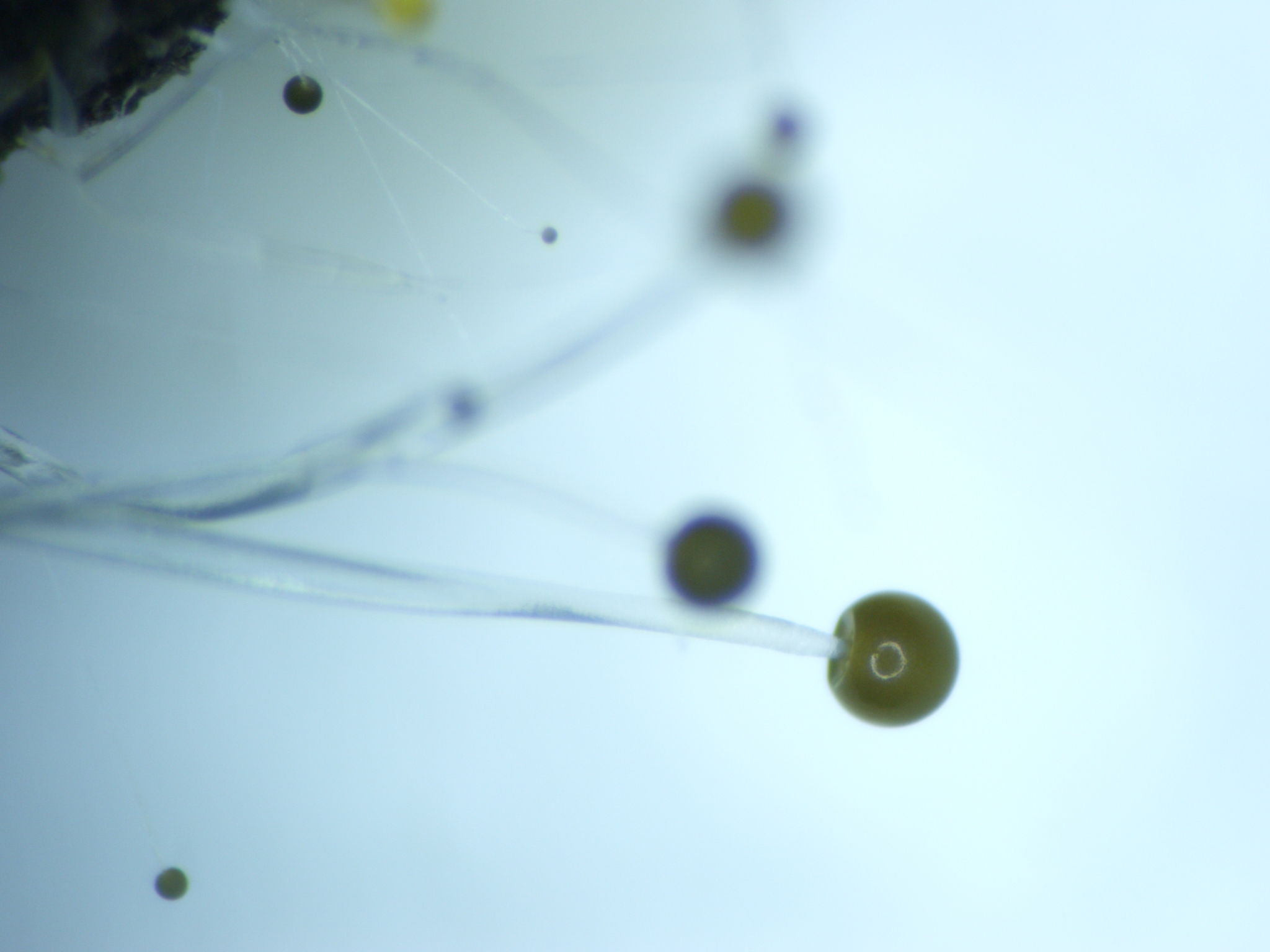 Fruchtkörper: Sporangienträger anfangs aufrecht, später umsinkend und ein krauses Fadengewirr bildend, aber in gerader Länge gemessen 10—12 und mehr Zentimeter lang, 30—80 µm dick, nicht stellenweise angeschwollen. Sporangien weisslich, später gelb, zuletzt schwarz, am Grunde farblos, kugelig, 100—250 a dick, trocken halbkugelig. Columella flach halbkugelig bis knopfförmig, 40—60 µmi hoch, 100—150 µm breit, farblos, glatt.