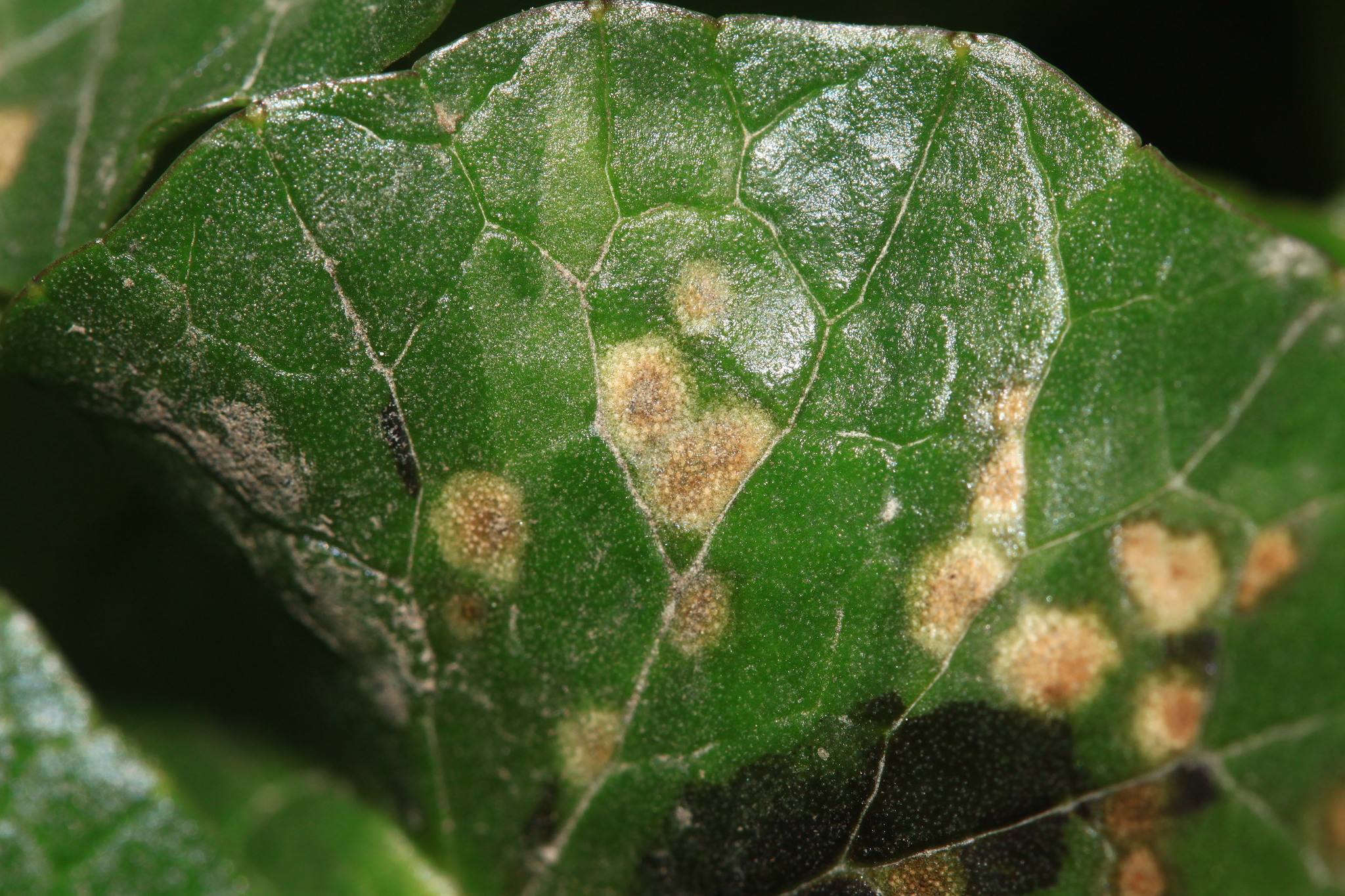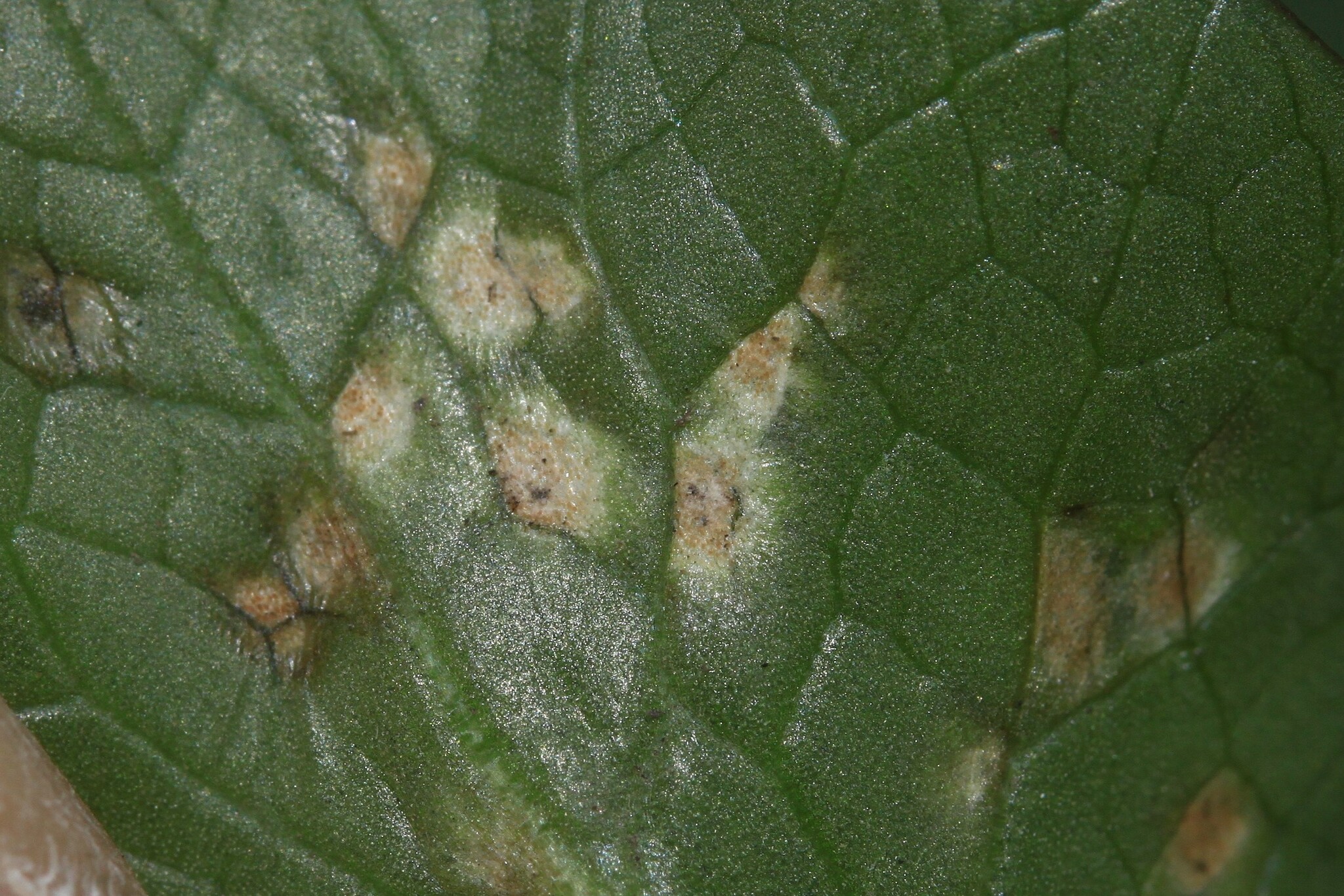 Fruchtkörper: Sporenmasse in 2—5 mm breiten, kreisrunden, flachen, zuerst reinweissen, später gelblichen oder bräunlichen Flecken, die oft in grosser Anzahl auf den Blättern der befallenen Pflanzen nebeneinander auftreten und zuerst von flachen Rasen büschelig vortretender Conidienträger bedeckt sind.