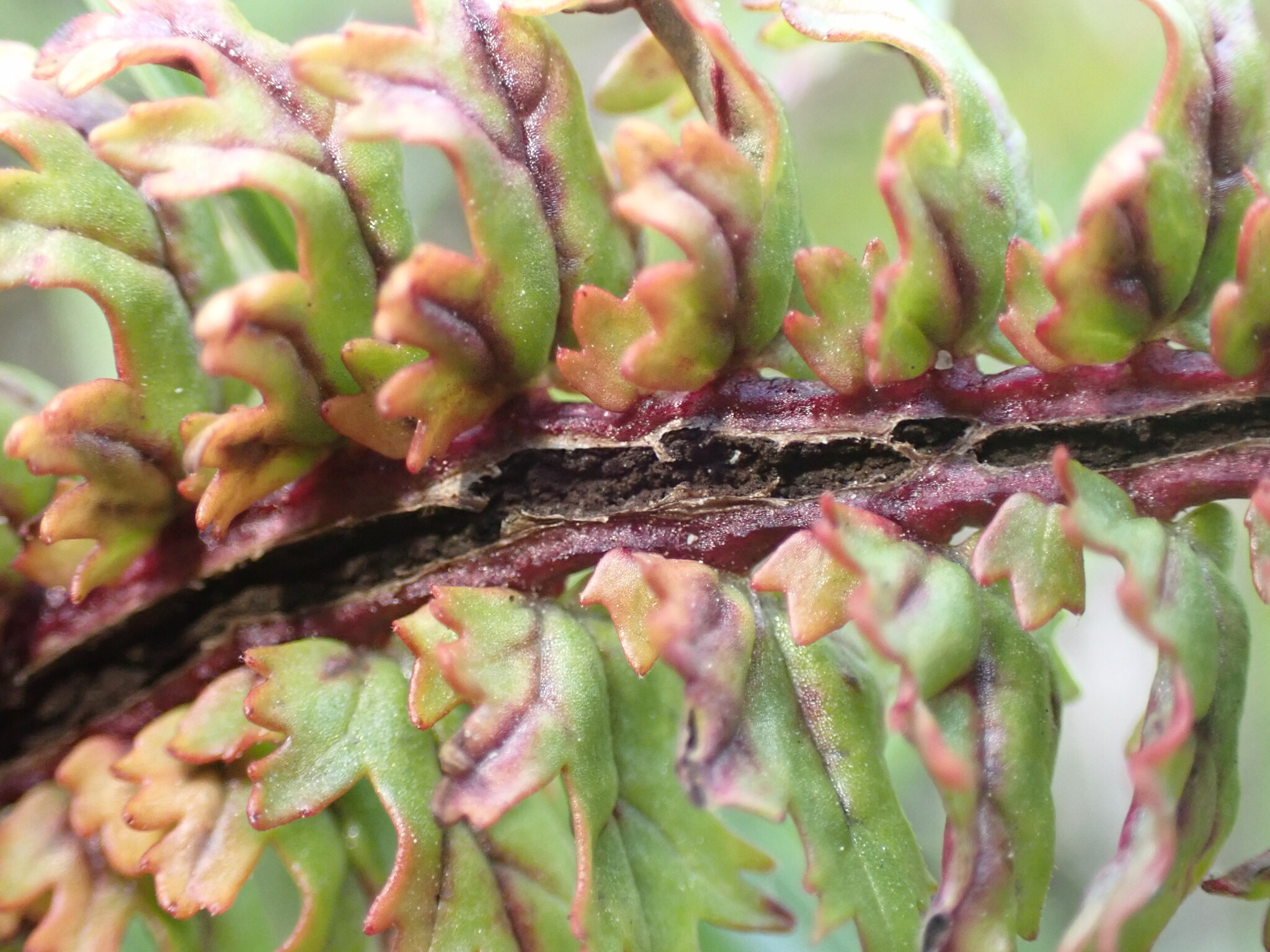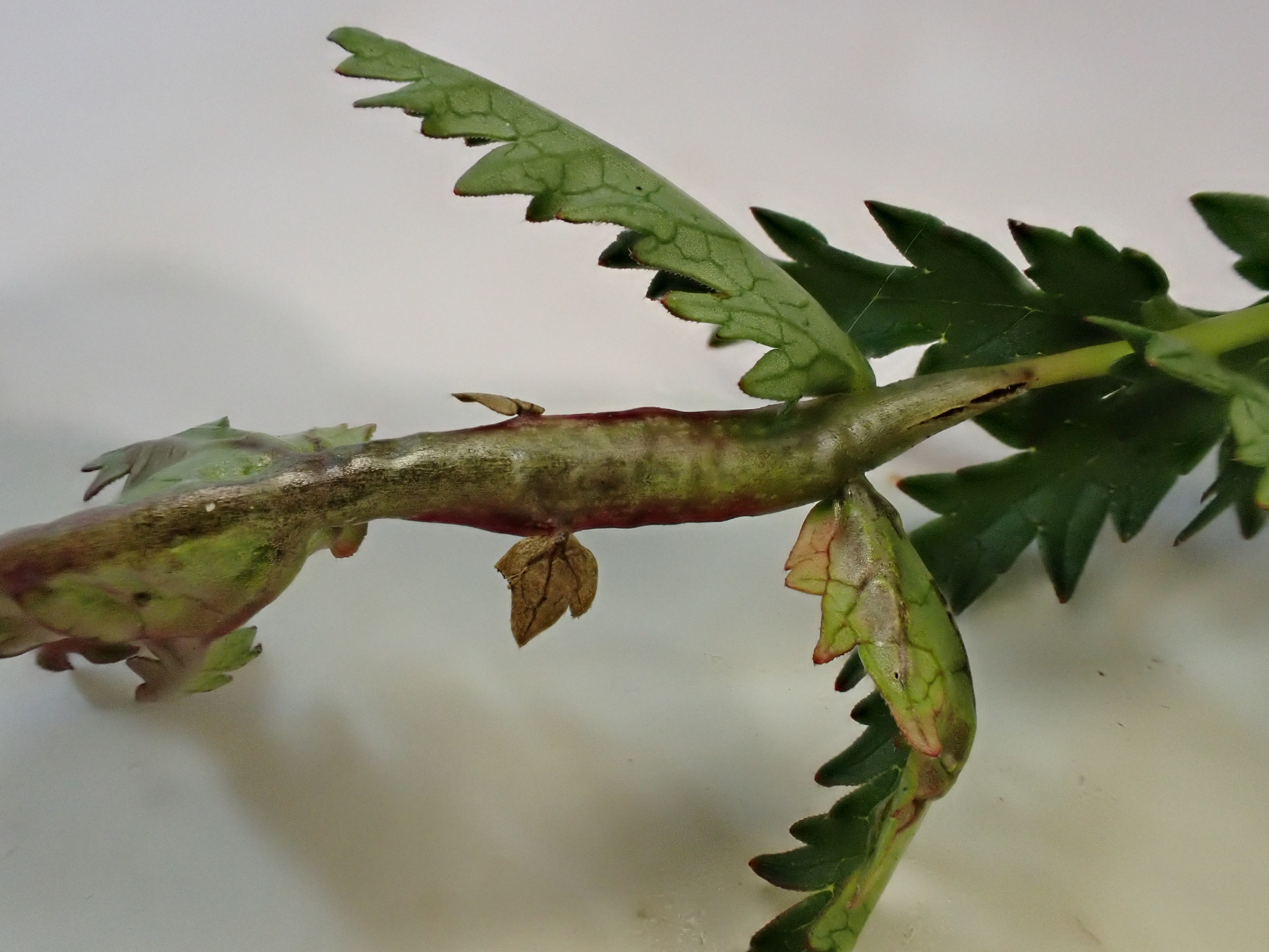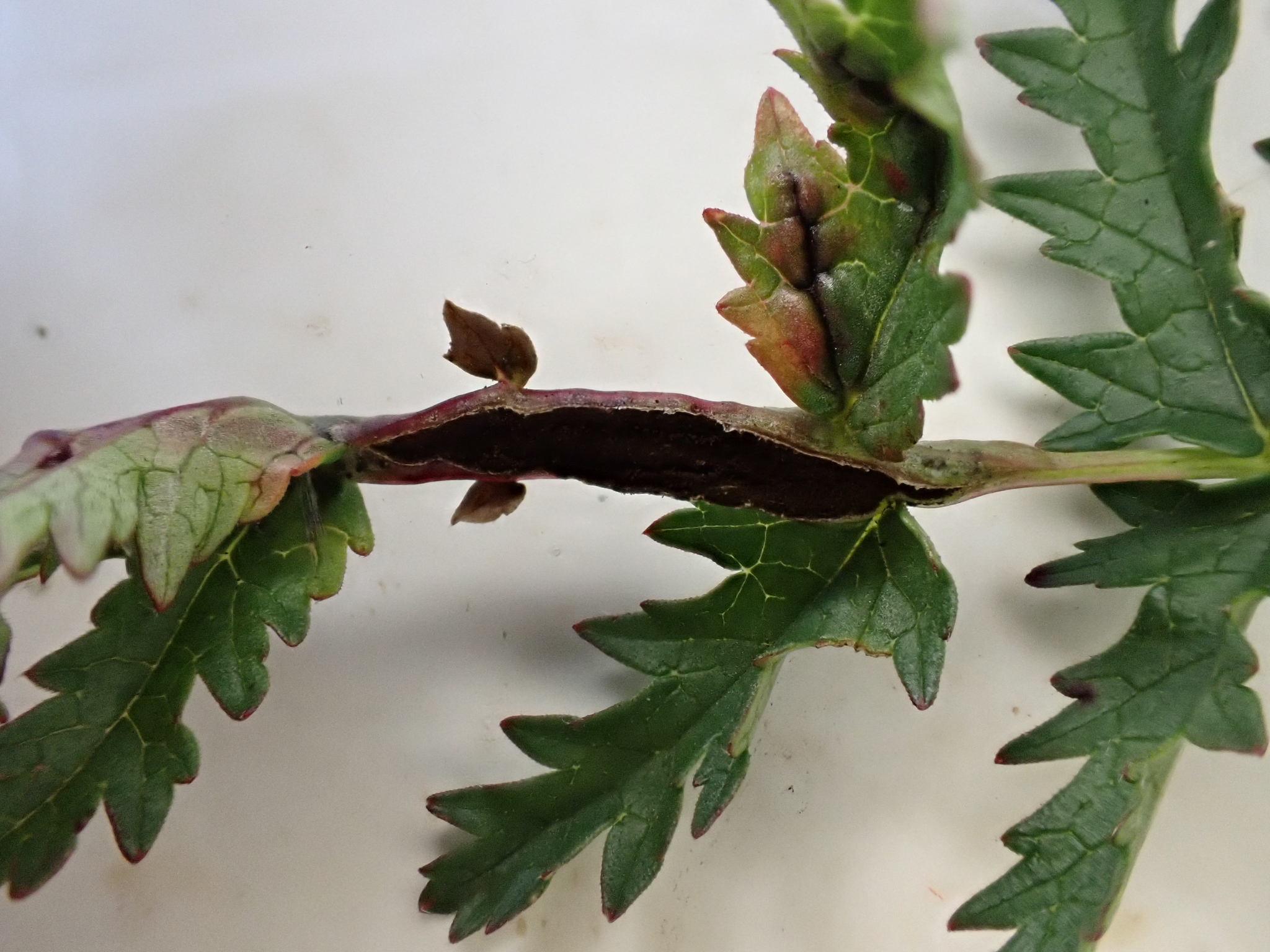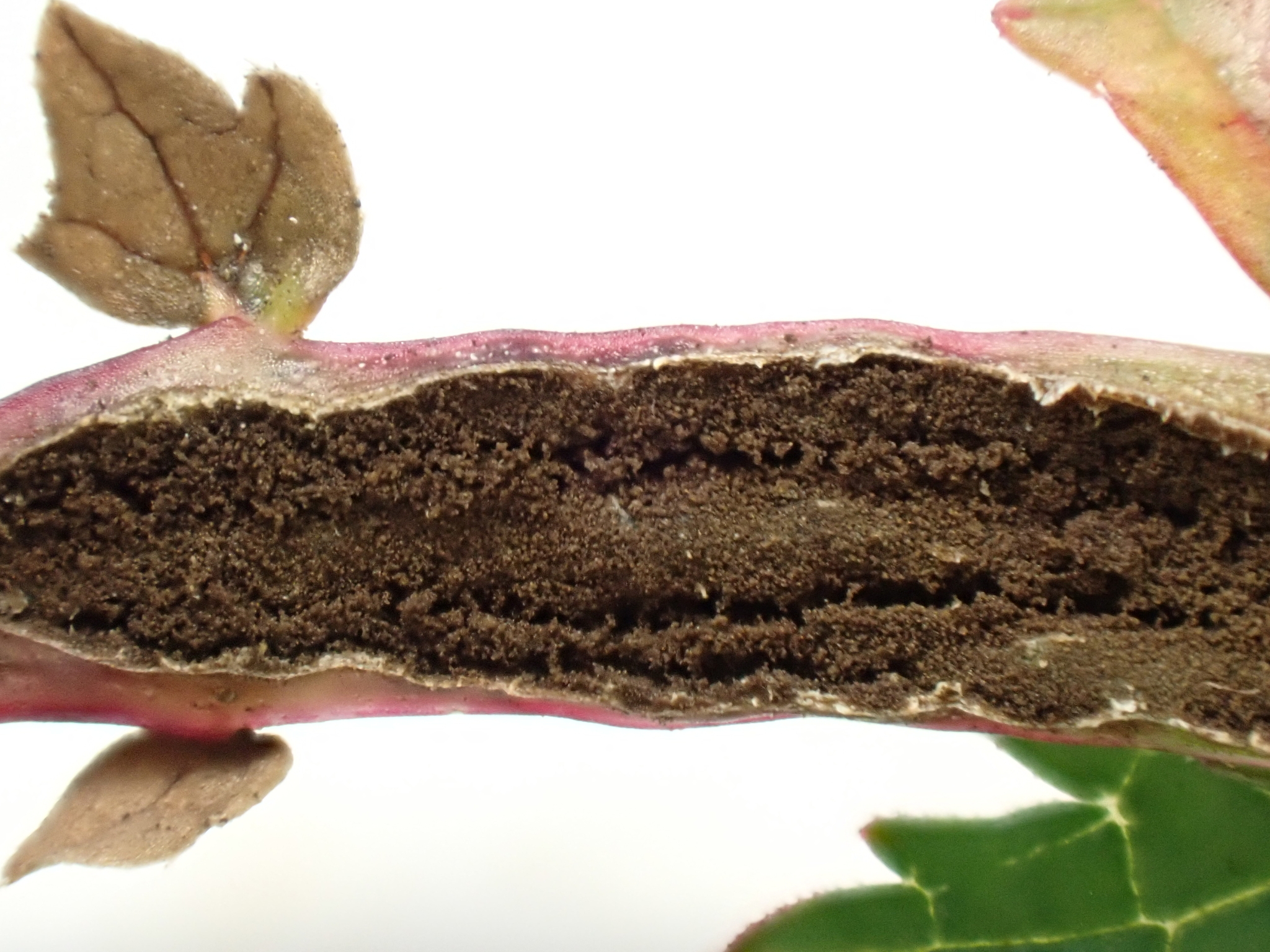 Fruchtkörper: Sporenmasse schwarz, an den Blättern und Blattstielen anfangs von der Epidermis bedeckte Schwielen bildend, die später weit aufreissen und die Masse verstäuben lassen.