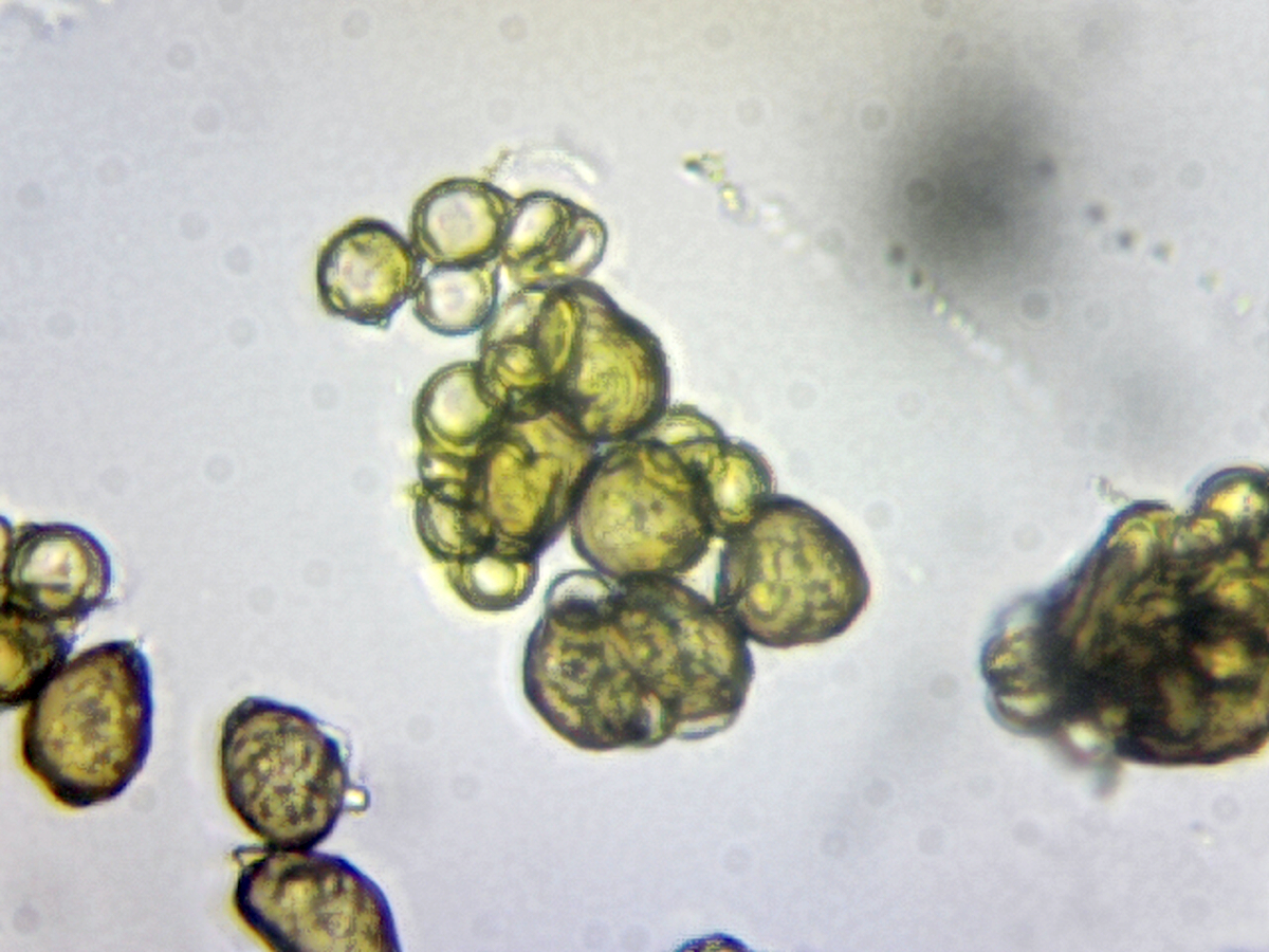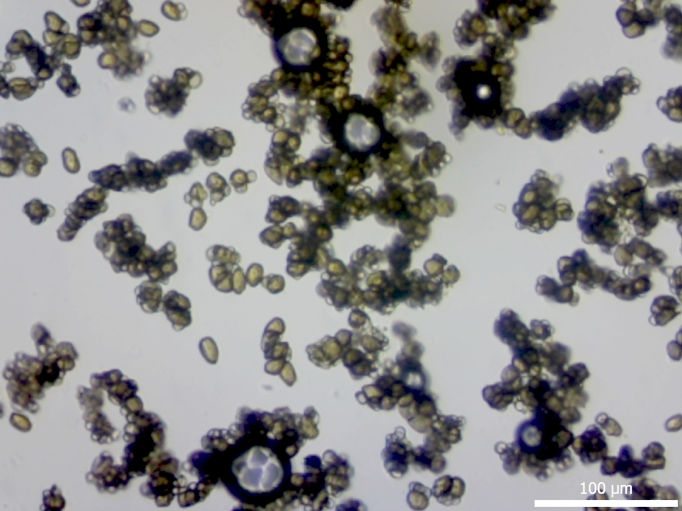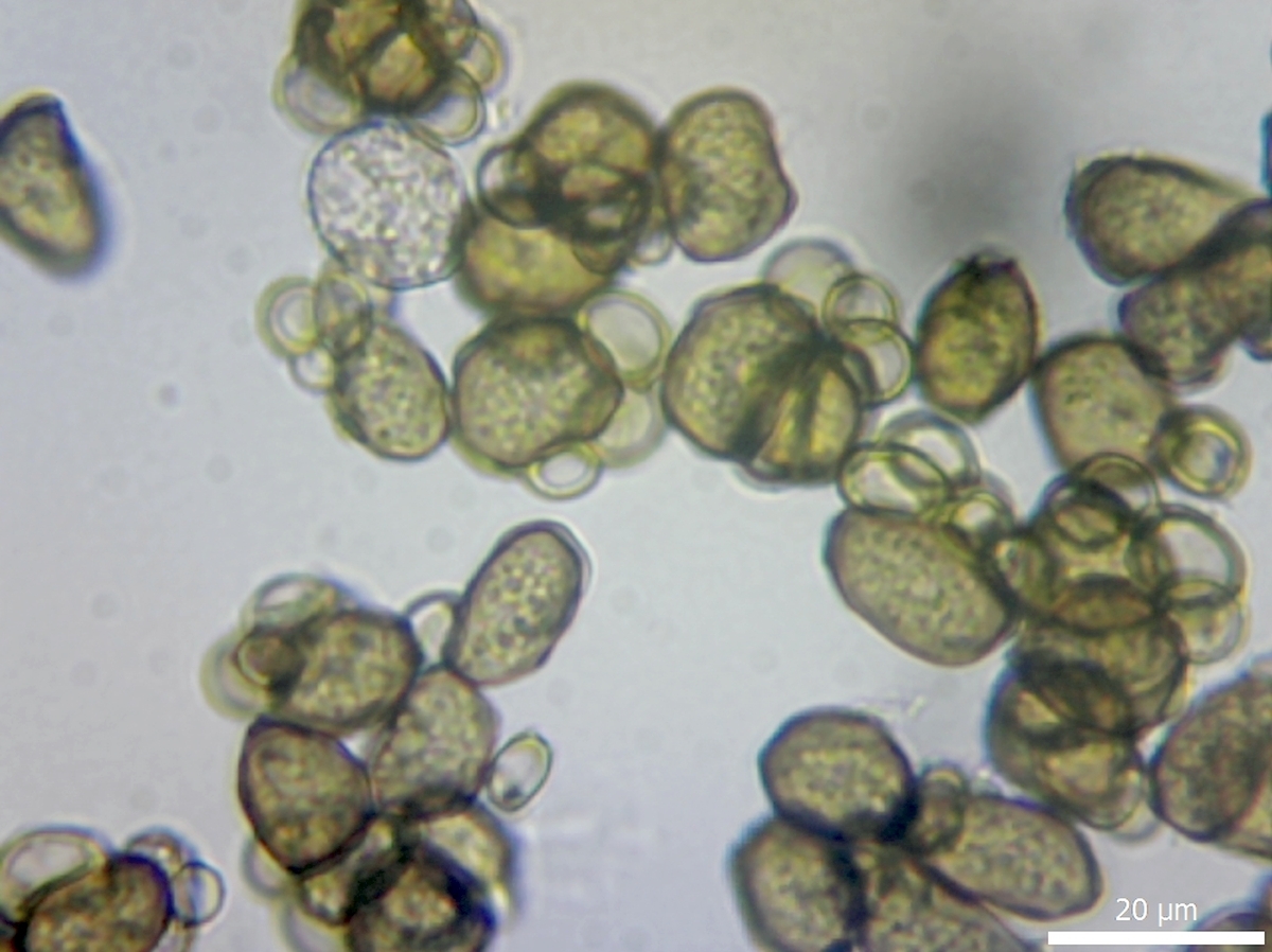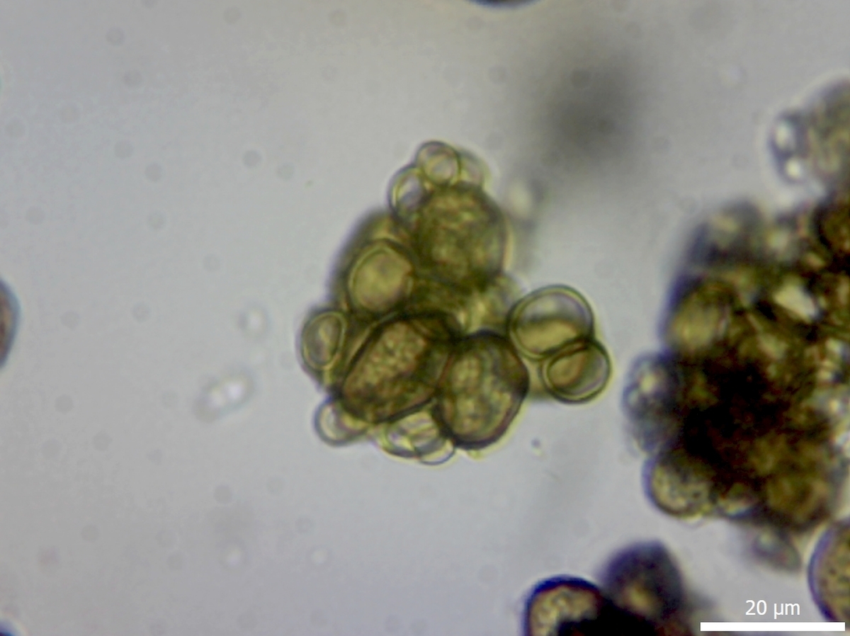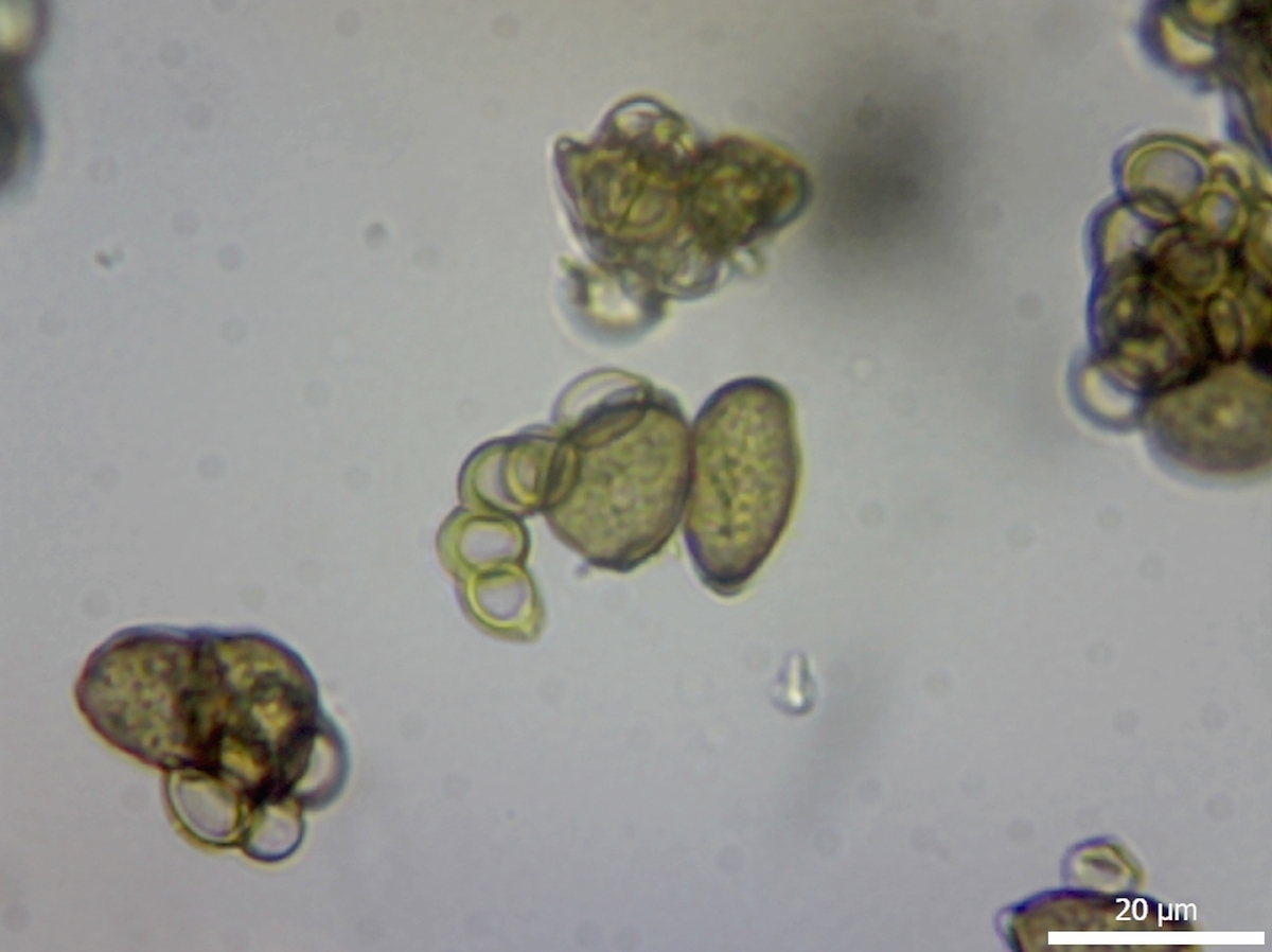 Sporen: Sporenballen rundlich oder länglich, Sporenballen sehr verschieden gestaltig, bis 44 µm lang, mit drei bis sieben unregelmässig höckerigen, 15—20, selbst bis 24 µm langen und 11—13 µm breiten Hauptsporen und unregelmässigen, halbkugeligen, 8—12 µm breiten, dunkelbraunen, von den Hauptsporen kaum zu unterscheidenden Nebensporen.