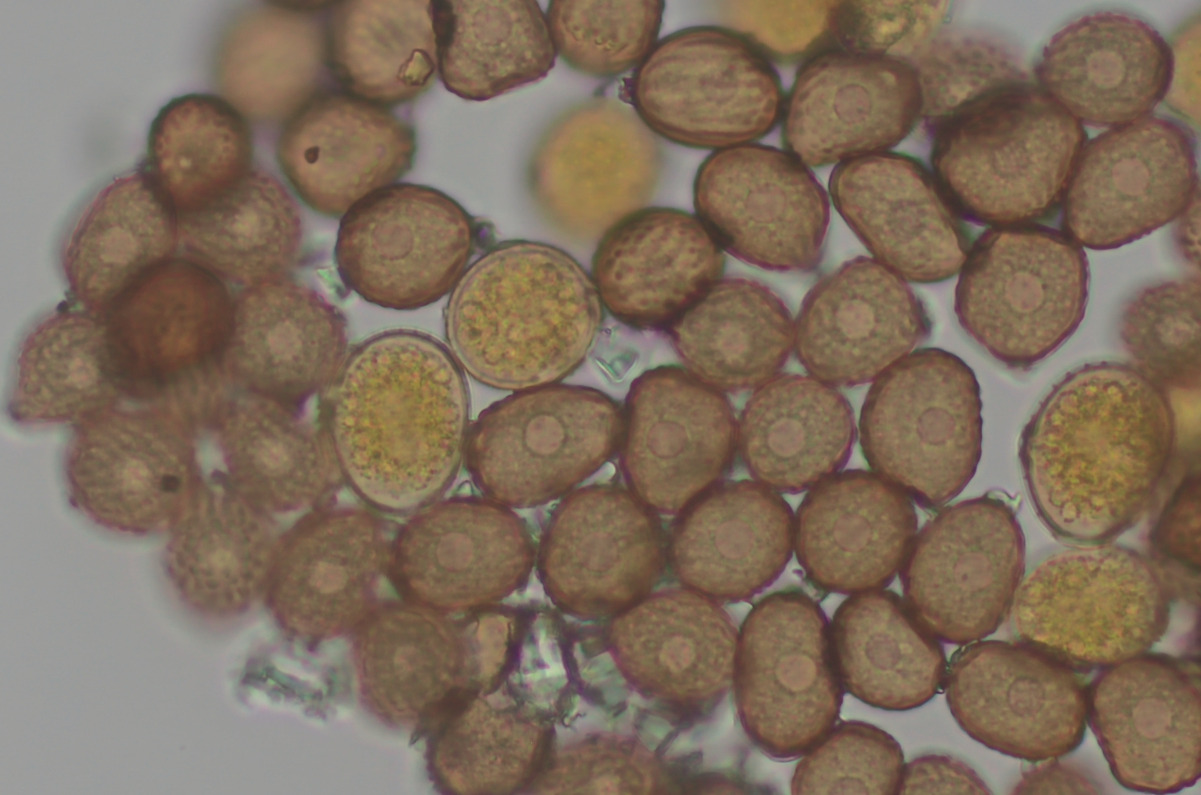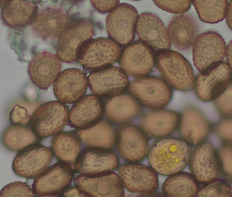 Sporen: Uredosporen kugelig, fast kugelig oder ellipsoidisch, kleinstachelig, gelb- bräunlich, 15—24 µm lang, 14—22 µm breit, mit ziemlich zartem, 1,5-2,5 µm dickem Epispor und drei bis vier Keimporen. Teleutosporenlager ähnlich aber dunkler. Teleutosporen kugelig, fast kugelig oder eiförmig, am Scheitel mit kleiner, farbloser Papille, dicht mit stellenweise reihenförraig angeordneten Warzen bedeckt, braun, 14—24 µm lang, 14—21 [X breit, mit kurzem, farblosem Stiel.
