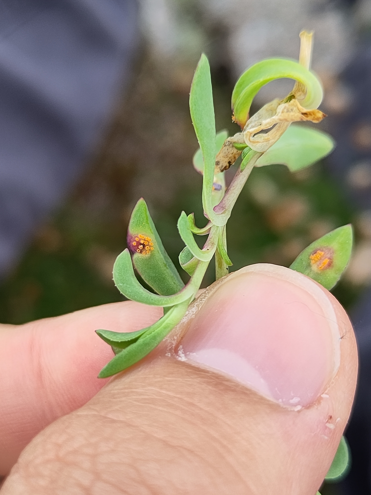 Sporen: Sporen stumpf polyedrisch bis stumpf kugelig oder ellipsoidisch, 15—21 µm dick, mit dünner, sehr dicht und feinwarziger Membran. Teleutosporeulager oft dicht neben oder zwischen den Aecidien hervorbrechend, nicht kreisförmig angeordnet, kompakt, dunkelbraun bis fast schwarz, rundlich, früh nackt. Teleutosporen fast kugelig bis verkehrt eiförmig, seltener etwas ungleichseitig, 25—31 µm lang, 21—28 µm dick, mit glatter, gelbbrauner, in der Scheitelpartie stark verdickter und gegen die Spitze hin mit heller oder farbloser, sehr breiter und flacher Scheitelkappe versehener Membran. Stiel sehr lang, bis 73 µm, derb, gelblich.
