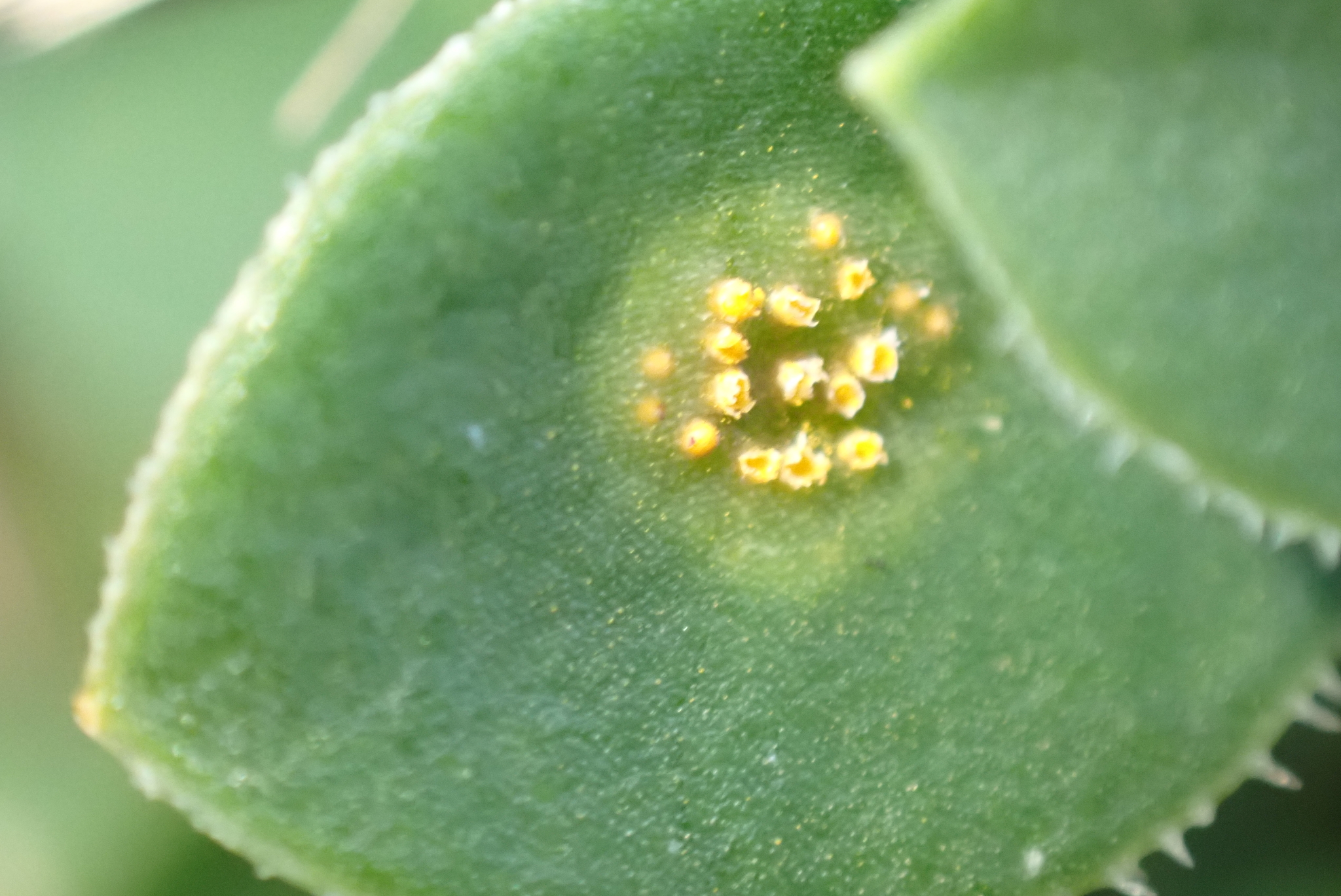 Fruchtkörper: Aecidien zu grösseren oder kleineren rundlichen Gruppen vereinigt, zuweilen in konzentrischen Kreisen auf der Blattunterseite, vereinzelt auch auf der Blattoberseite. Peridie etwas vorragend, schüsseiförmig, mit umgeschlagenem, stark zerschlitztem, gelblich- weissem Rande; Peridienzellen in ziemlich deutlichen Längsreihen, auf der Aussenseite nach unten übereinandergreifend; Aussenwand dick (ca. 7 µm), in der Flächenansicht mit feinen, meist längs verlaufenden Streifen, Innenwand dünner (ca. 3 µm), mit Stäbchenskulptur, von der Fläche gesehen ziemlich dicht, kleinwarzig.