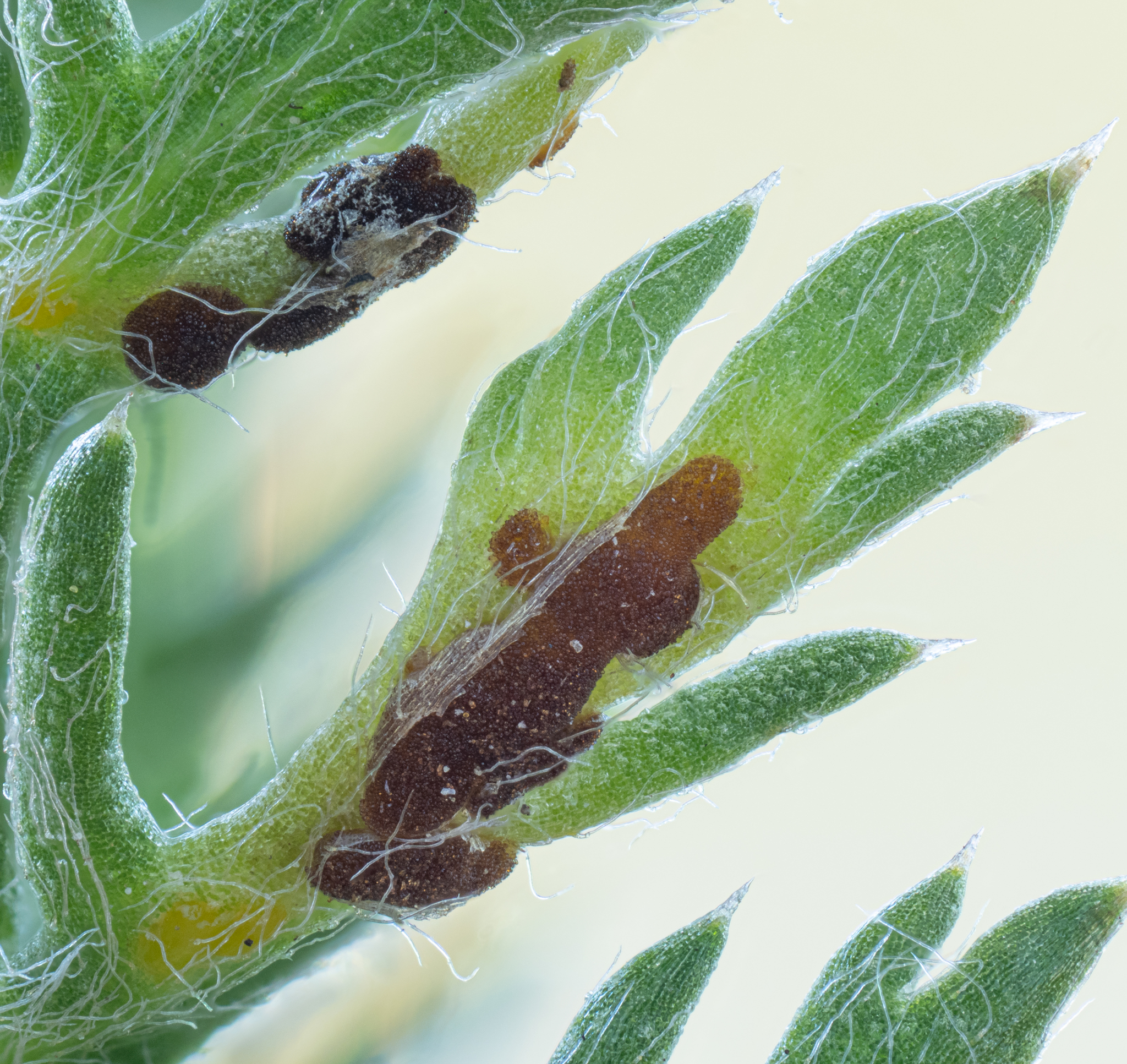 Fruchtkörper: Teleutosporenlager fest, rundlich, ziemlich klein, braun, auf beiden Blattseiten, zuweilen zusammenfliessend.