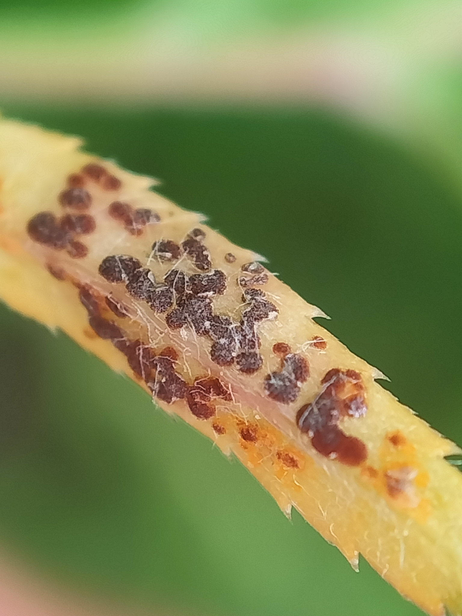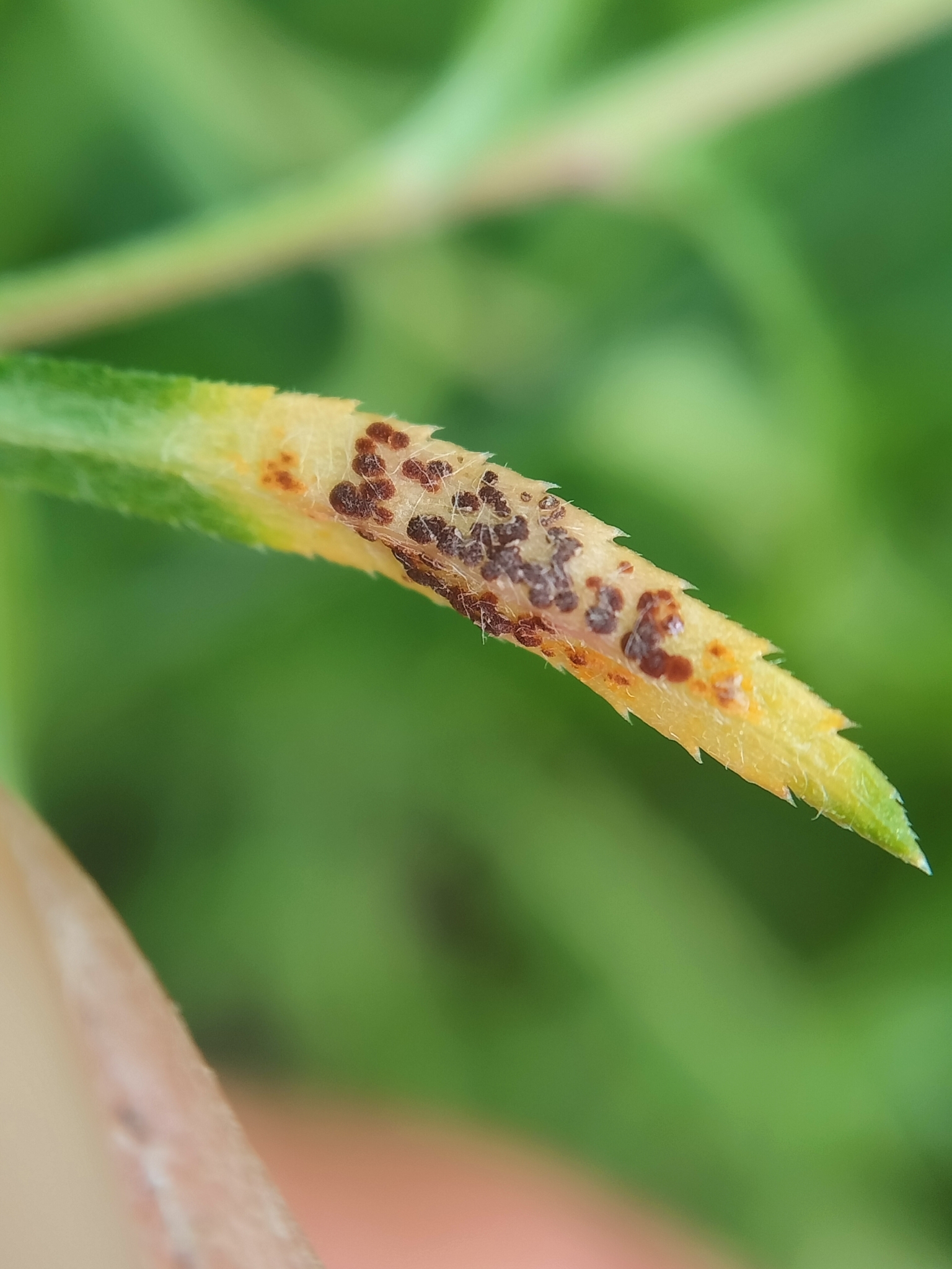 Fruchtkörper: Teleutosporenlager klein, rundlich, fest, braun, meist auf gelben oder rötlichen Flecken der Blattunterseite in dichten, rundlichen Gruppen, zuweilen zusammenfliessend.