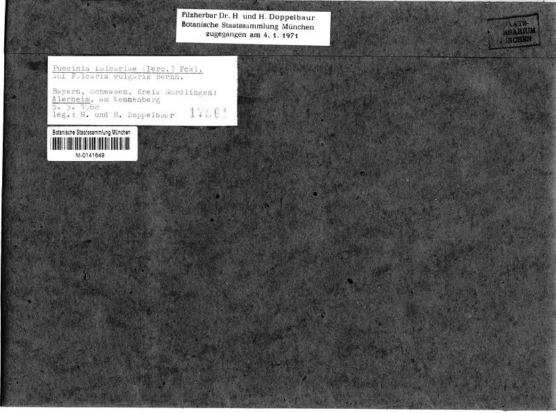 Sporen: Aecidiosporen polyedrischkugelig bis ellipsoidisch, 21—25 ju- lang, 14—20 µm breit, gelblich, dünnwandig, fein- und dichtwarzig. Teleutosporenlager auf beiden Blattseiten, vorwiegend aber auf der unteren, zerstreut, klein, punktförmig, selten zusammenfliessend, lange von der Epidermis bedeckt, schliesslich nackt, staubig, schwarzbraun. Teleutosporen ellipsoidisch, eiförmig oder eiförmiglänglich, am Scheitel abgerundet, nicht oder kaum verdickt, in der Mitte nur leicht eingeschnürt, am Grunde abgerundet oder zuweilen etwas verschmälert, 28—45 µm lang, 18—26 µm breit, glatt, braun, mit farblosem, kurzem, zartem, abfallendem Stiel. Keimporen ohne oder mit unbedeutender Papille, am Scheitel, bez. mehr oder weniger dem Stielansatz genähert.