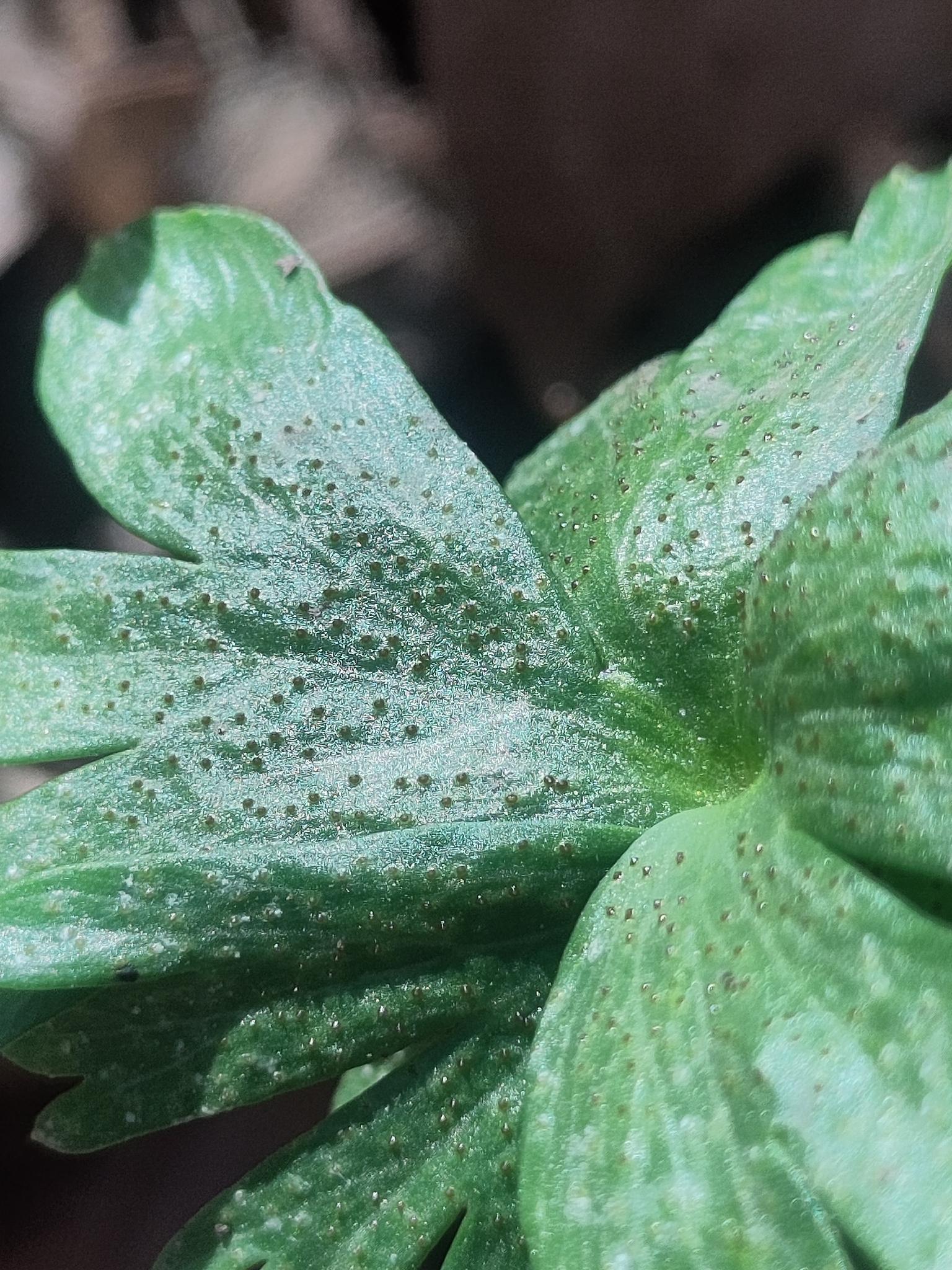 Fruchtkörper: Pykniden braun, auf beiden Blattseiten zerstreut, Aecidien über die ganze Blattunterseite verteilt, zerstreut, niedrig, mit ziemlich breitem, zurückgeschlagenem, zerschlitztem Rande.