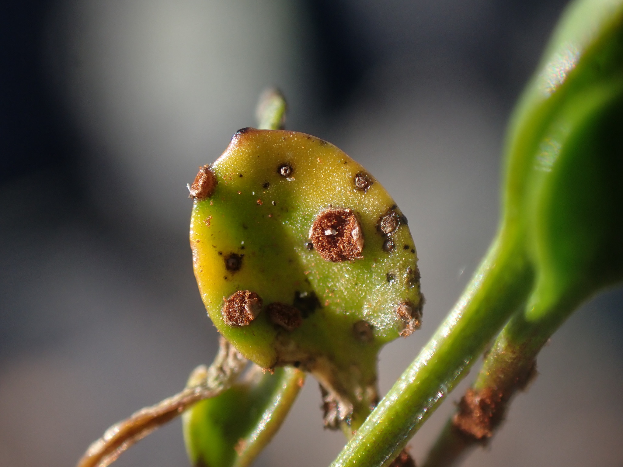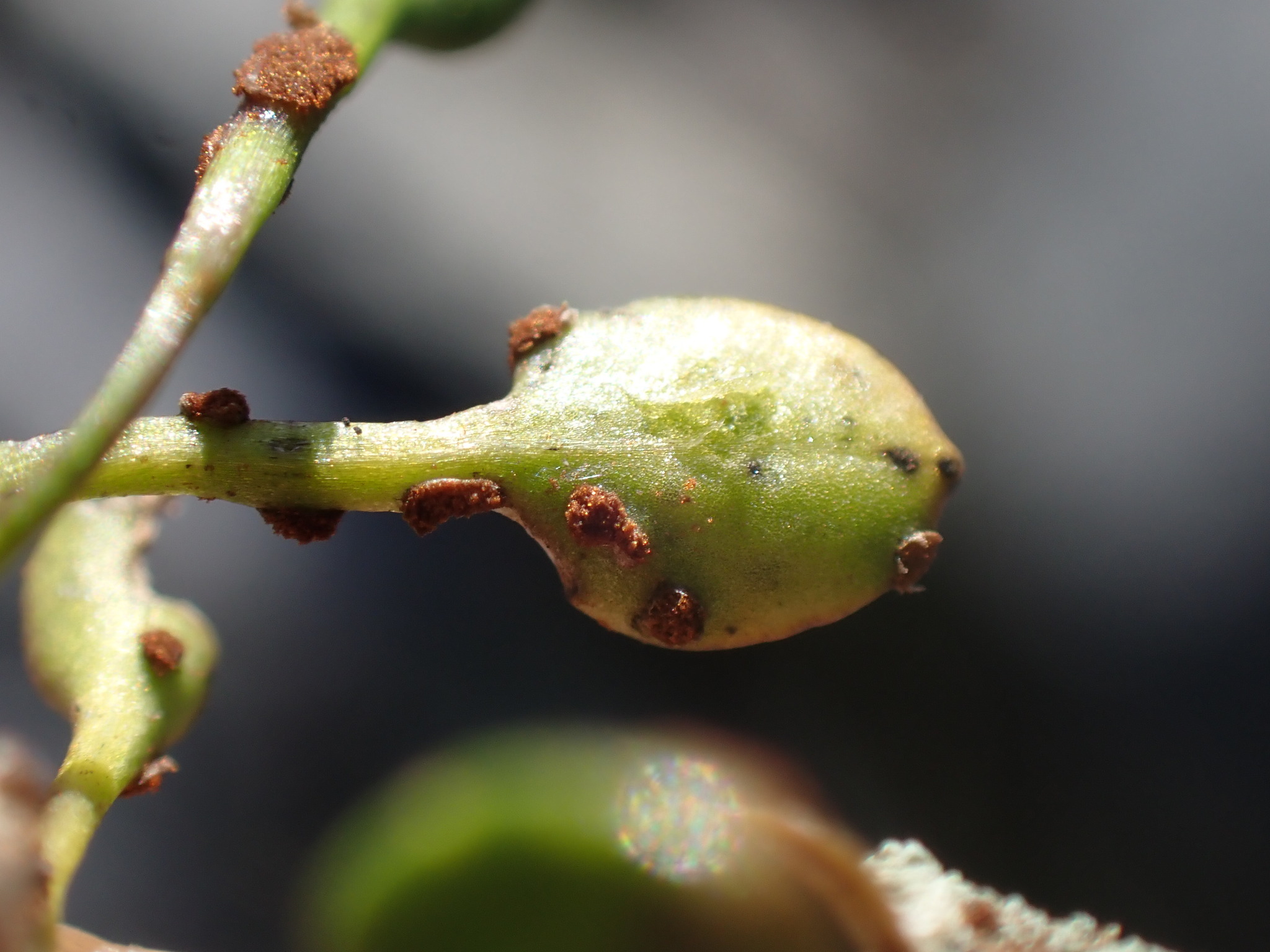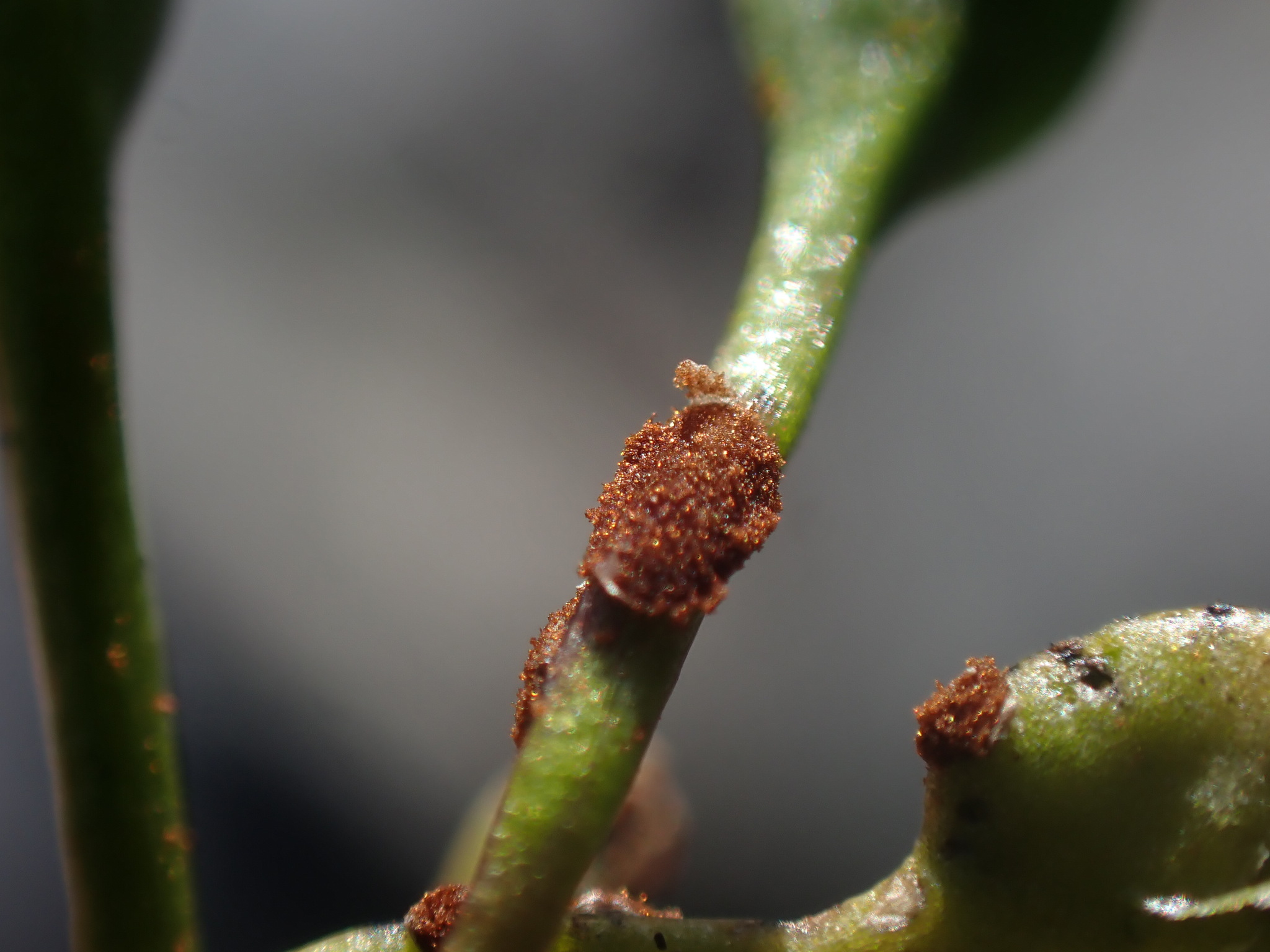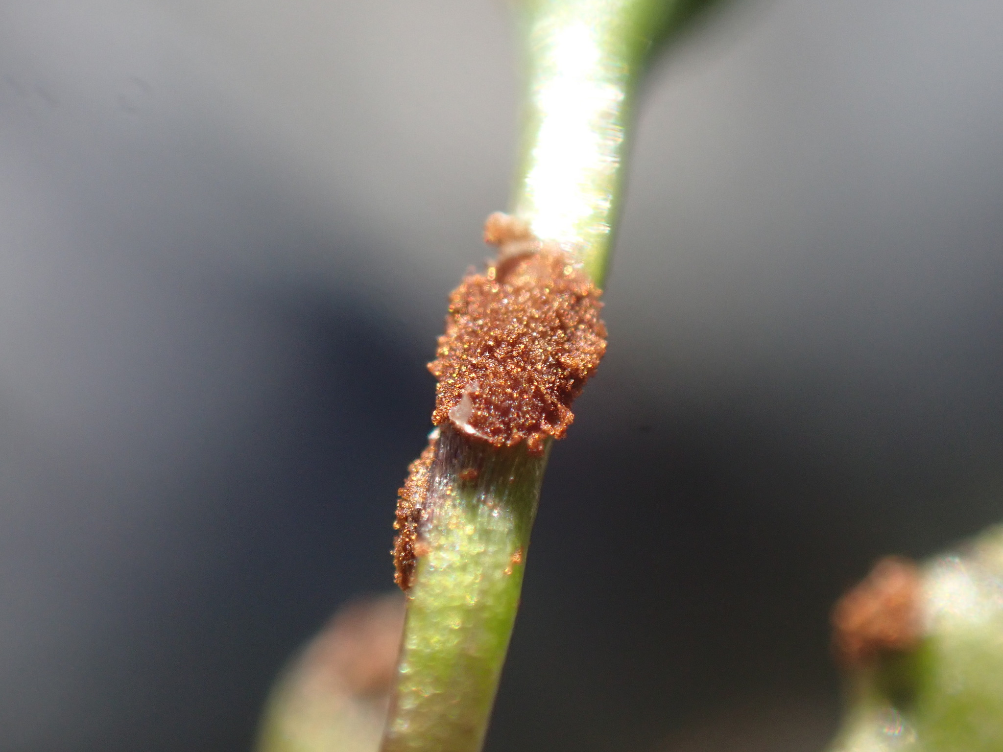 Fruchtkörper: Teleutosporenlager auf beiden Blattseiten, auch an den Blattstielen, zerstreut oder gehäuft, mitunter zusammenfliessend, 1—3 mm im Durchmesser, rundlich oder unregelmässig, bald nackt, staubig, rotbraun.