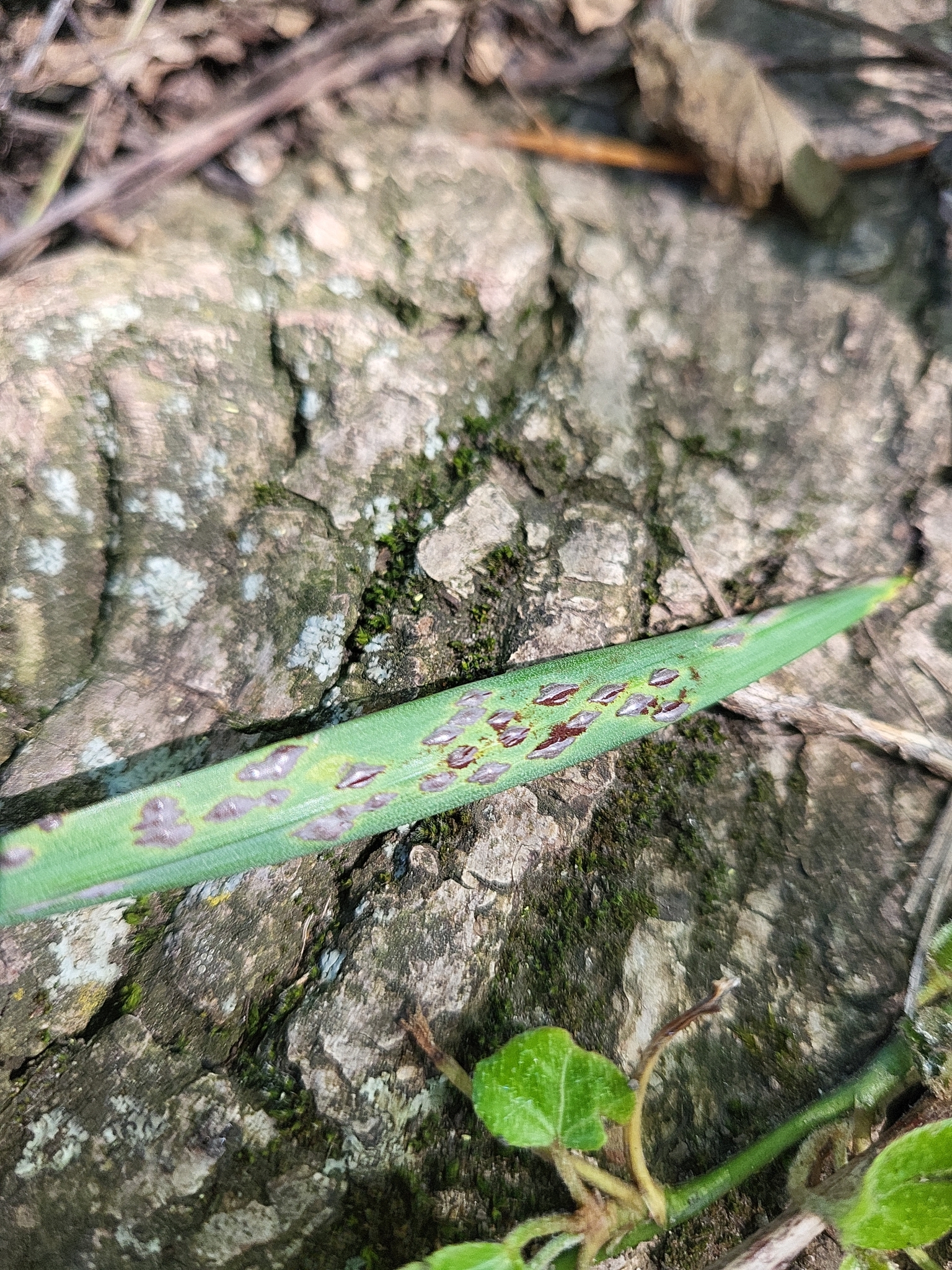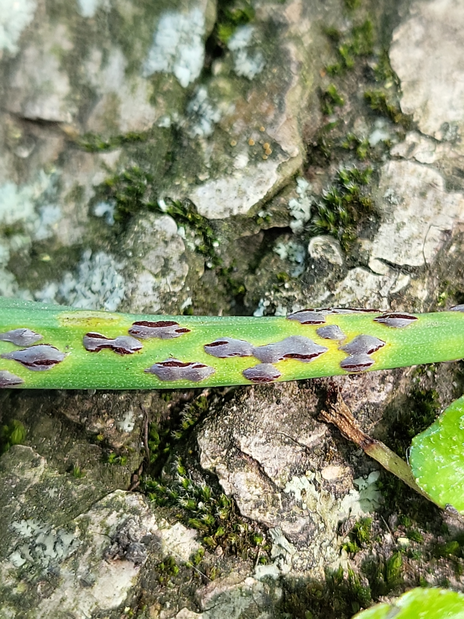Fruchtkörper: Teleutosporenlager elliptisch bis fast linear, bis etwa 3 mm lang und bis 1 mm breit, anfangs von der später durch einen Längsspalt aufreissenden Epidermis bedeckt, braun, pulverig.