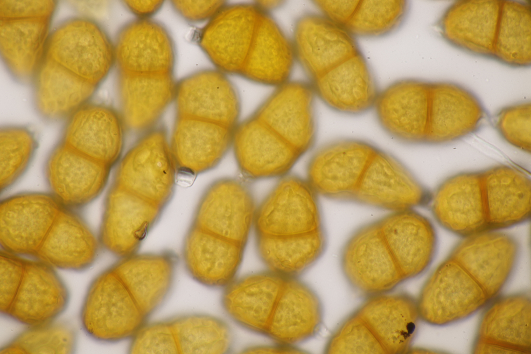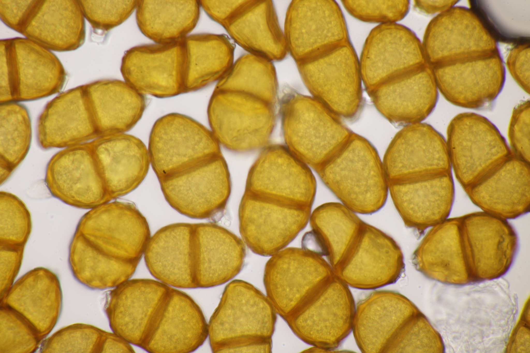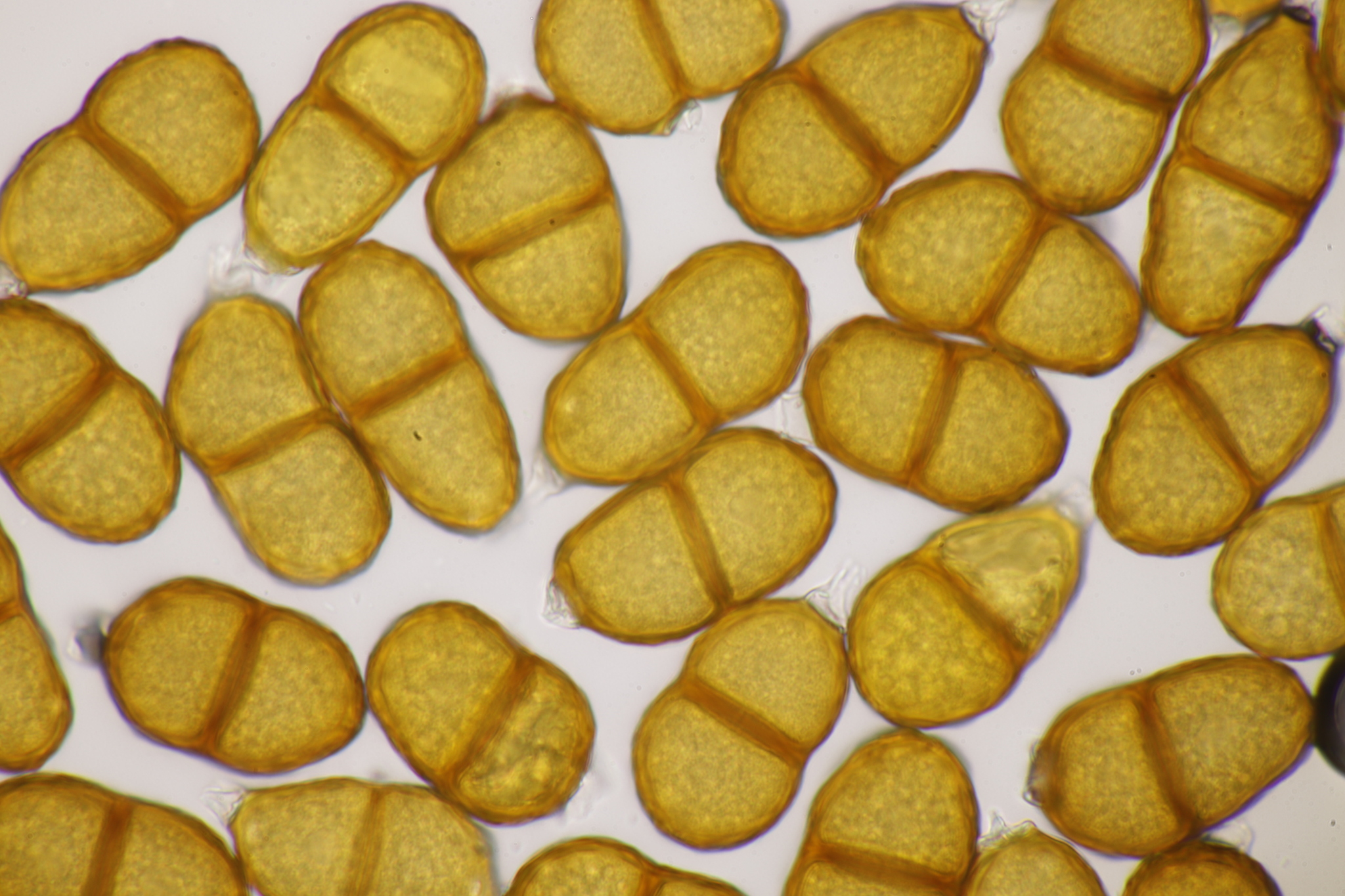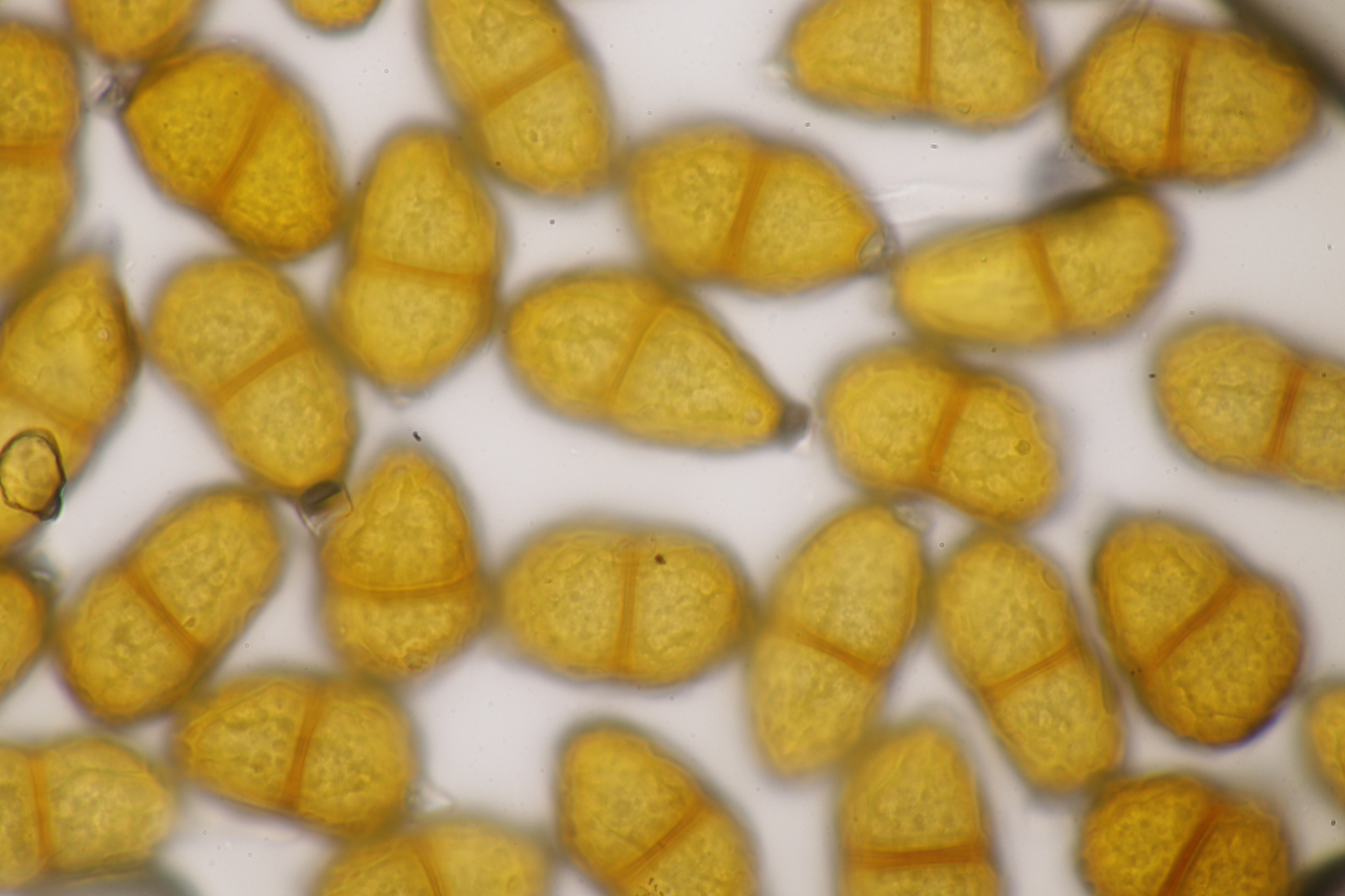 Sporen: Teleutosporen ellipsoidisch, am Scheitel und an der Basis gerundet, an der Grenze beider Zellen kaum oder gar nicht eingeschnürt, 42—56 fj. lang, 28—32 µm dick, beide Zellen in Länge und Dicke ungefähr gleich. Membran dick (3—4 _«), gelbbraun, mit mehr oder weniger geschlängelten Längsleisten besetzt, die sich mitunter in einzelne Wärzchen auflösen oder anastomosieren und ein weitmaschiges Netz bilden können. Keimporus der oberen Zelle scheitelständig, der der unteren nahe dem Stielausatz, beide ohne oder mit sehr schwacher Papille. Nicht selten einzellige Sporen.