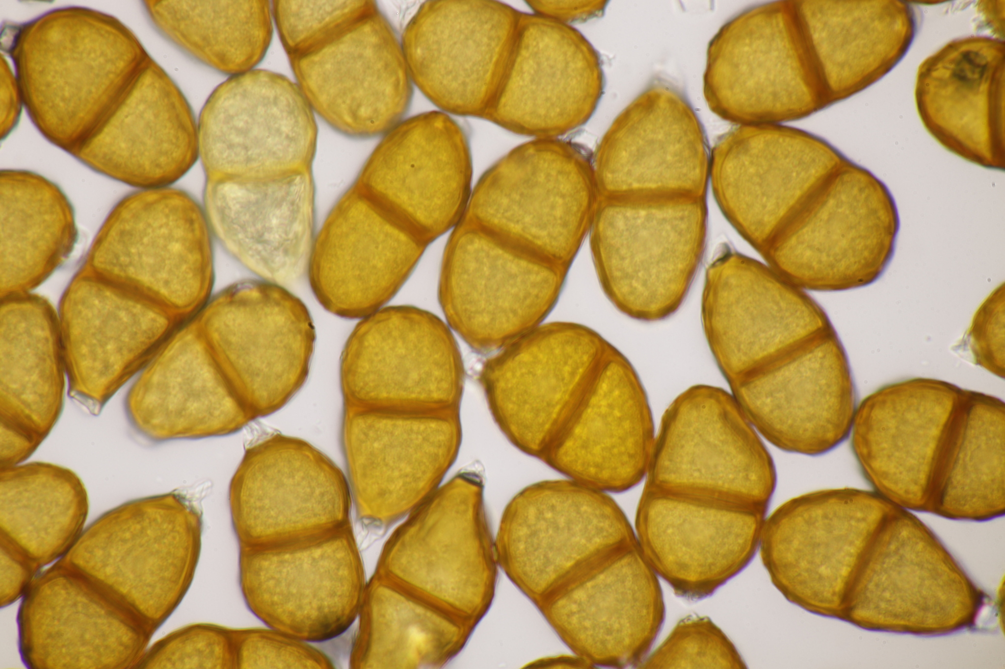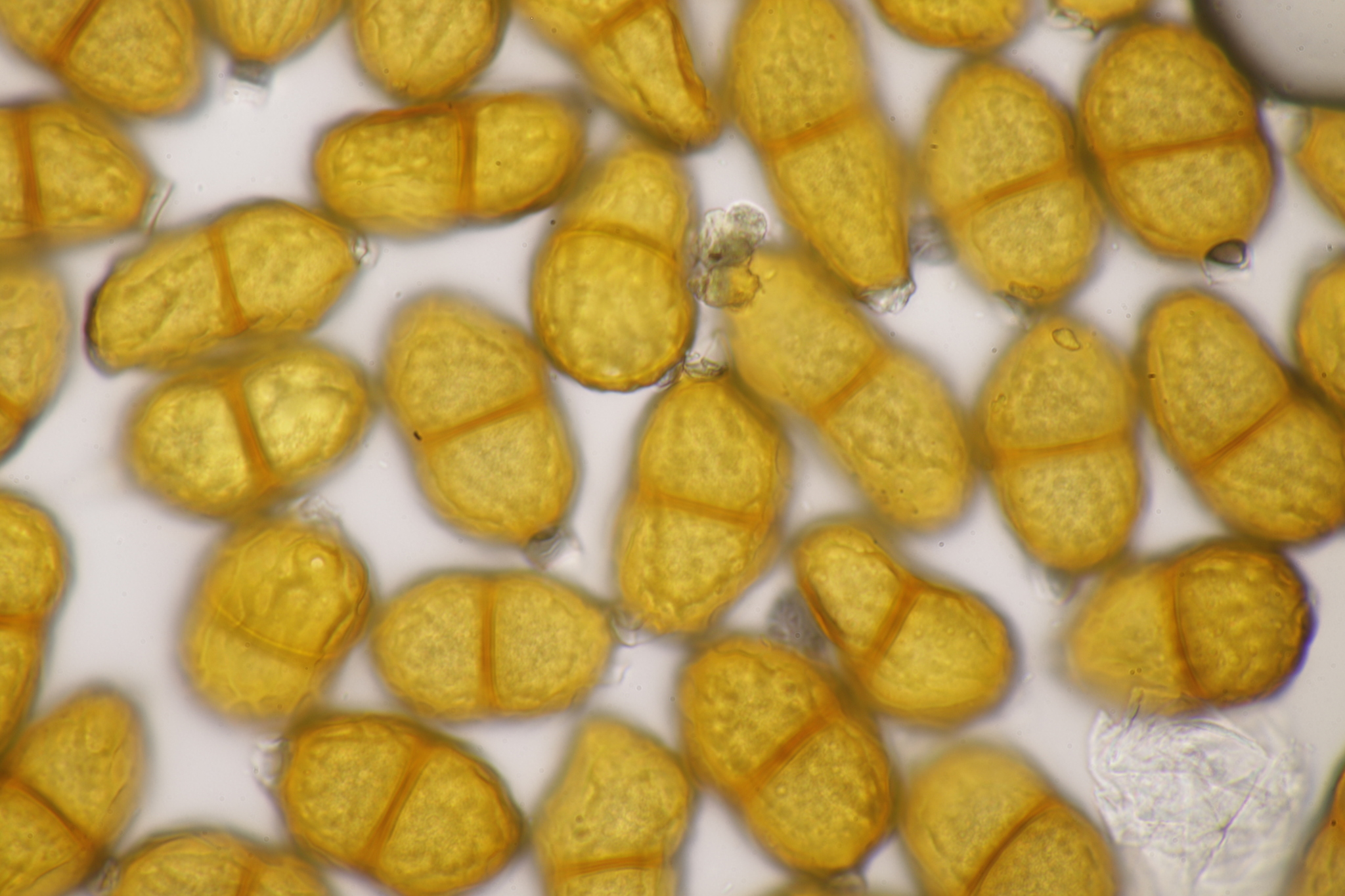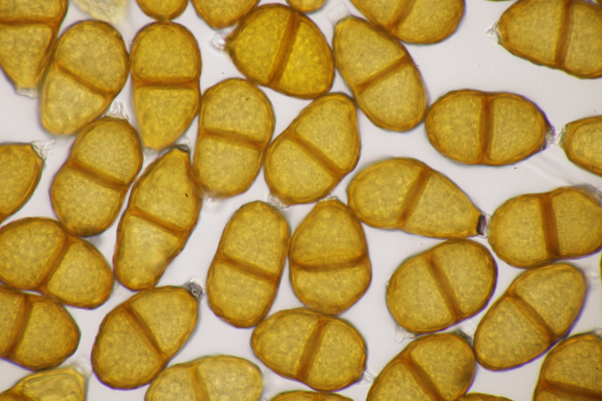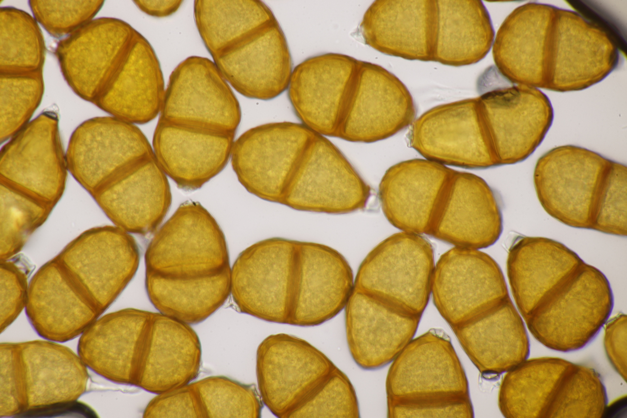 Sporen: Teleutosporen ellipsoidisch, am Scheitel und an der Basis gerundet, an der Grenze beider Zellen kaum oder gar nicht eingeschnürt, 42—56 fj. lang, 28—32 µm dick, beide Zellen in Länge und Dicke ungefähr gleich. Membran dick (3—4 _«), gelbbraun, mit mehr oder weniger geschlängelten Längsleisten besetzt, die sich mitunter in einzelne Wärzchen auflösen oder anastomosieren und ein weitmaschiges Netz bilden können. Keimporus der oberen Zelle scheitelständig, der der unteren nahe dem Stielausatz, beide ohne oder mit sehr schwacher Papille. Nicht selten einzellige Sporen.