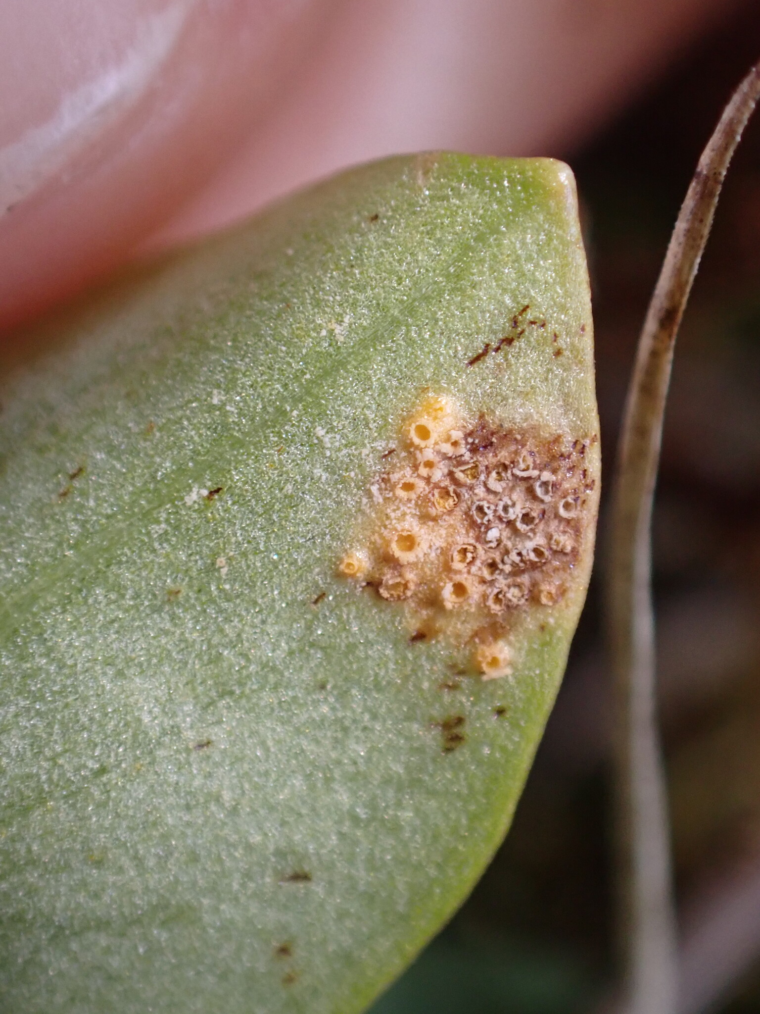 Sporen: Aecidiosporen kugehg-eckig, 14—18 µm im Durchmesser, feinwarzig, orangegelb. Uredosporenlager auf beiden Blattseiten zerstreut, sehr klein, rundlich oder länglich, staubig, gelbbraun. Uredosporen kugelig bis eiförmig, 21 bis 25 µm im Durchmesser, stachelig, braun, mit drei Keimporen. Teleutosporenlager zerstreut, auf beiden Blattseiten, stellenweise dichter, klein, punktförmig, rundlich oder länglich, polsterförmig, fest, schwarz. Teleutosporen länglich oder länglich- keulenförmig, am Scheitel abgerundet und bis 8 µm verdickt, in der Mitte leicht eingeschnürt, am Grunde abgerundet oder verschmälert, 30—38 µm lang, 12—18 µm breit, glatt, kastanienbraun, am Scheitel dunkler, mit fast farblosem, festem, bis 32 µm langem Stiel.