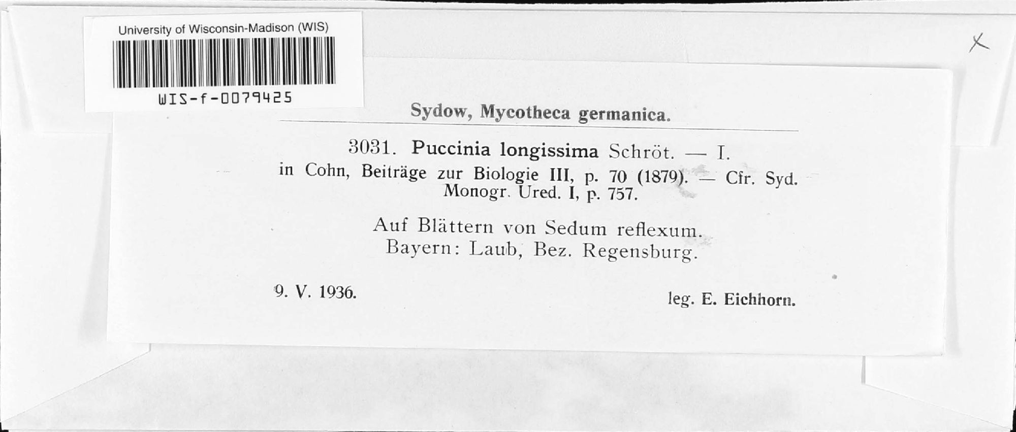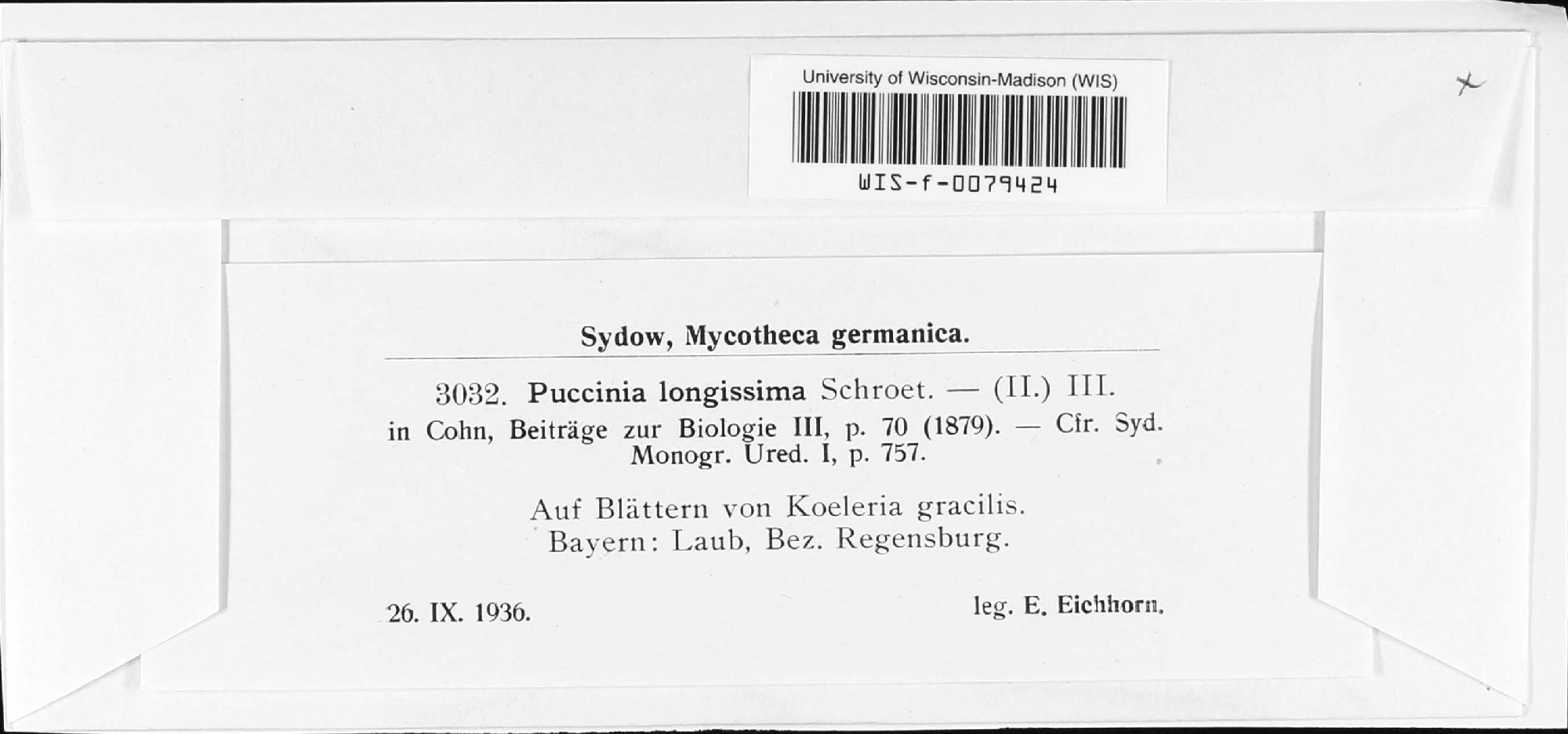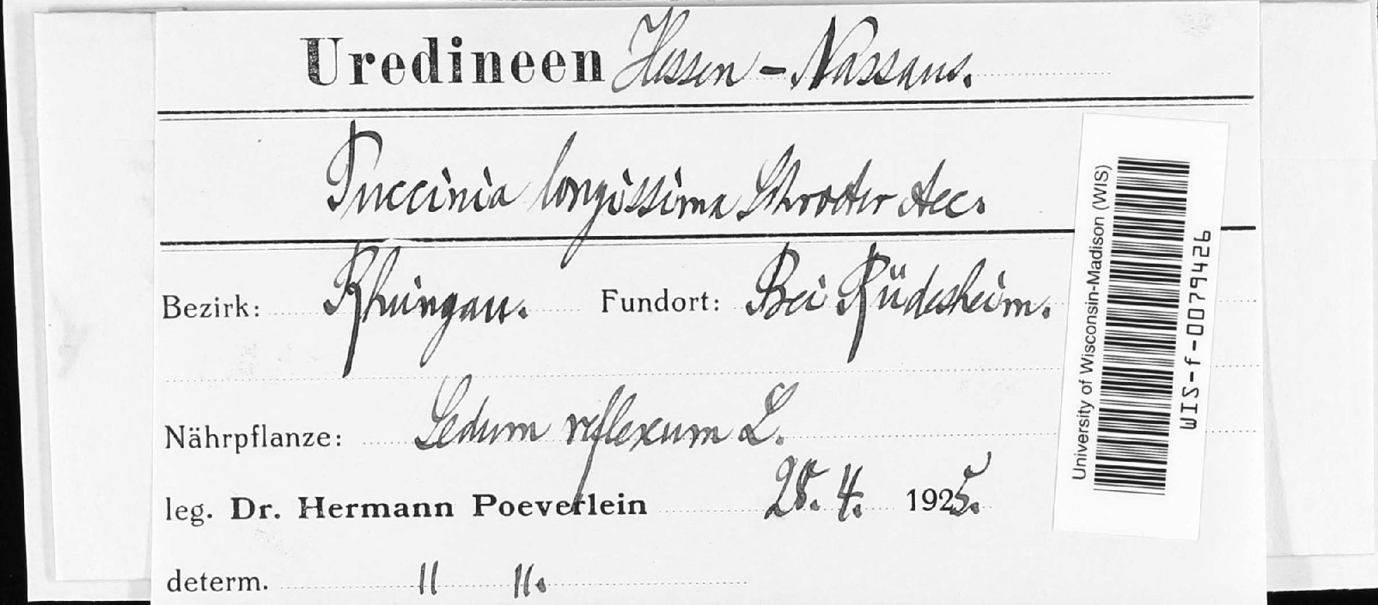 Sporen: Aecidiosporen kugelig, fast kugelig oder ellipsoidisch, meist vieleckig, 22—32 µm lang, 18—31 µm breit, fein- und dichtwarzig, orangerot. Uredosporenlager meist blattoberseits auf gelblichen oder rotbräunlichen, unscharfen Flecken, linear oder strichförmig, oft der Länge nach zusammenfliessend, bald nackt, aber von der gesprengten Epidermis umgeben, staubig, rostbraun. Uredosporen kugelig bis breit eiförmig, 22—40 µm lang, 18—33 µm breit, feinstachelig, blass orangebräunlich, mit zahlreichen Keimporen. Teleutosporenlager auf braunen oder rotbraunen Flecken, linear oder strichförmig, oft der Länge nach zusammenfliessend und dann zuweilen bis 8 mm lang, von der gesprengten Epidermis umgeben und teilweise bedeckt, ziemlich fest, schwarz. Teleutosporen verschiedengestaltig, meist keulenförmig oder fast spindelförmig, seltener länglich- ellipsoidisch, am Scheitel abgerundet, seltener gestutzt oder leicht verjüngt, stark, 5—11 µm verdickt und dunkler, in der Mitte leicht eingeschnürt, am Grunde in den Stiel verschmälert, glatt, blassbraun, 55—120 µm lang, 14—26 µm breit, mit dickem, bleibendem, kurzem, bis 20 fn langem Stiel.