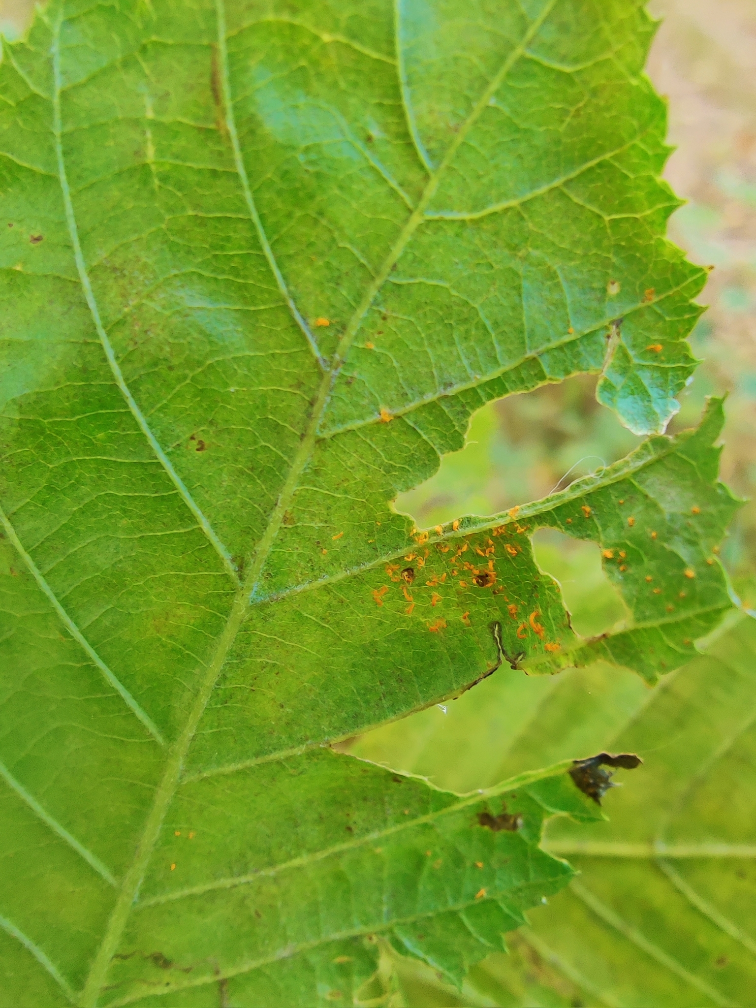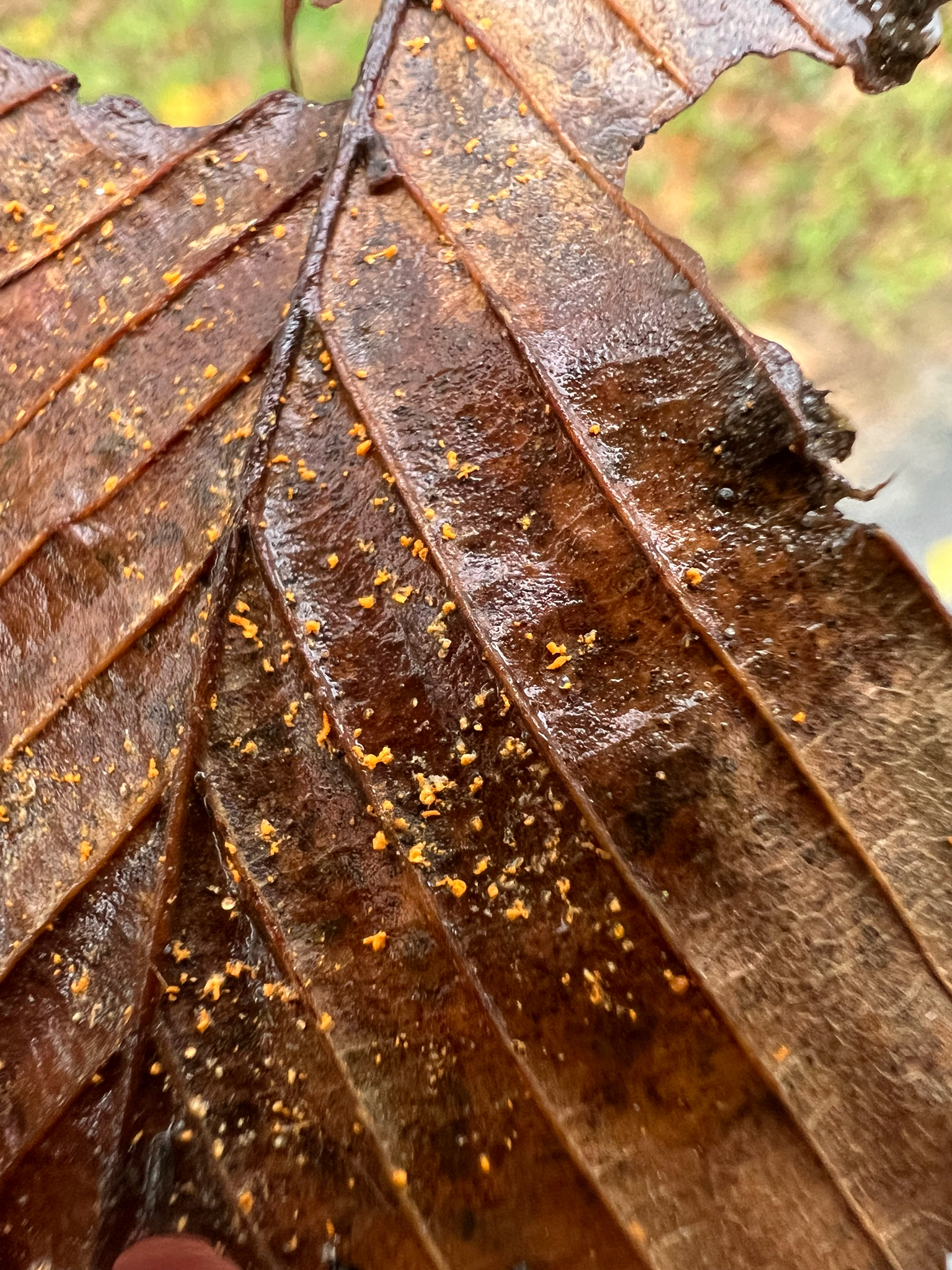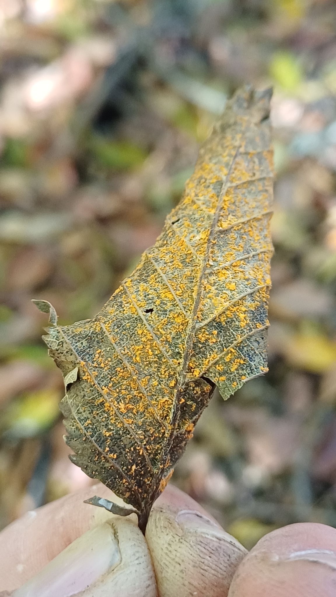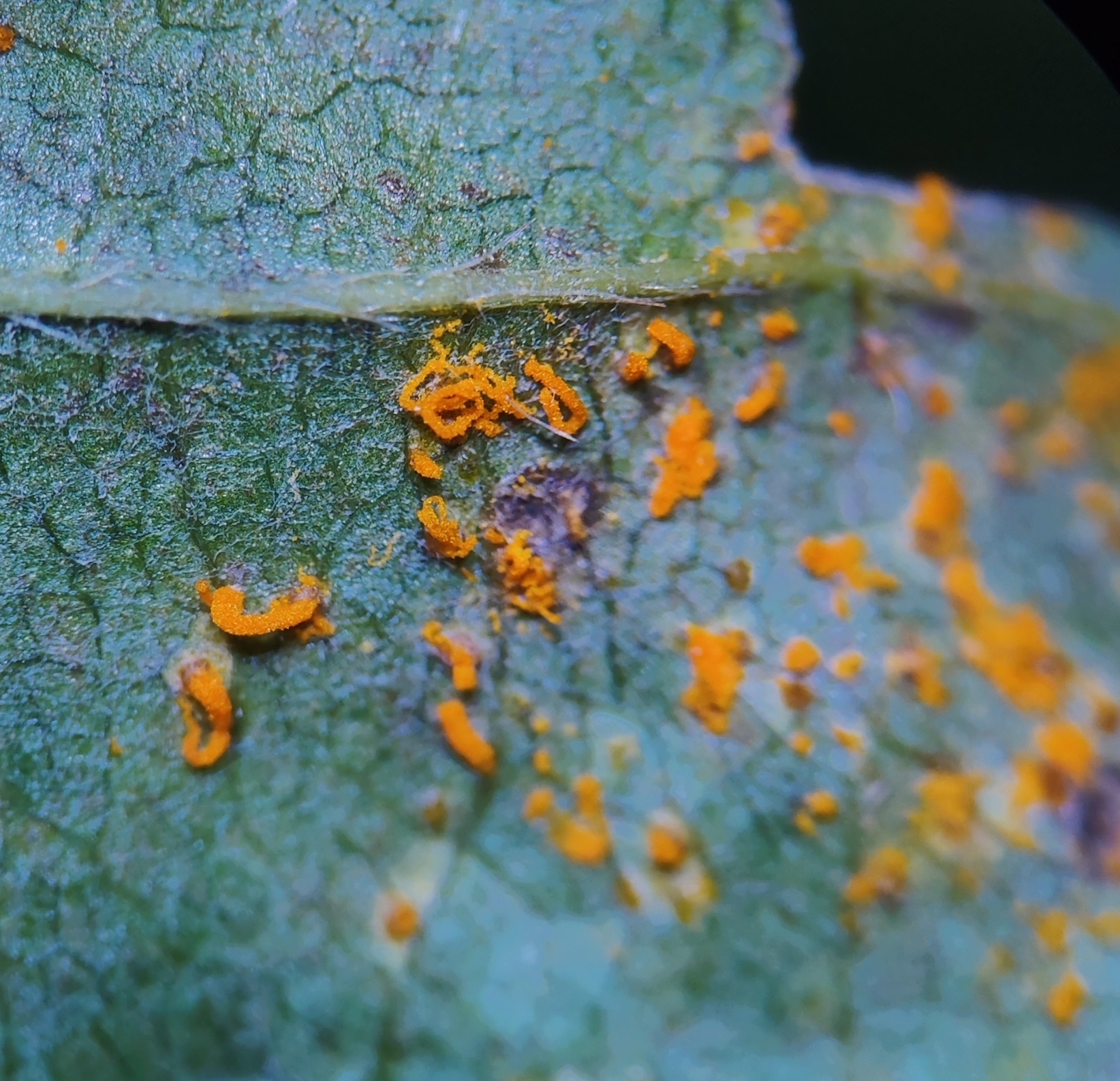 Fruchtkörper: Uredosporenlager auf der Unterseite gelber Blattflecken, die von den Adern begrenzt werden, klein, von einer kuppeiförmig gewölbten, zuletzt mit einem meist scheitelständigen Loch sich öffnenden Peridie bedeckt.
