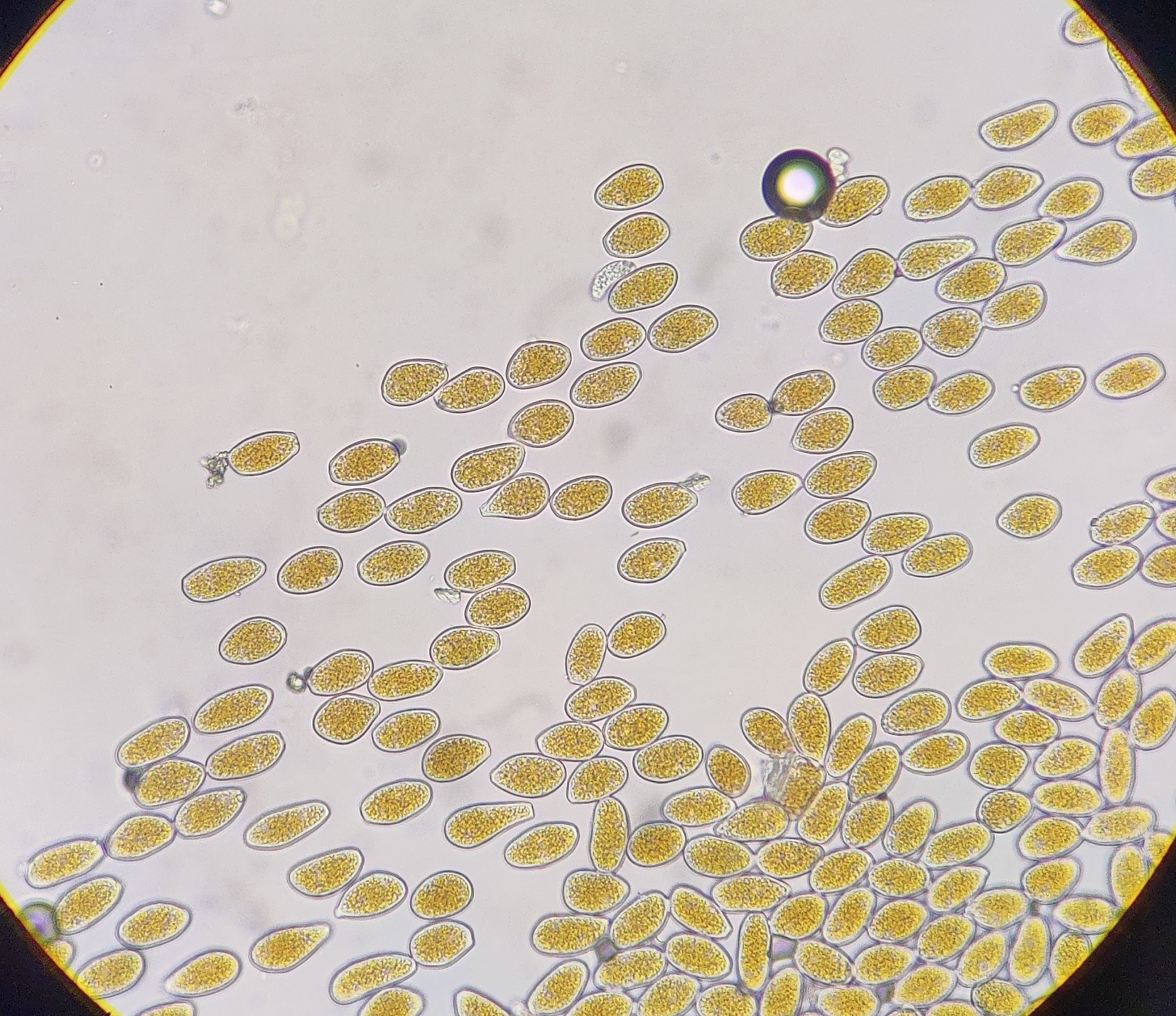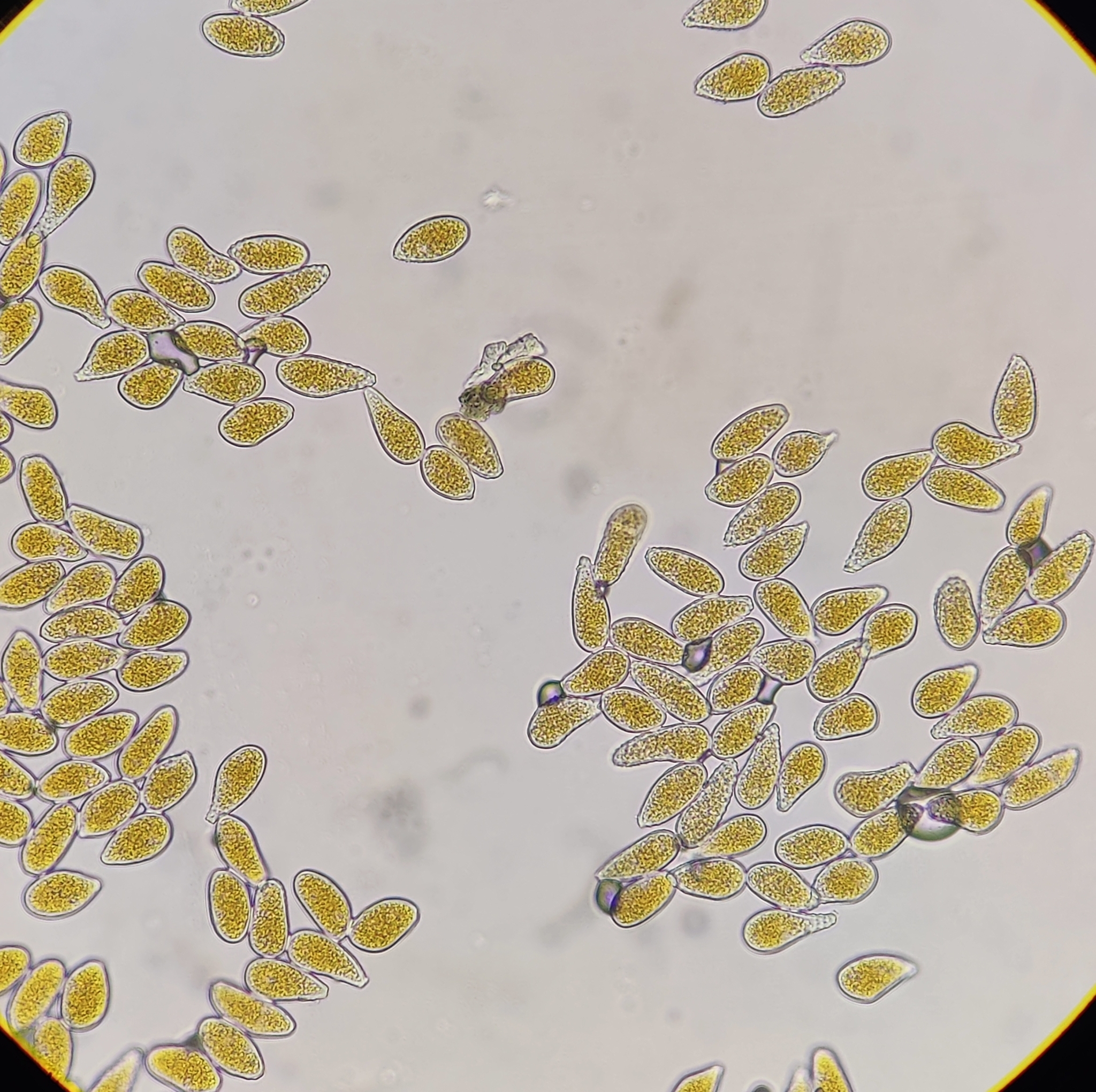 Sporen: Uredosporen länglich bis schwach keulen- oder birnförmig, 21—28 µm lang, 10—14 µm dick, mit bis 2 µm dicker, oben glatter, sonst mit ziemlich locker stehenden Stachelwarzen besetzter Membran. Teleutosporen läger zerstreut, rundlich oder unregelmässig eckig, klein, flachgewölbt, gelblich, später gelbbräunlich. Teleutosporen länglich oder kurz keulenförmig, einzellig, im Querschnitt vieleckig, zwischen den Zellen, hellgelbbräunlich, bis 35 µm lang, bis 14 µm dick. —