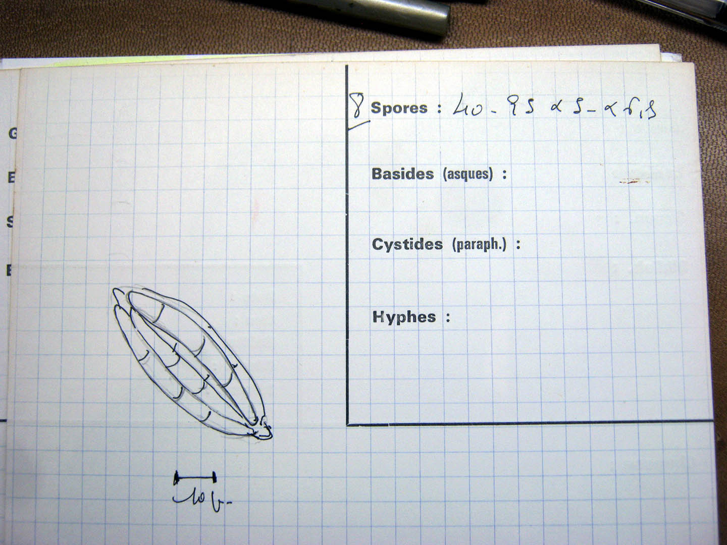 Sporen: Asci breit eiförmig, nach beiden Enden hin verjüngt, fast stiellos, 50—60 µm lang, 20—26 µm dick, sechs- bis achtsporig. Sporen dicht zusammengehäuft, schmal lanzettlich, gekrümmt sichelförmig, vierzellig, hyalin, 40—50 µm lang, 5—7 µm dick.