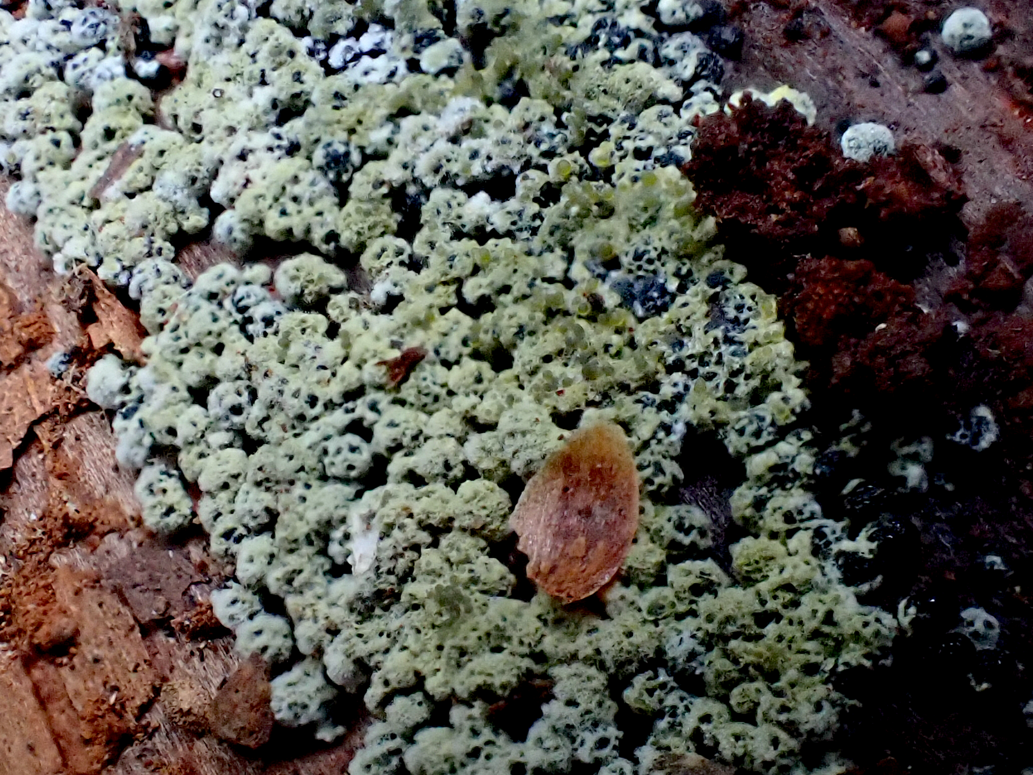 Fruchtkörper: Perithecien gesellig, ganz oberflächlich und frei, kegelförmig, unter der Mitte etwas erweitert, nach oben verjüngt, gelbgrün, später braun, ca. 0,4—5 mm hoch, 0,3 mm breit.