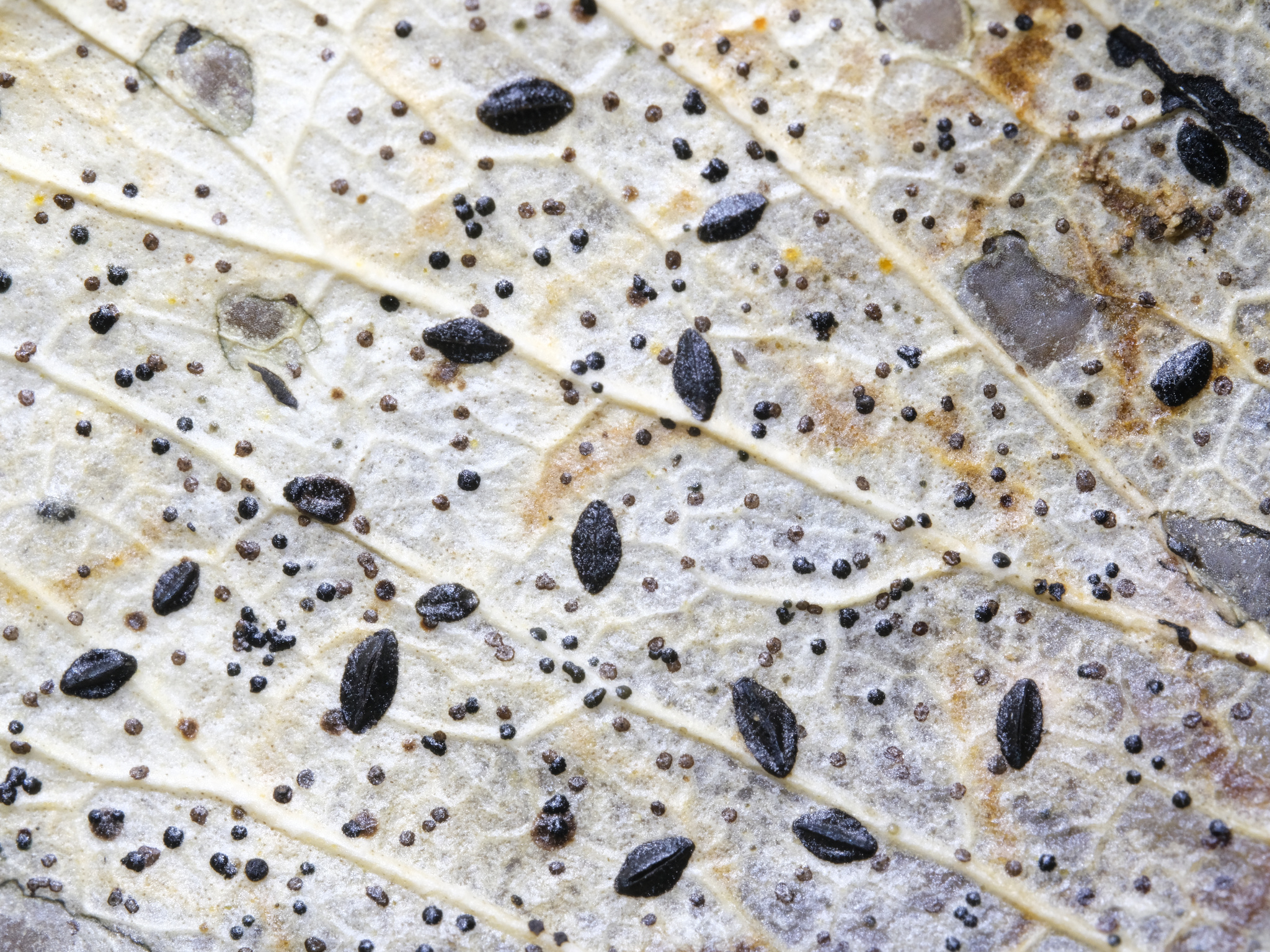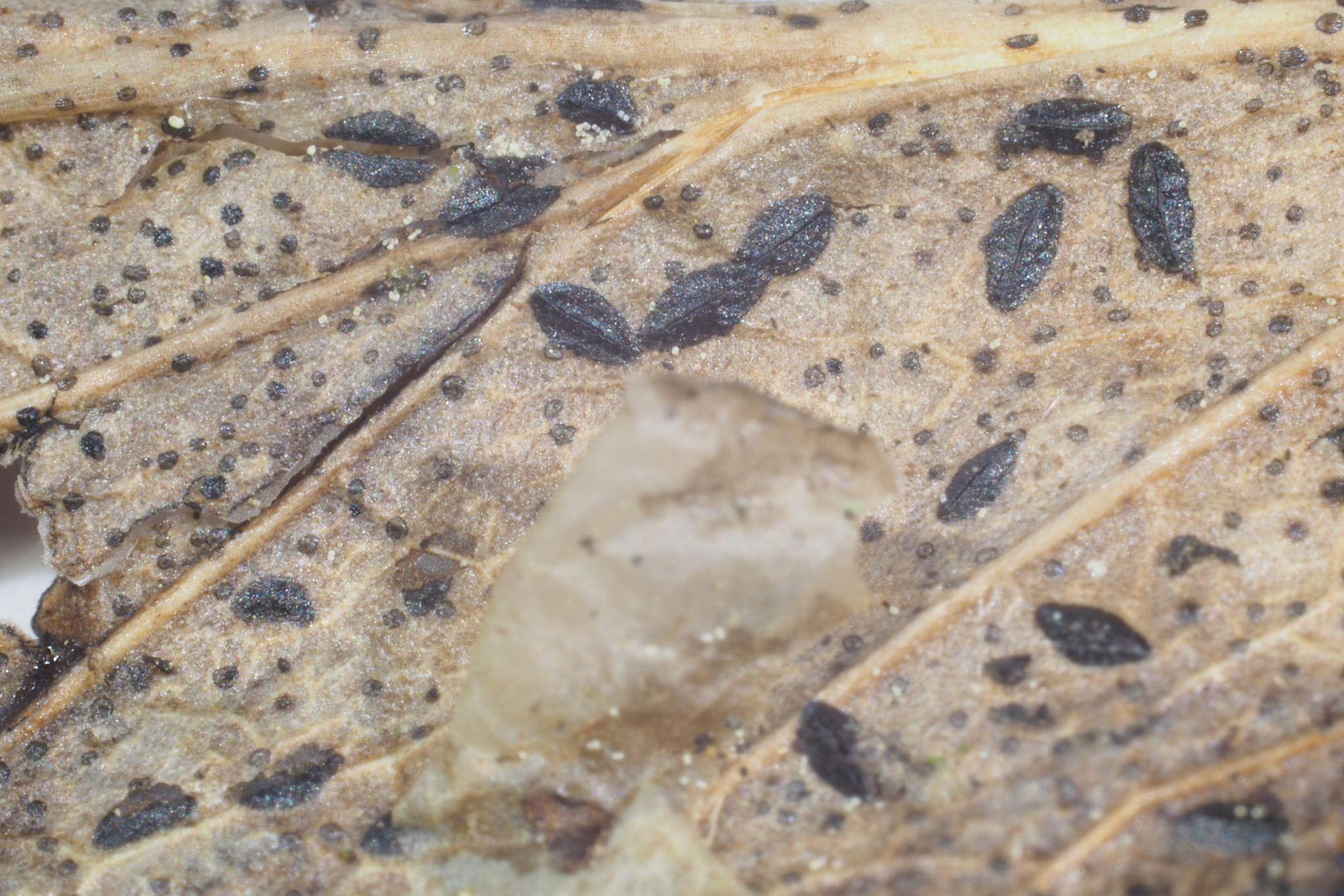 Fruchtkörper: Apothecien zerstreut, auf grossen, verblassten Blattstellen, eingewachsen, gewölbt hervortretend, elliptisch, stumpf, einfach, oben schwarz, glänzend oder schwach längsgestreift, mit zarten Längsspalt und meist eng aneinanderliegenden, später weisslich gefärbten und etwas die gelbliche Fruchtscheibe entblössenden Rändern, 1—2 mm lang, 0,5 mm breit.