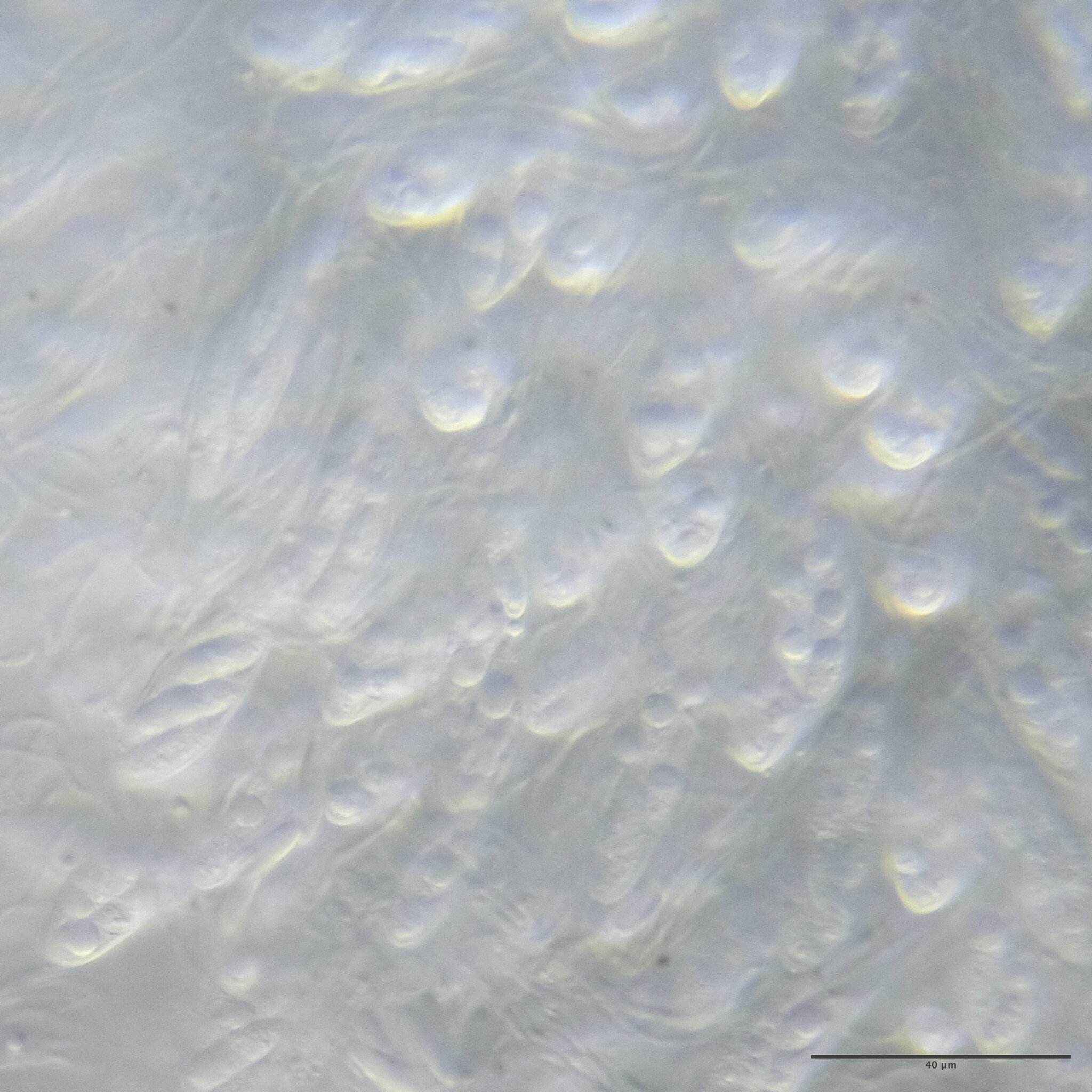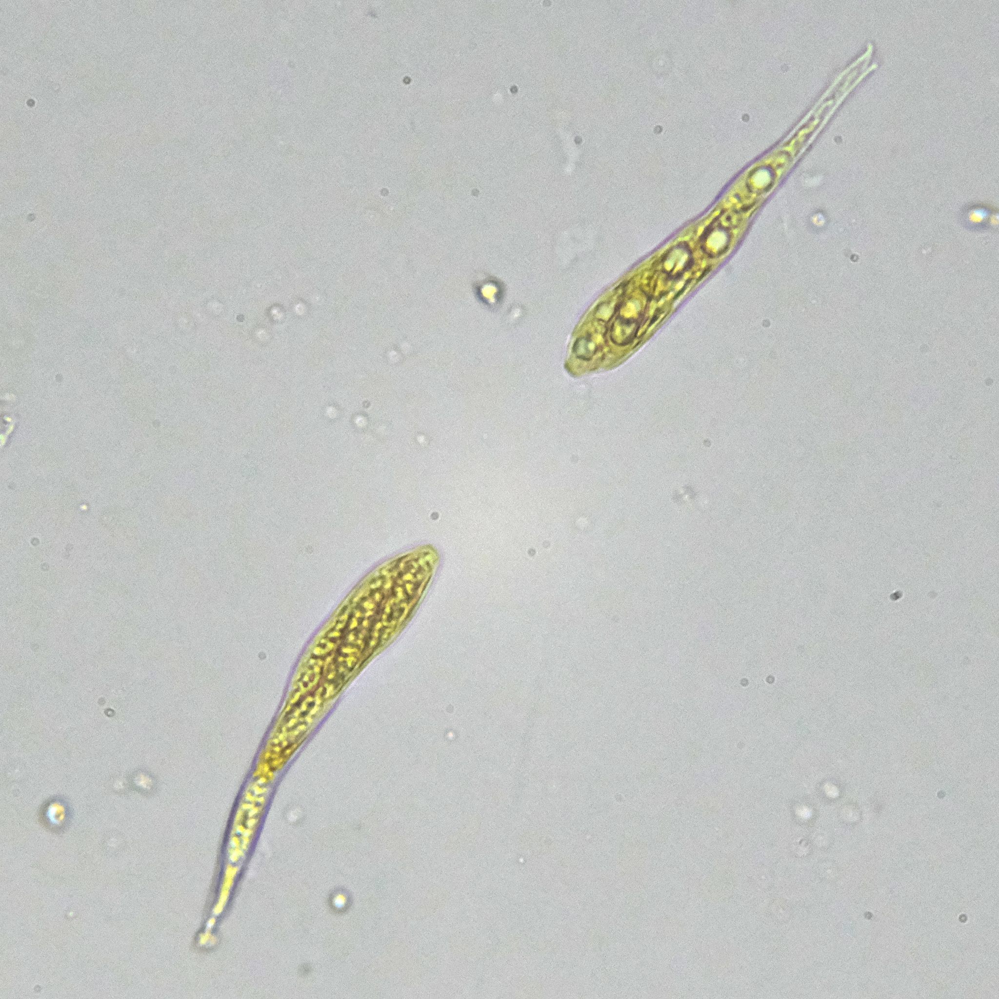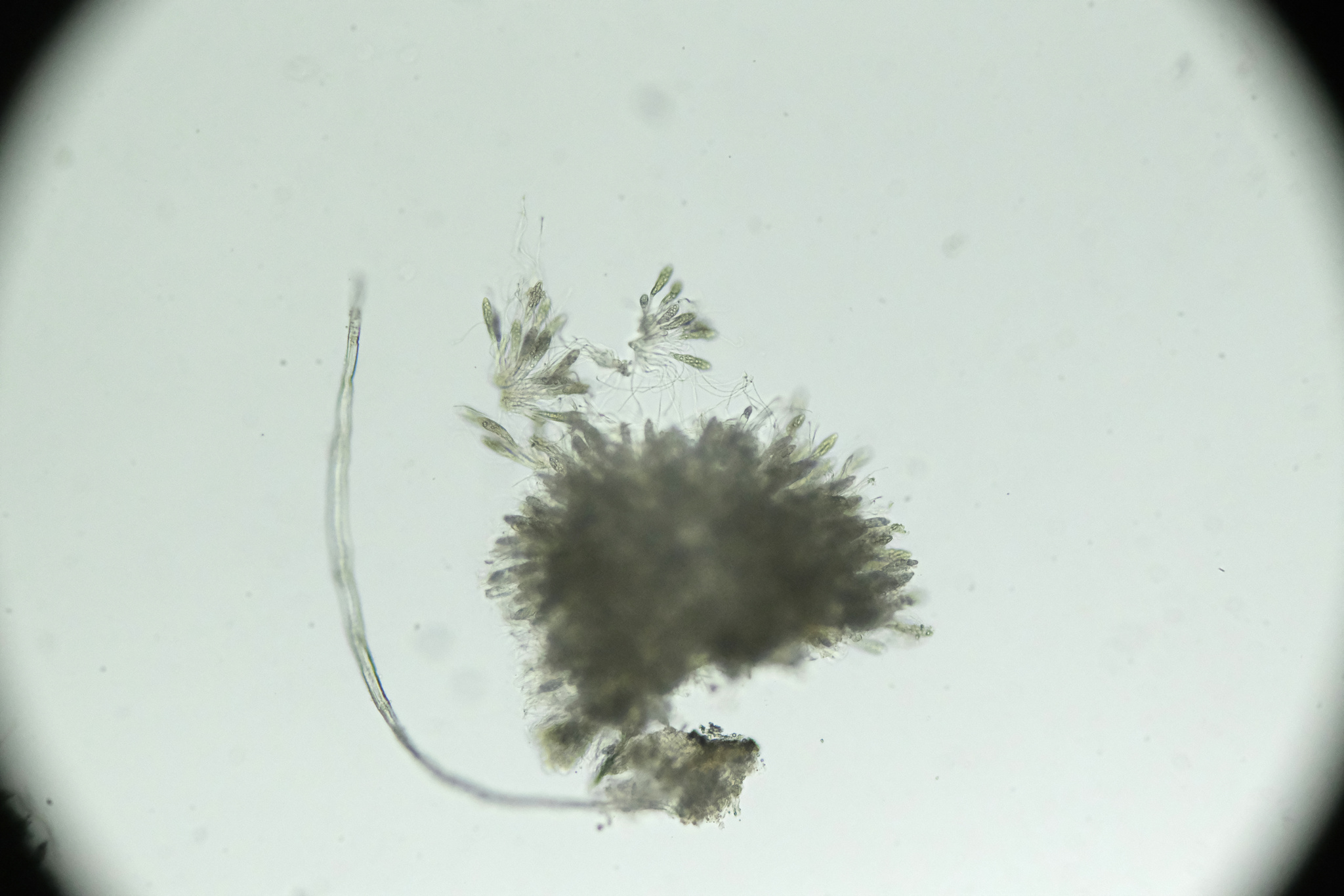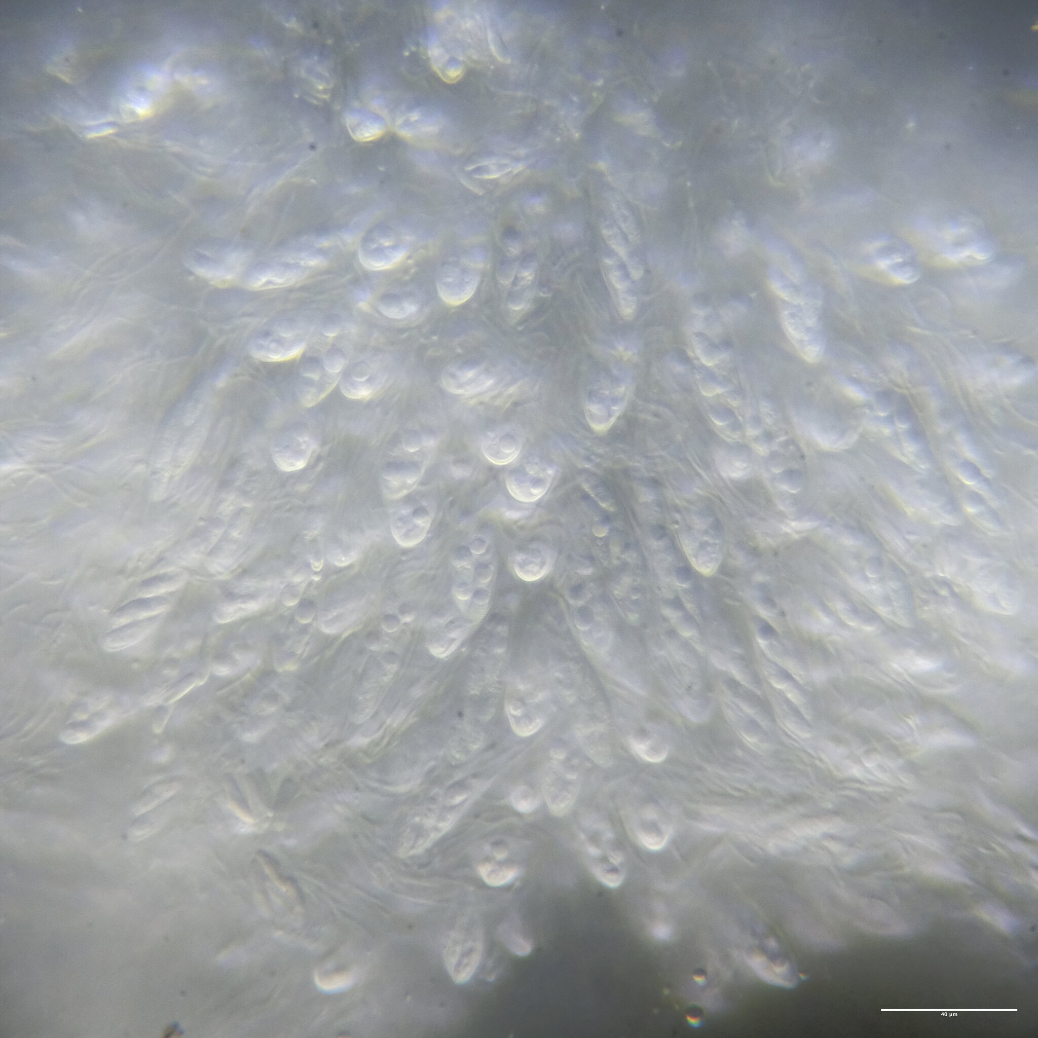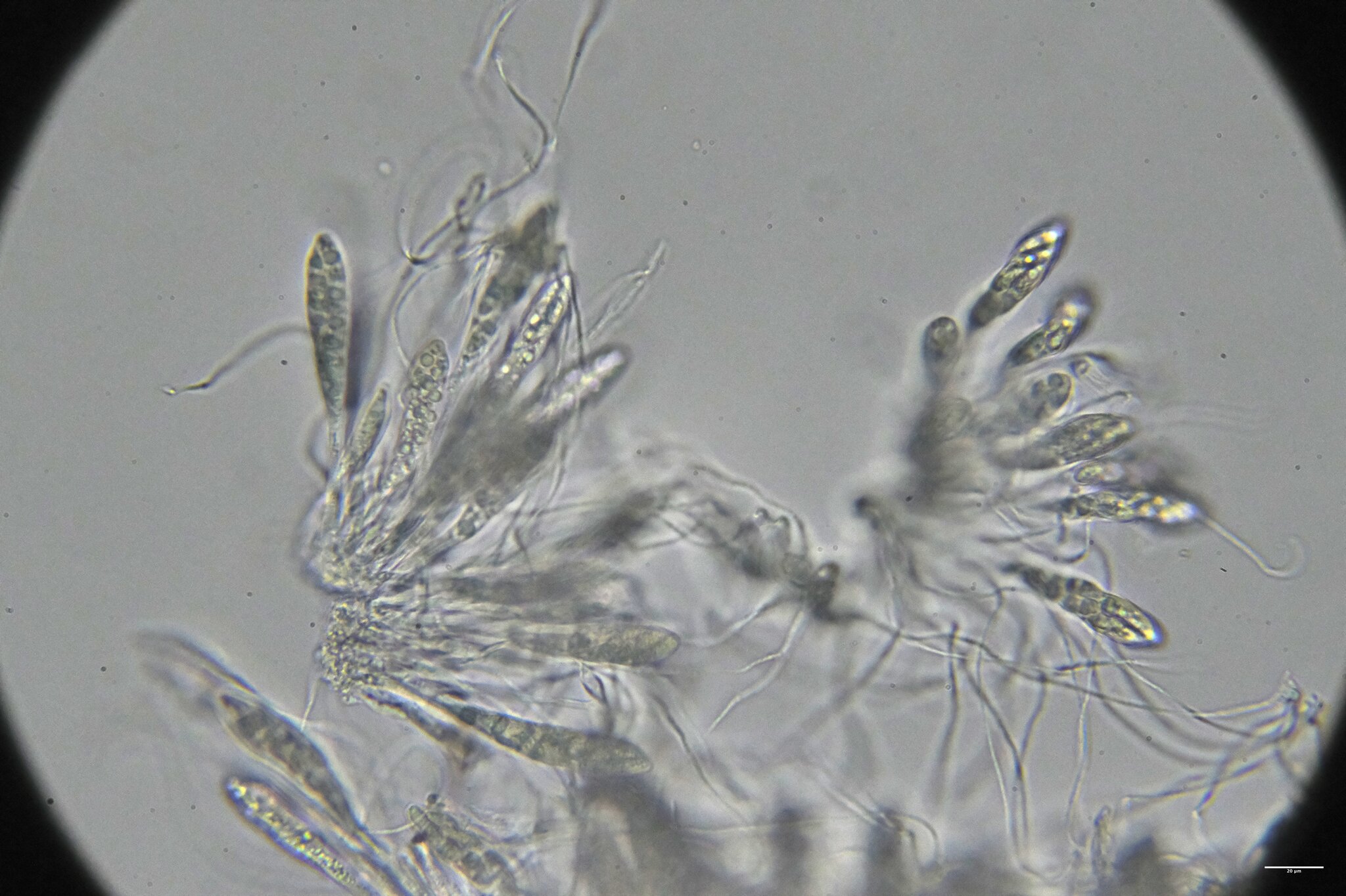 Sporen: Schläuche elliptischkeulig, oben etwas zugespitzt, in einen zarten, langen Stiel verschmälert, achtsporig, 90—100 µm lang, 15—17 µm breit. Sporen länglich, ziemlich stumpf, gerade, selten schwach gebogen, undeutlich zweizeilig, farblos, 15—17 jU lang, 4—5 µm breit, mehrreihig, im oberen Teile der Schläuche gelagert. Paraphysen fädig, oben hakig gebogen.