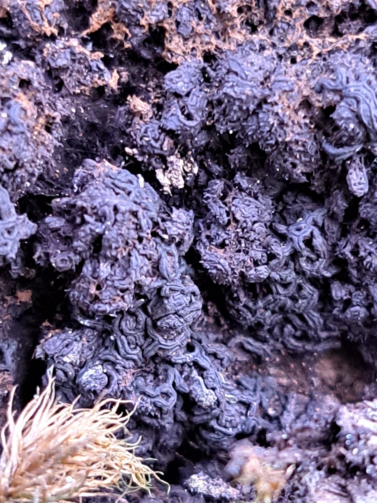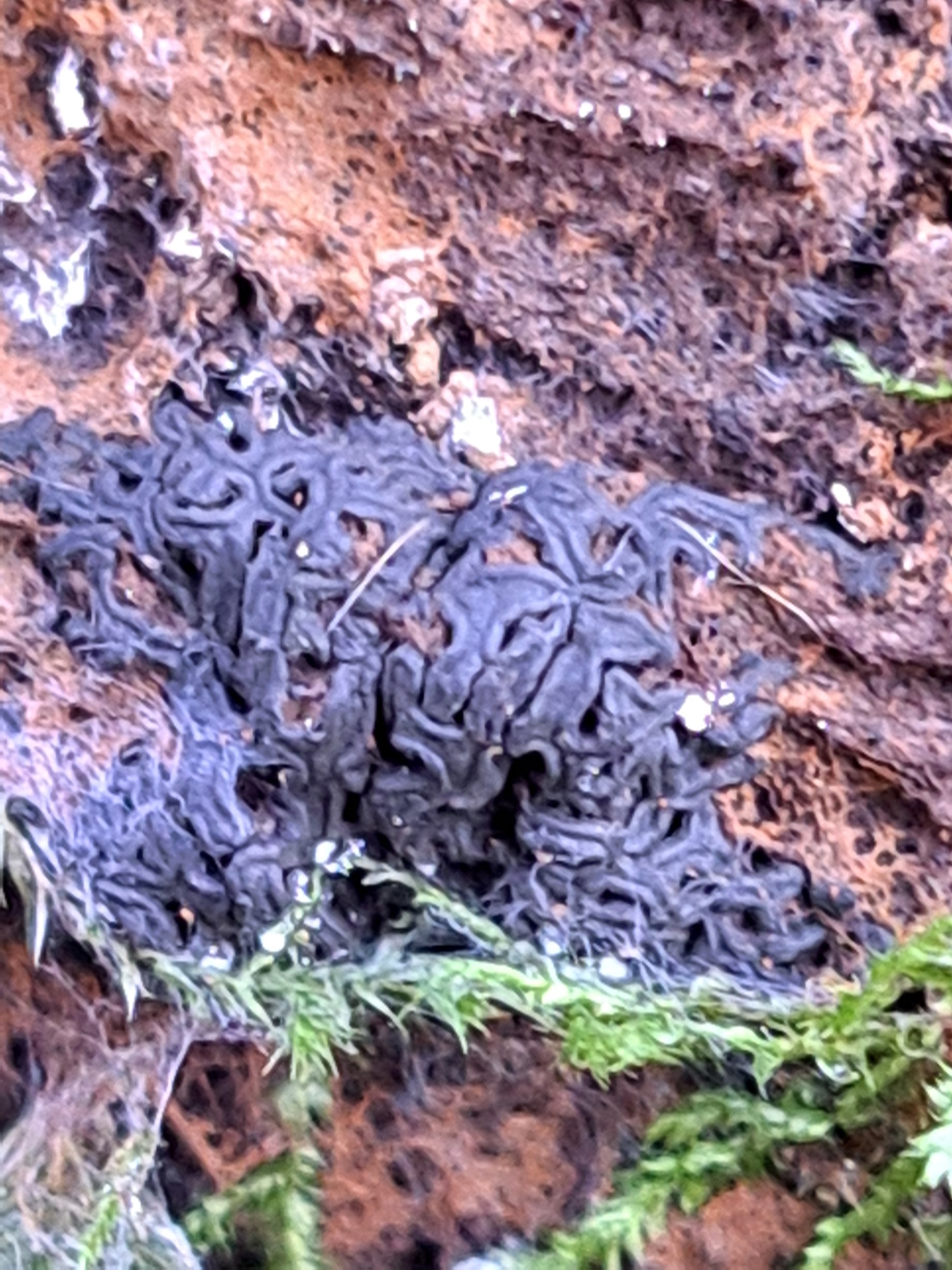 Fruchtkörper: Fruchtkörper gesellig, meist sehr dicht stehend, zwischen einem, aus verzweigten, dickwandigen, etwa 4 µm breiten Hyphen gebildetem, mehr oder weniger verbreiteten schwarzem Filze, linienförmig, oft gebogen und verzweigt oder sternförmig verwachsen, 1—3 mm lang, 0,3—0,6 mm breit. Perithecium mattschwarz, mit feinen Längsstreifen, mit glattem, linienförmigem Längsspalt aufbrechend.