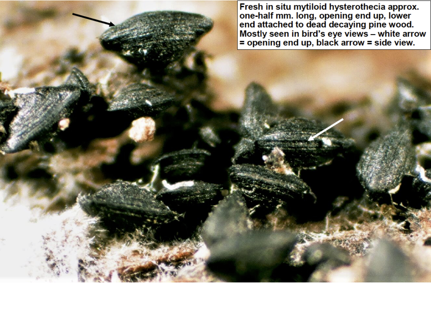 Fruchtkörper: Apothecien zerstreut oder meist gedrängt sitzend, kahn-, dann muscheiförmig, am Grunde etwas schmäler, gegen die ziemlich scharfe Schneide zusammengedrückt, an den Enden nicht besonders spitz, mehrfach zart längsgestreift, ziemlich glänzend schwarz, kohlig, 1—l,3 mm lang, 0,5 mm breit, bis 1 mm hoch.