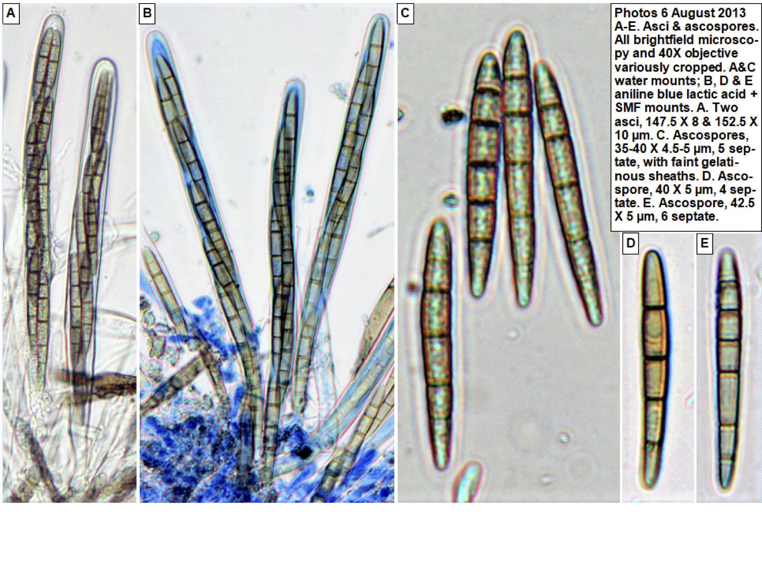 Sporen: Schläuche zylindrisch, mit Scheitelverdickung, 120—130 µm lang, 10—12 µm breit, achtsporig. Sporen verlängert spindelförmig oder keulig, stumpf, meist gerade, zuerst farblos, dann braun, zuletzt durch Querteilung achtzellig, 30 — 36 µm lang, 6 fn breit, zweireihig gelagert. Paraphysen ca. 1,5 µm breit, fädig, farblos.
