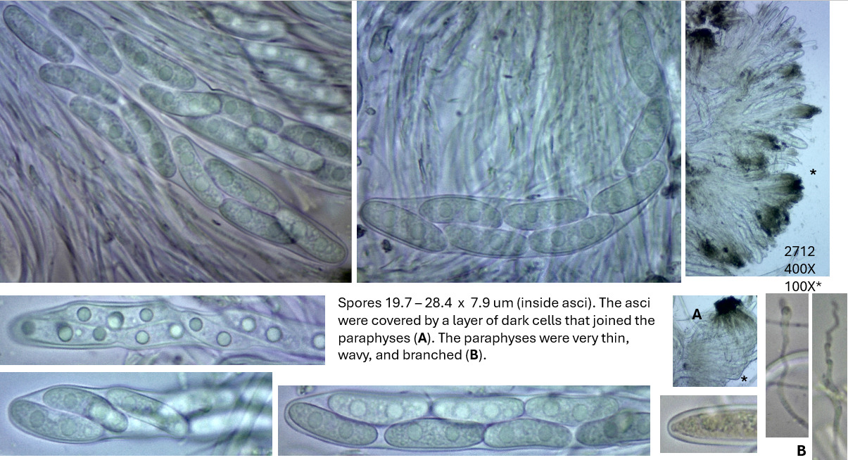 Sporen: Schläuche keulig, 90—100 µm lang, 9—10 µm breit, achtsporig. Sporen länglich-ellipsoidisch, stumpf, meist gerade, einzellig mit je einem grossen Öltropfen in der Ecke, farblos, 10 — 15 µm lang, 5—6 µm breit, oben zweireihig gelagert. Paraphysen sehr zart, septiert, oben ästig und ein gelbbräunliches Epithecium bildend.