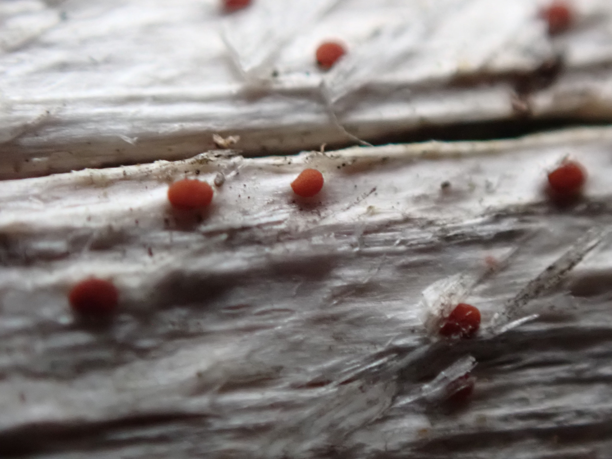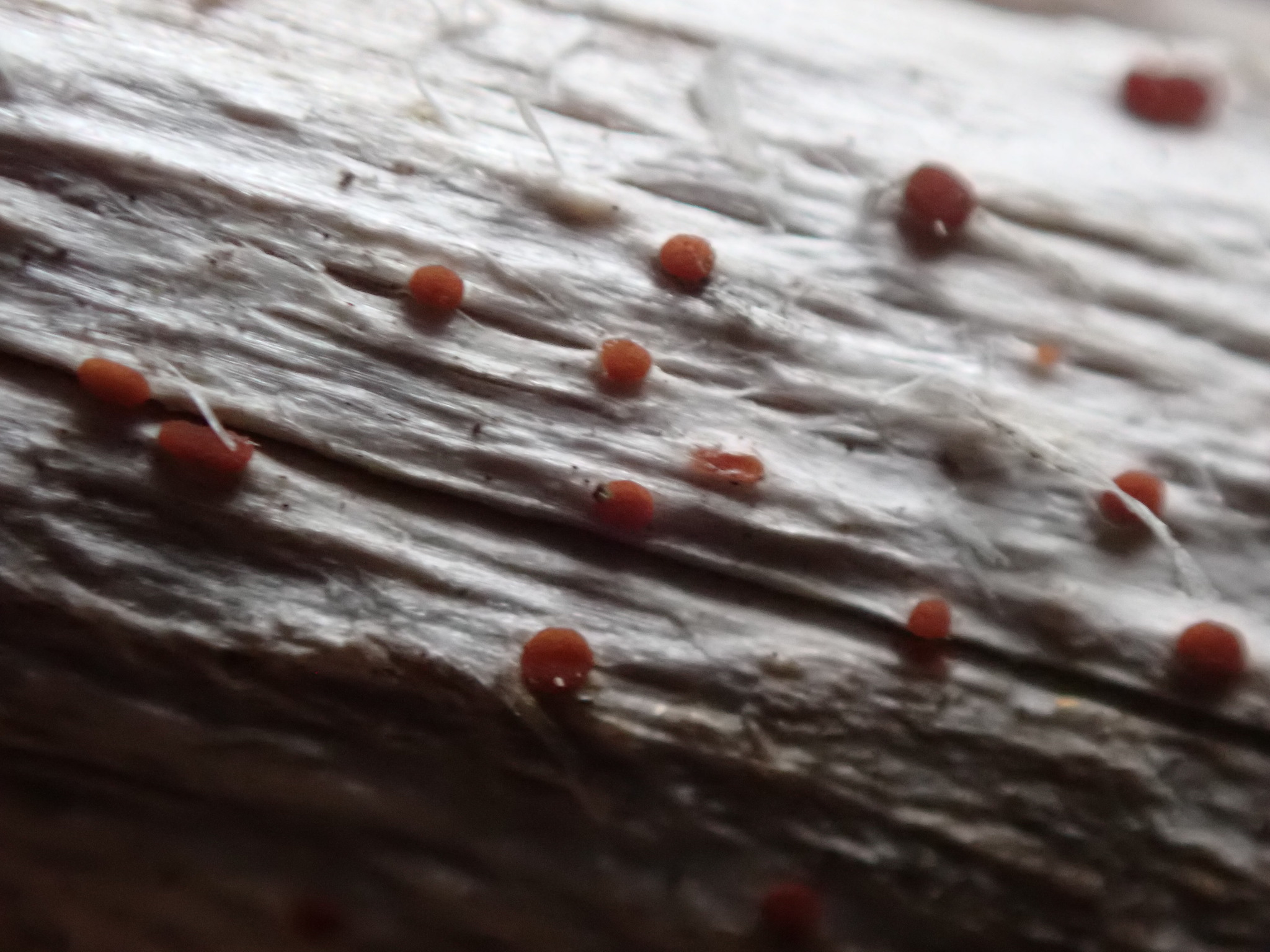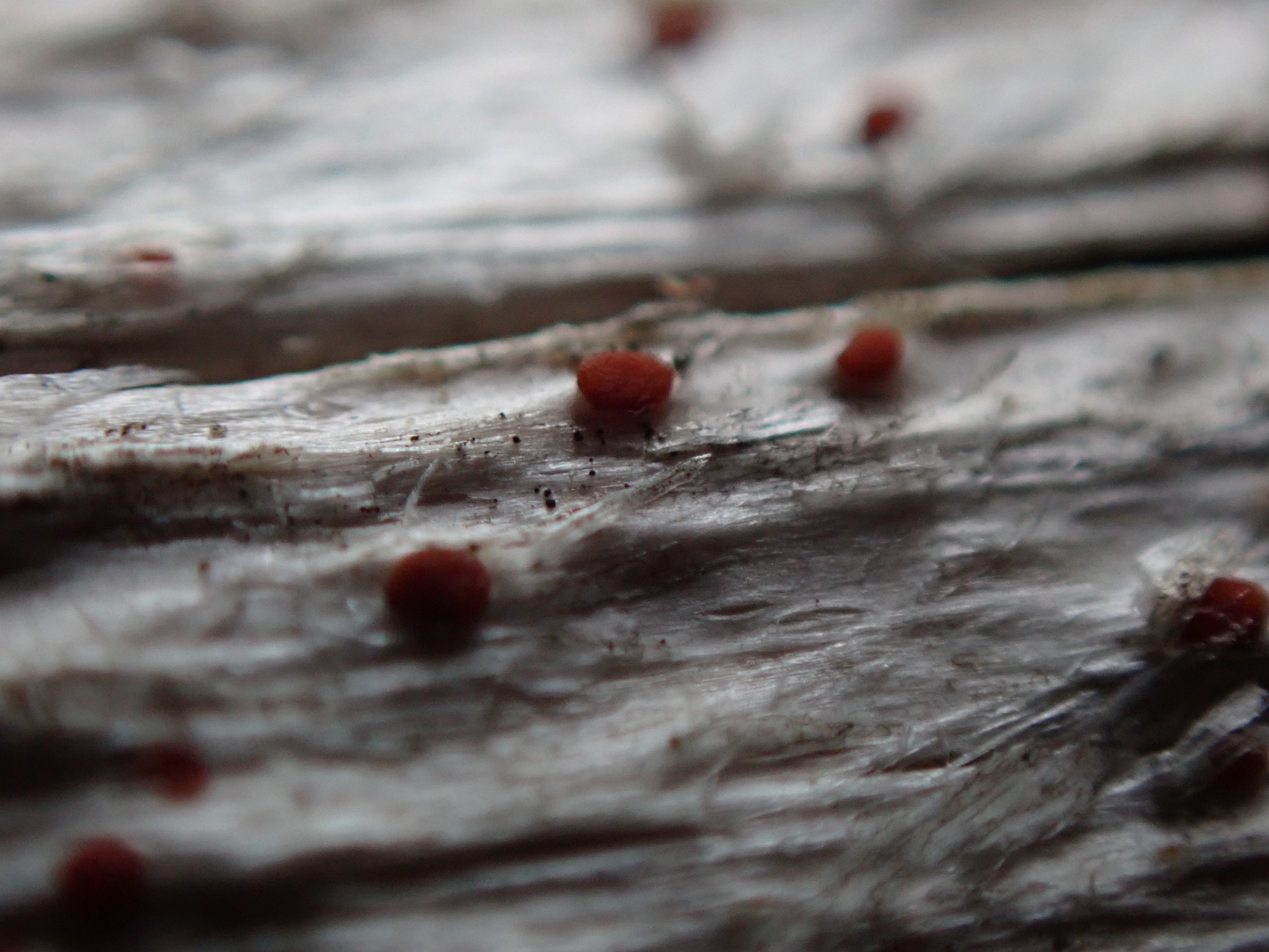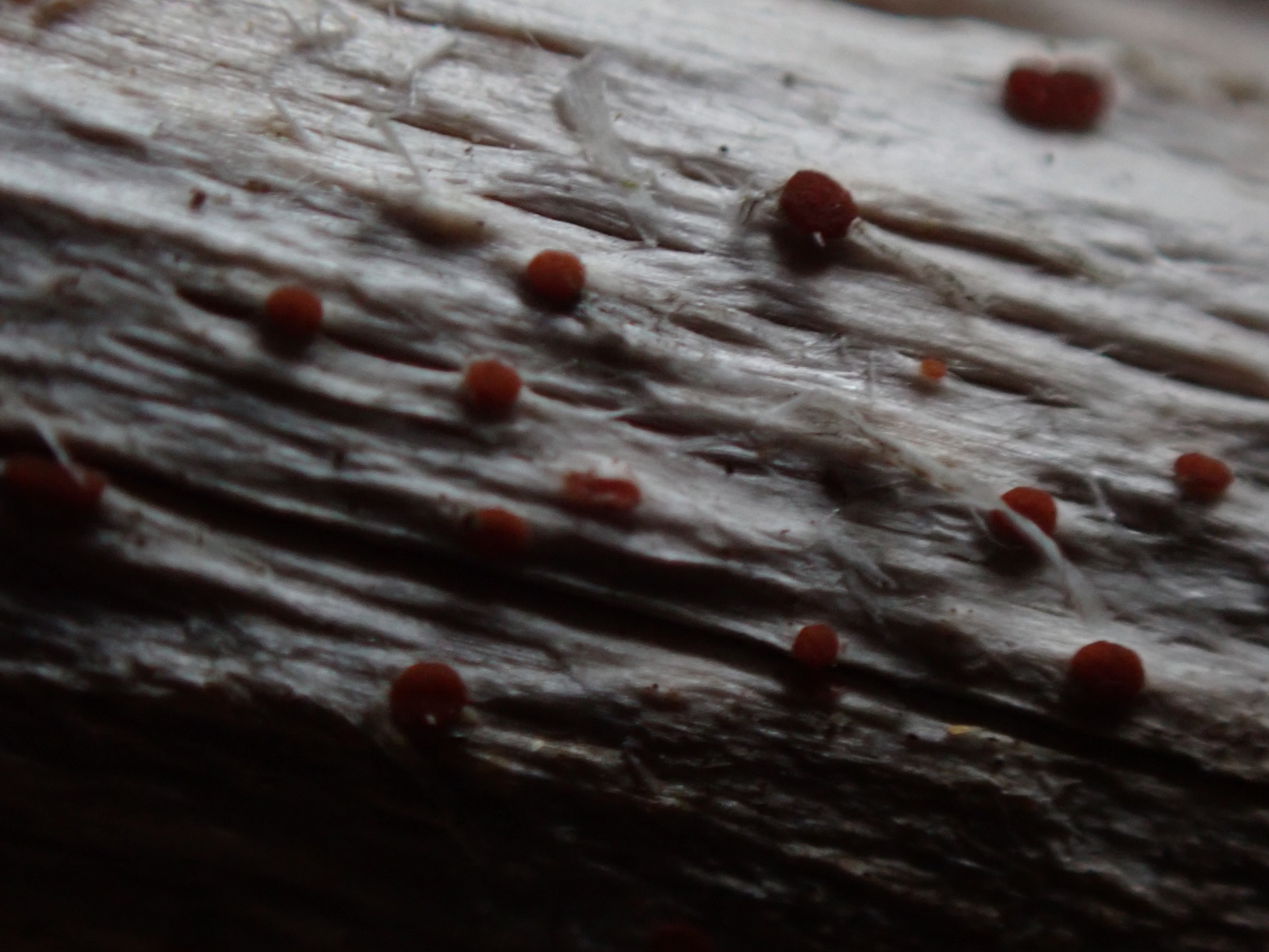 Fruchtkörper: Apothecien auf verblassten weissen Stellen gesellig, hervorbrechend, zuletzt sitzend, mit runder oder länglicher, flacher, später halbkugelig gewölbter, immer unberandeter Fruchtscheibe, 0,3—05 mm breit rot oder rotbraun, wachs- gallertartig.