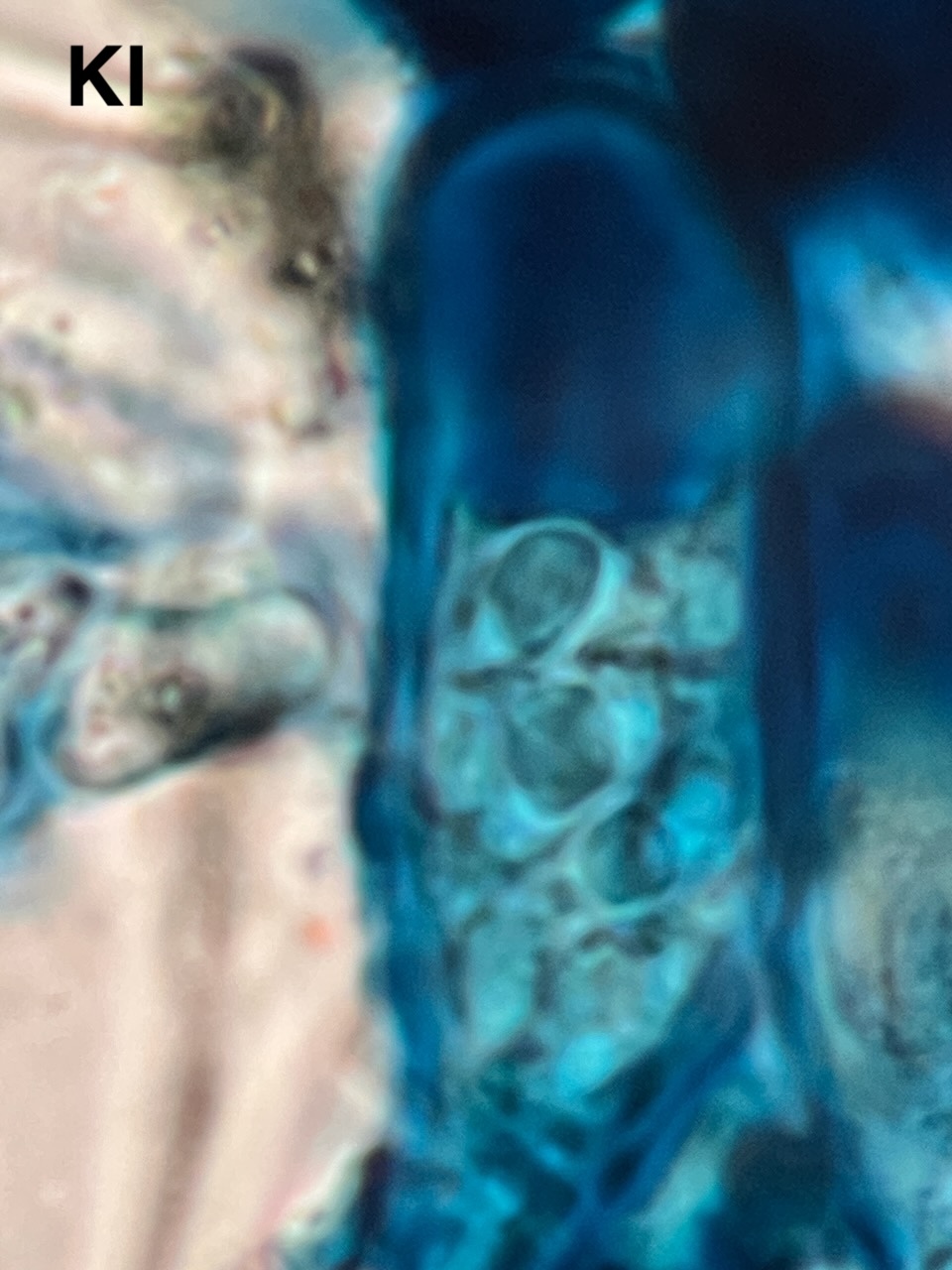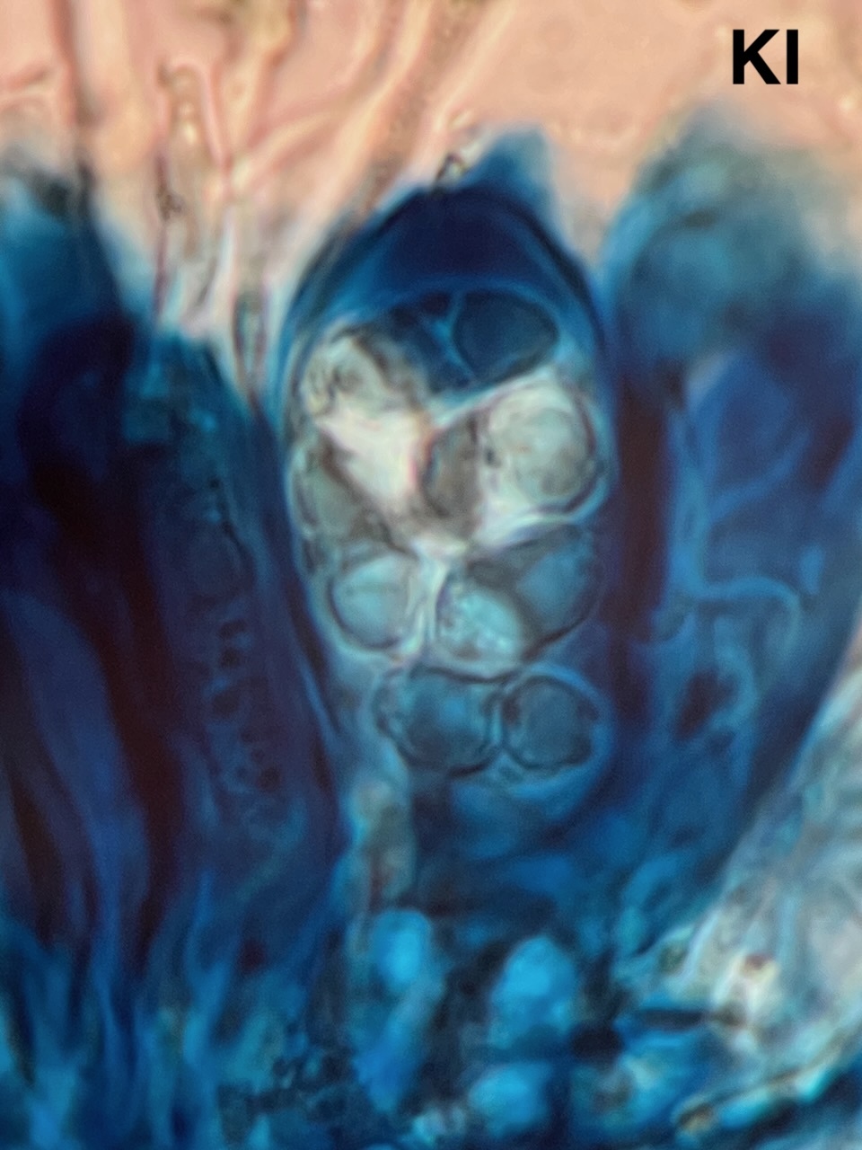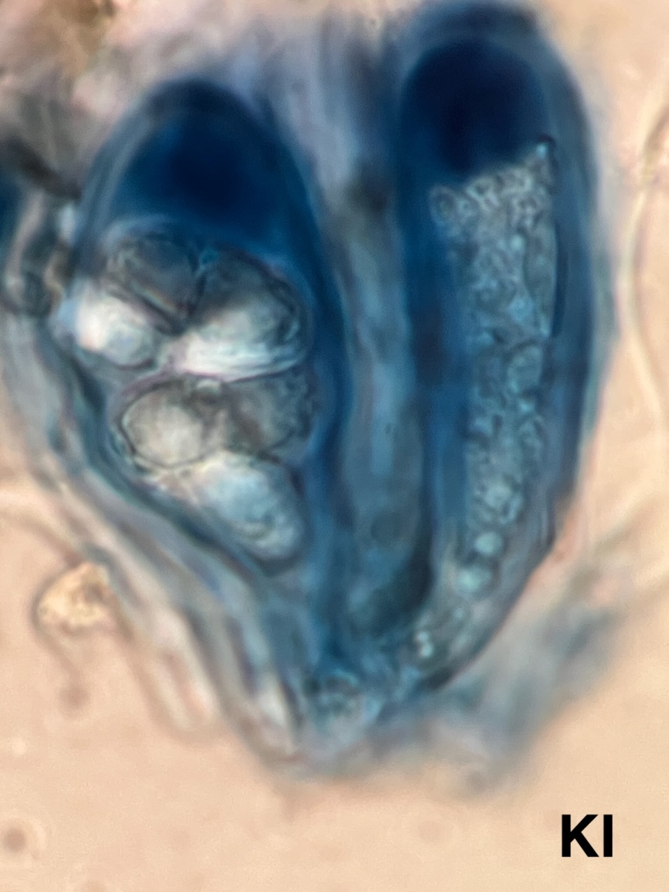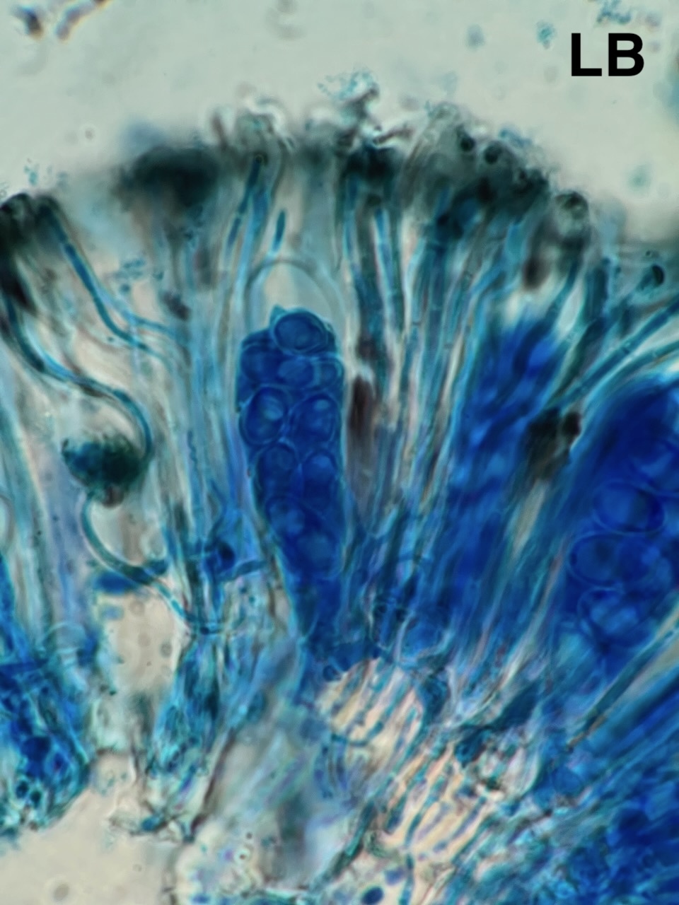 Sporen: Schläuche keulig, oben abgerundet, dickwandig, 45—50 µm lang, 15 µm breit, achtsporig. Sporen rhombisch-elliptisch, an beiden oder einem Ende ziemlich zugespitzt, einzellig, oft mit einem grossen zentralen Öltropfen, farblos, 10—12 µm lang, 5—7 µm breit, zweireihig gelagert. Paraphysen fädig, verklebt, nach oben bis 6 µm breit und stahlblau, ein nicht dichtes Epithecium bildend. Hypothecium schwach gelblich. Jod bläut die Fruchtschicht, Ätzkali färbt das Epithecium grün.