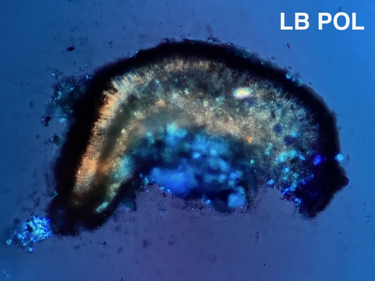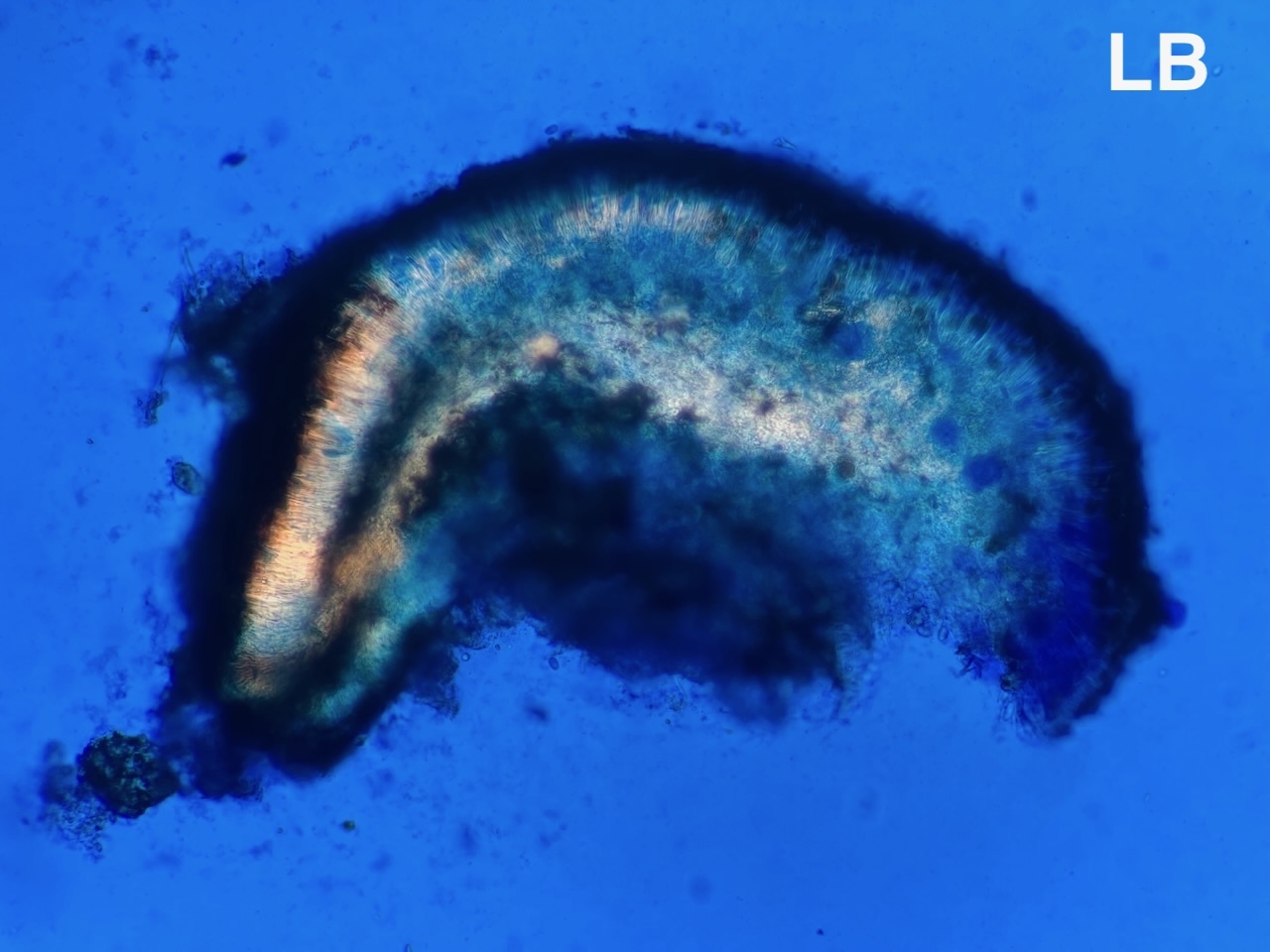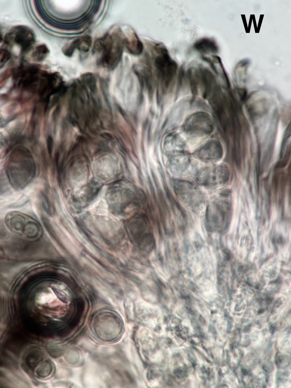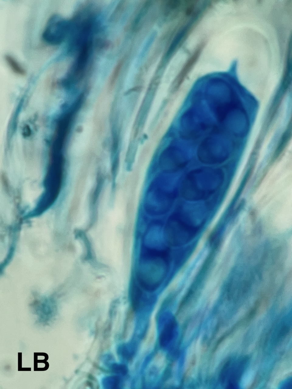 Sporen: Schläuche keulig, oben abgerundet, dickwandig, 45—50 µm lang, 15 µm breit, achtsporig. Sporen rhombisch-elliptisch, an beiden oder einem Ende ziemlich zugespitzt, einzellig, oft mit einem grossen zentralen Öltropfen, farblos, 10—12 µm lang, 5—7 µm breit, zweireihig gelagert. Paraphysen fädig, verklebt, nach oben bis 6 µm breit und stahlblau, ein nicht dichtes Epithecium bildend. Hypothecium schwach gelblich. Jod bläut die Fruchtschicht, Ätzkali färbt das Epithecium grün.
