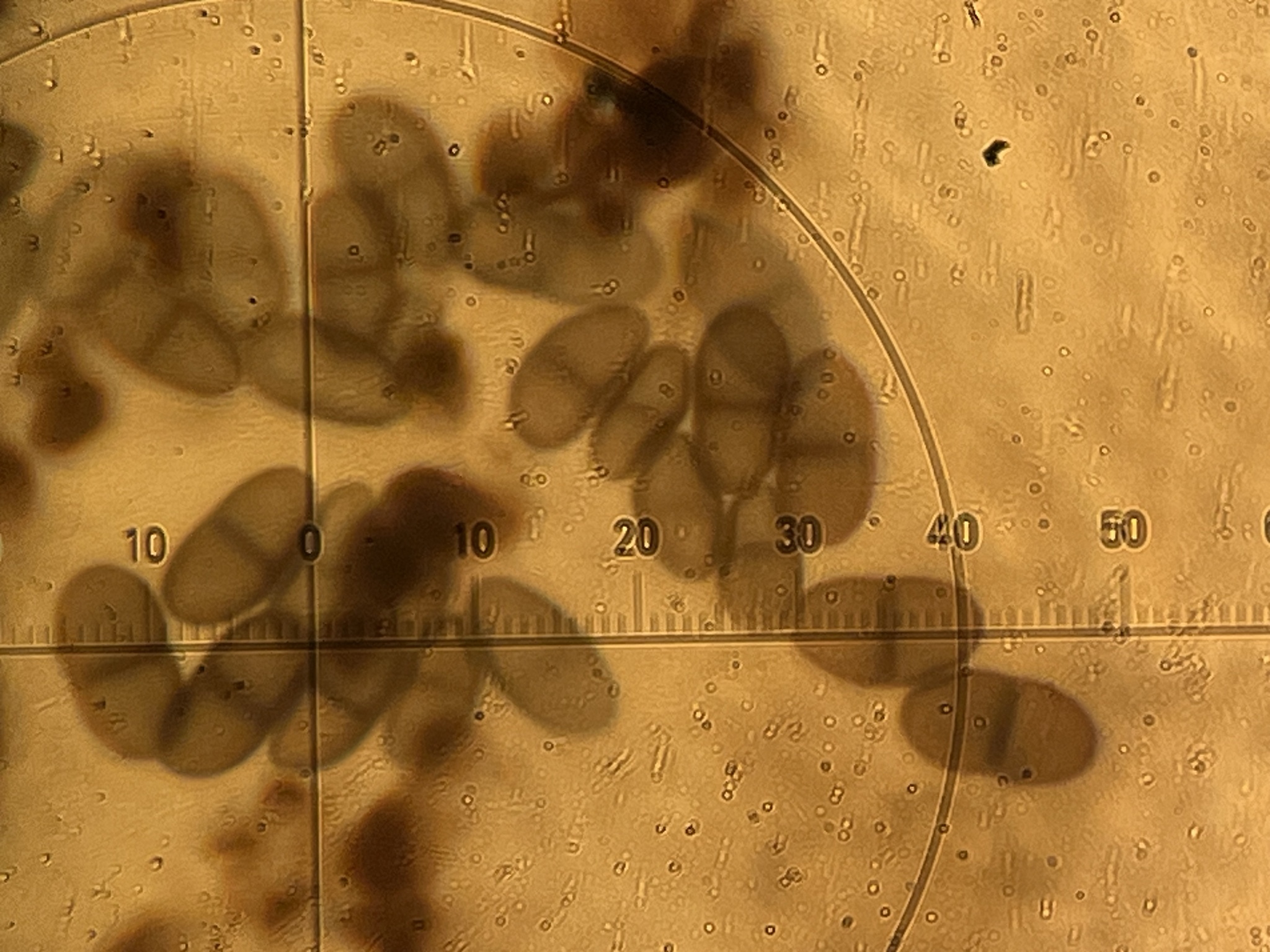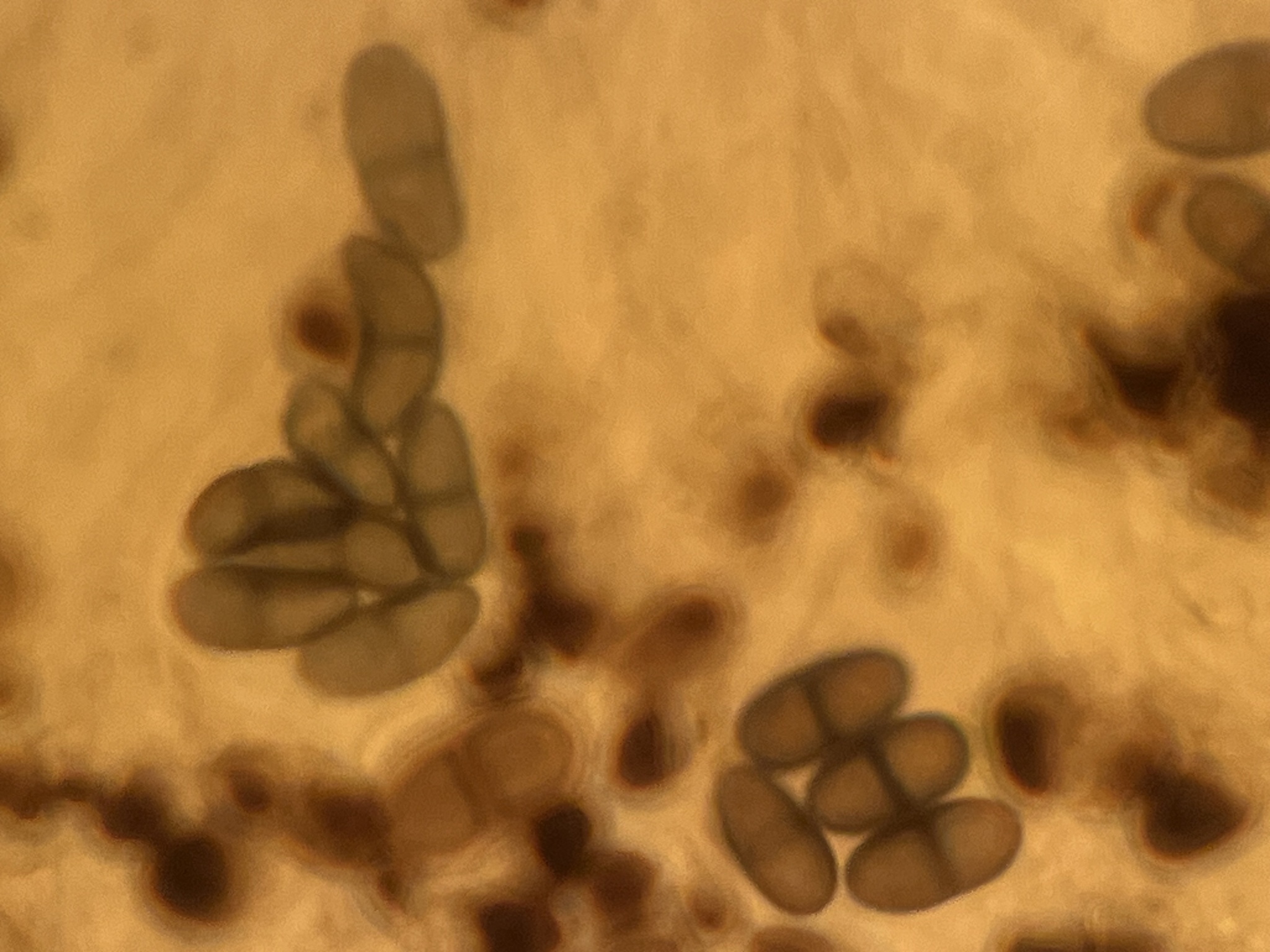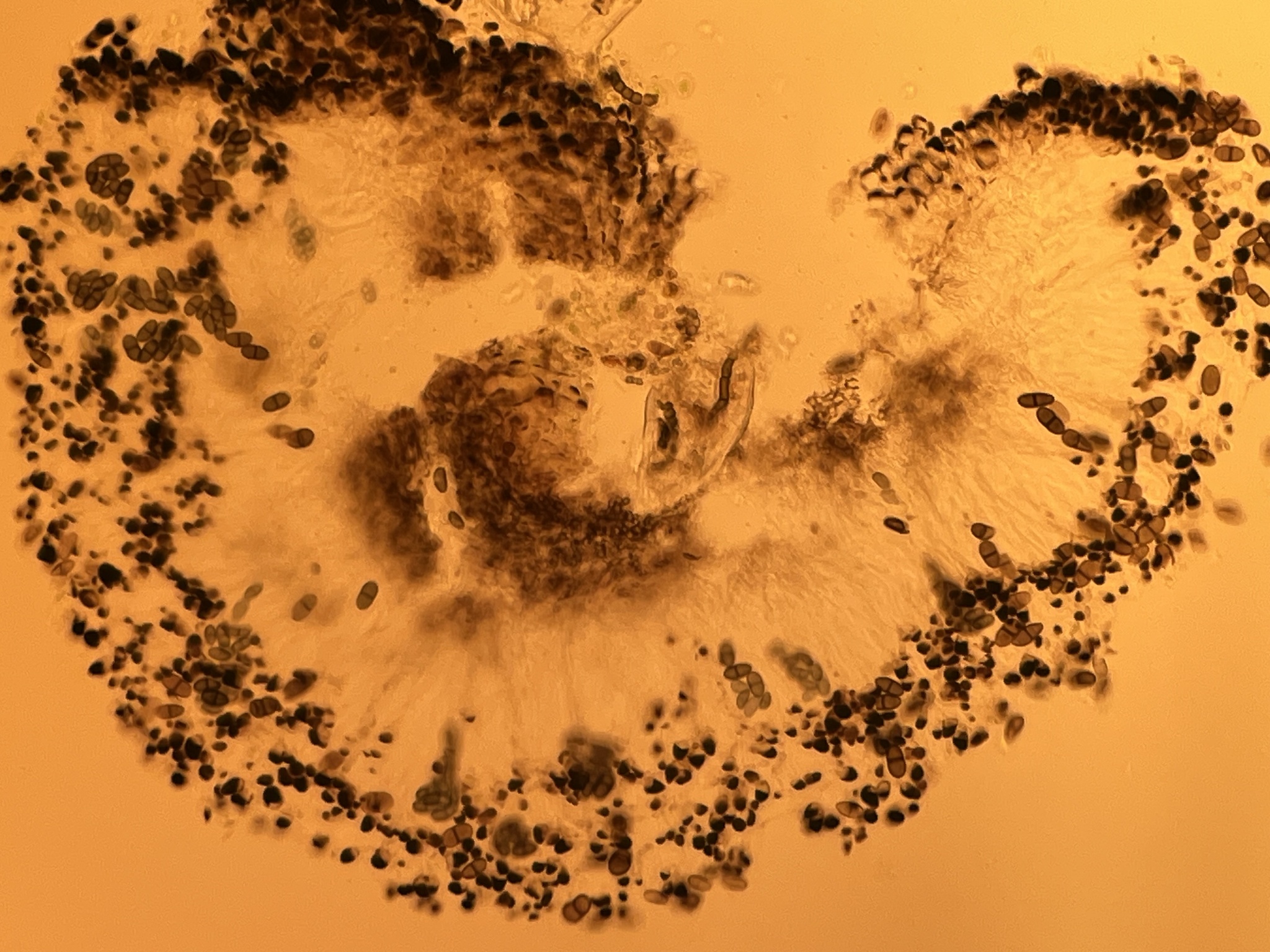 Sporen: Schläuche schmal keulig. Sporen zweizeilig, stumpf, braun, 12—15 µm lang, 6— 8 µm breit; Paraphysen locker, oben bräunlich, keulig verbreitert, ein Epithecium bildend. Hypothecium braun. Fruchtschicht durch Jod blau, dann gelbrötlich gefärbt.