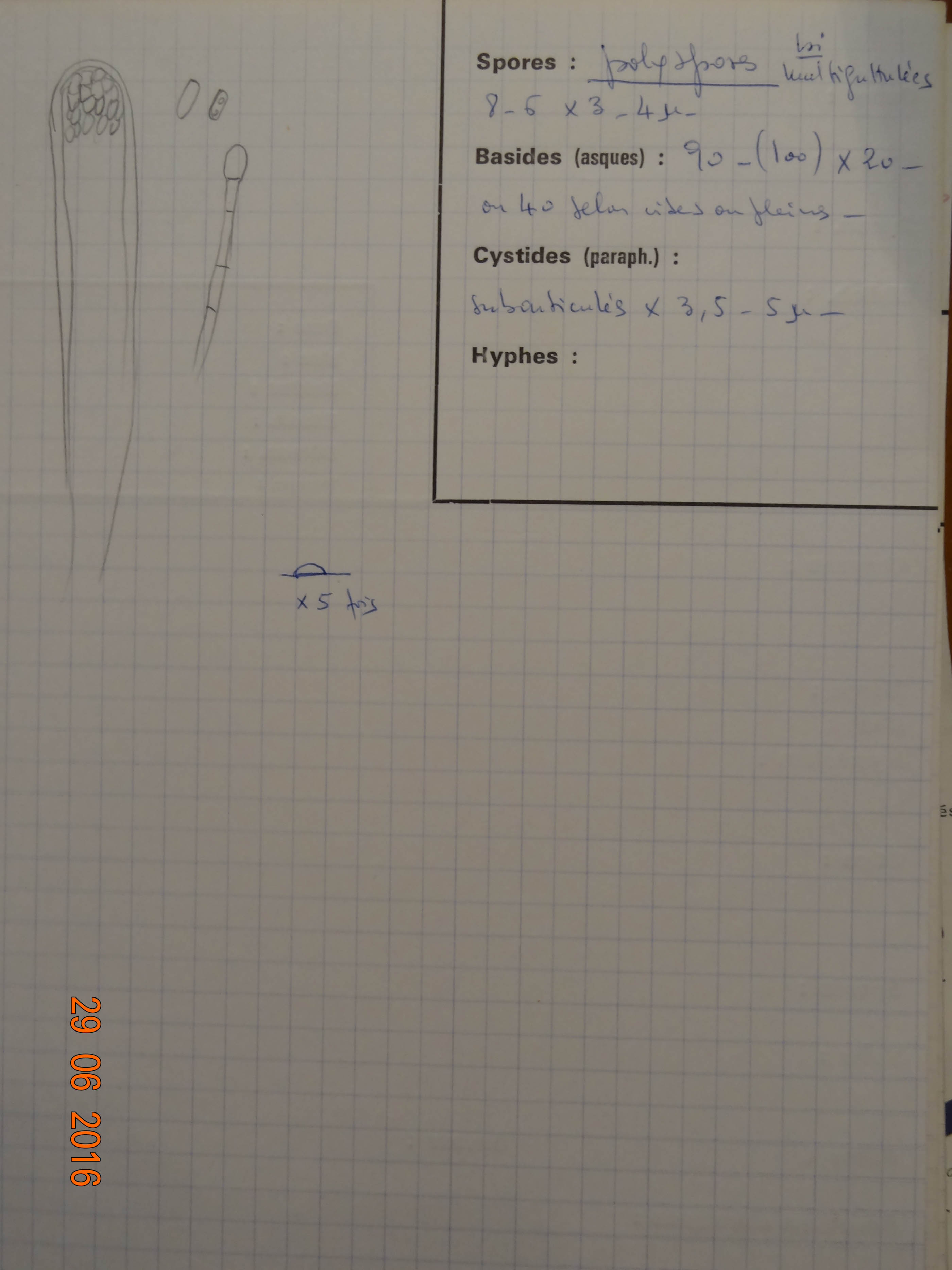 Sporen: Schläuche keulig, oben meist abgerundet, dickwandig, 70—90 µm lang, 20—25 µm breit, vielsporig. Sporen länglich oder länglich-zylindrisch, einzellig, farblos, 6—8 µm lang, 3—4 µm breit. Paraphysen ästig, septiert, verklebt, oben manchmal schwach gelbbräunlich. Fruchtschicht farblos. Hypothecium ffanz schwach gelblich. Jod färbt die Fruchtschicht blau.