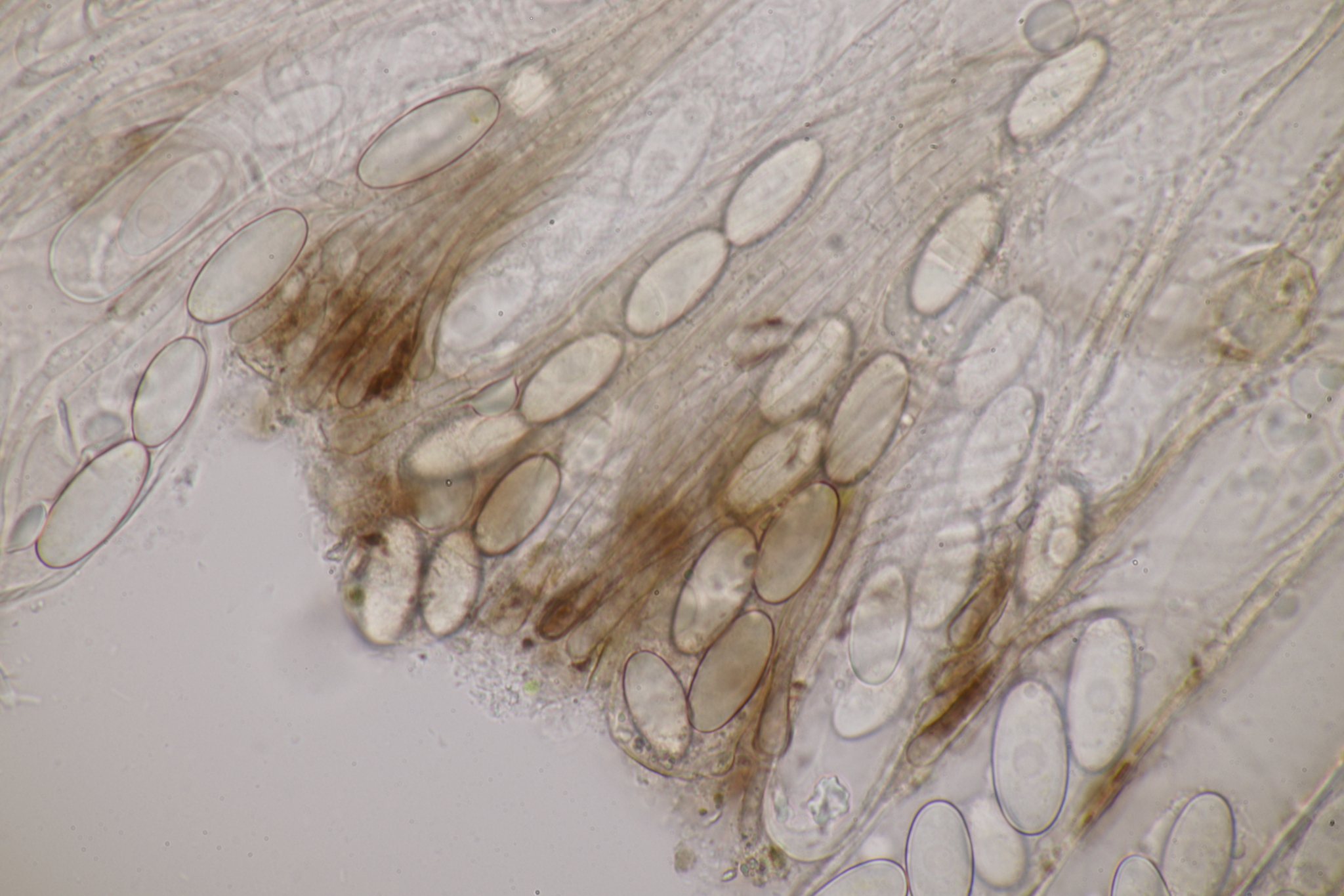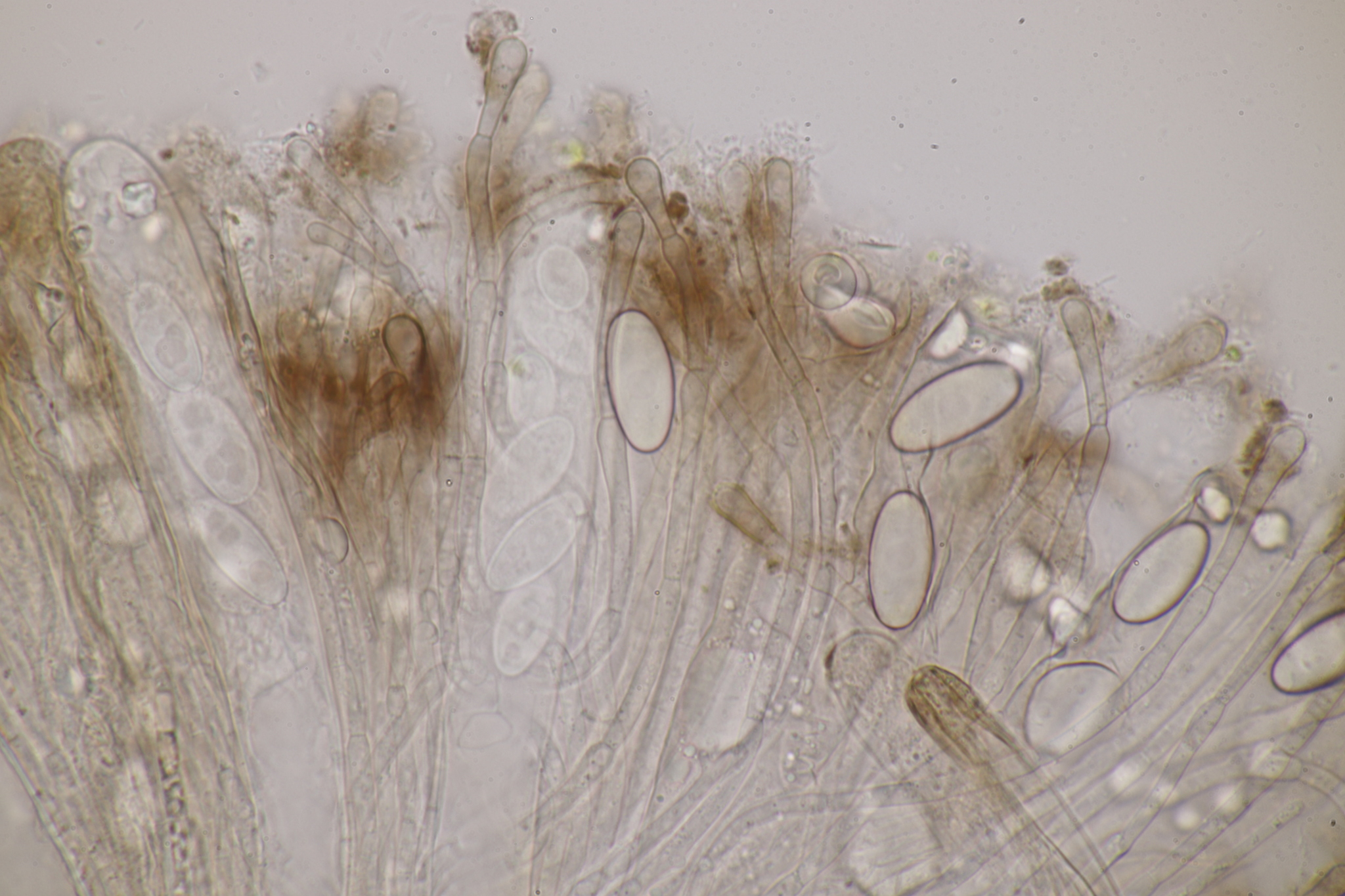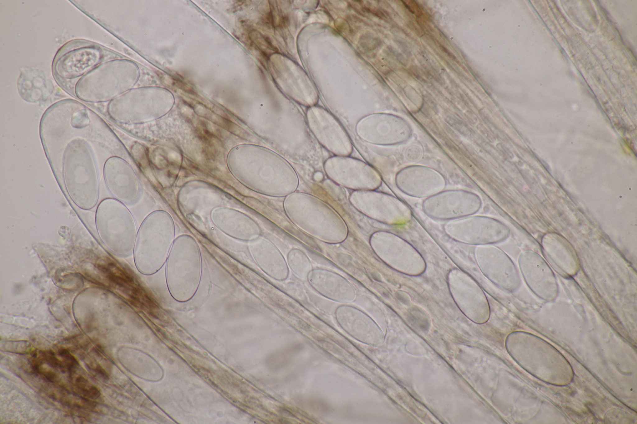 Sporen: Schläuche zylindrisch, oben abgerundet, 150—180 µm lang, 15—17 µm breit, achtsporig. Sporen elliptisch, stumpf, einzellig ohne Oltropfen, glatt, farblos, 21—25 µm lang, 10—12 µm breit, einreihig liegend. Paraphysen fädig, septiert, ca 3 µm breit, oben wenig verbreitert und gelbbräunlich.
