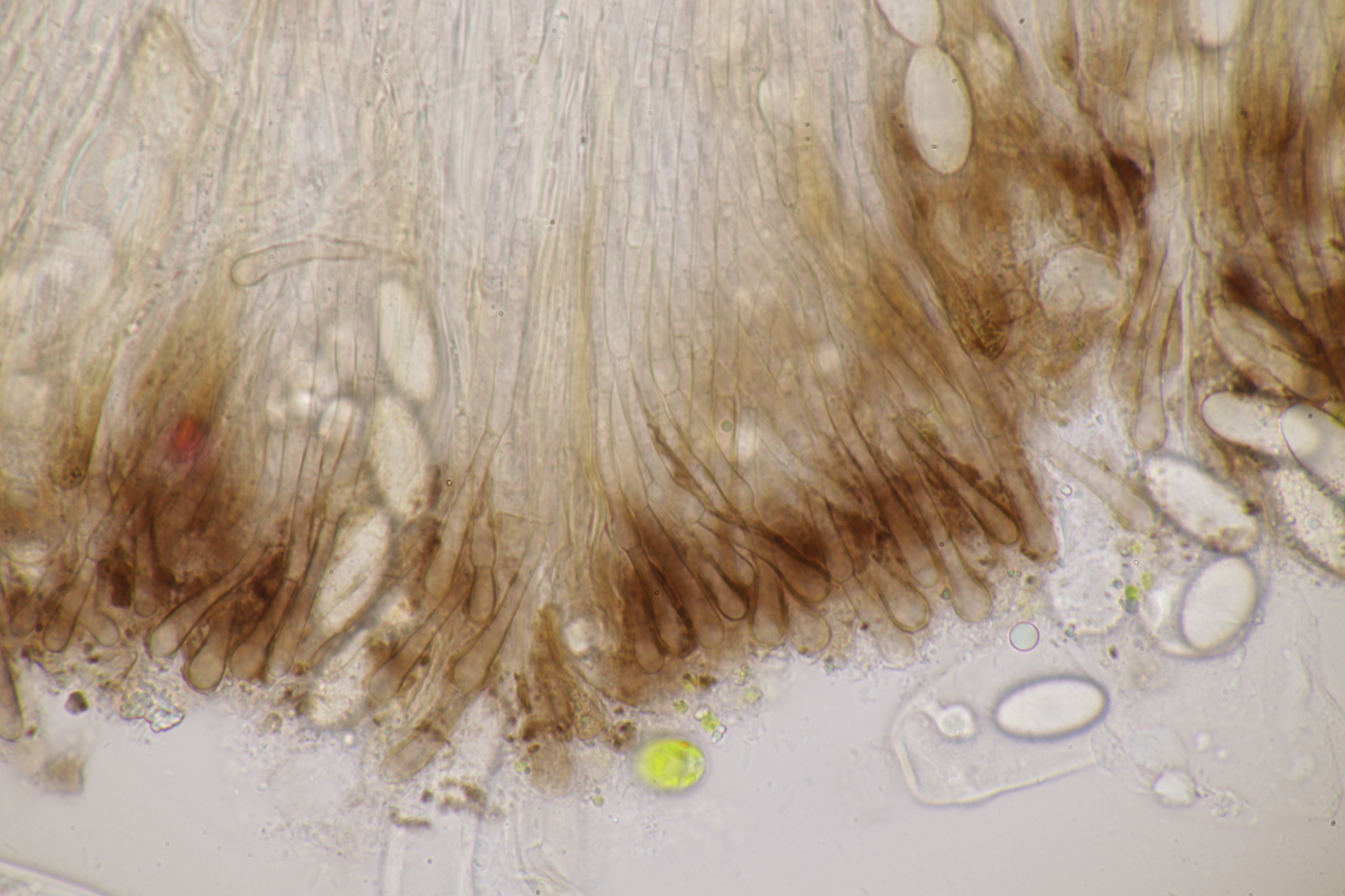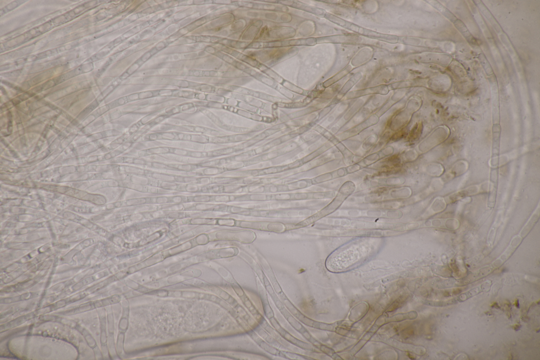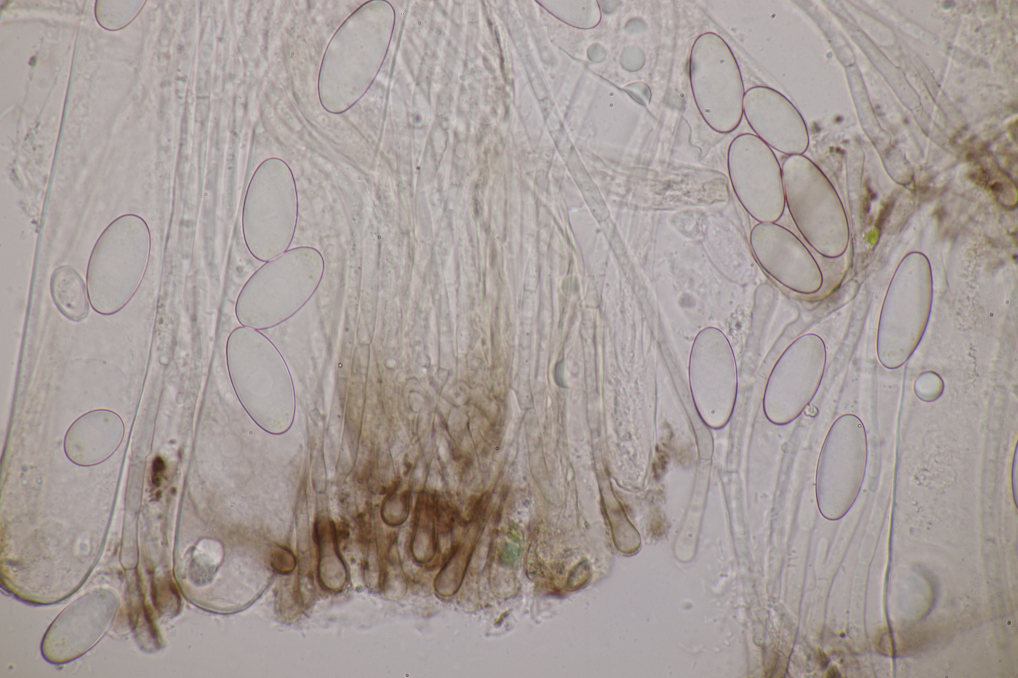 Sporen: Schläuche zylindrisch, oben abgerundet, 150—180 µm lang, 15—17 µm breit, achtsporig. Sporen elliptisch, stumpf, einzellig ohne Oltropfen, glatt, farblos, 21—25 µm lang, 10—12 µm breit, einreihig liegend. Paraphysen fädig, septiert, ca 3 µm breit, oben wenig verbreitert und gelbbräunlich.