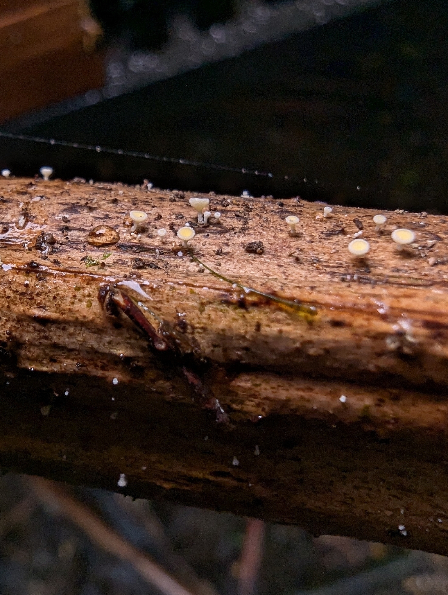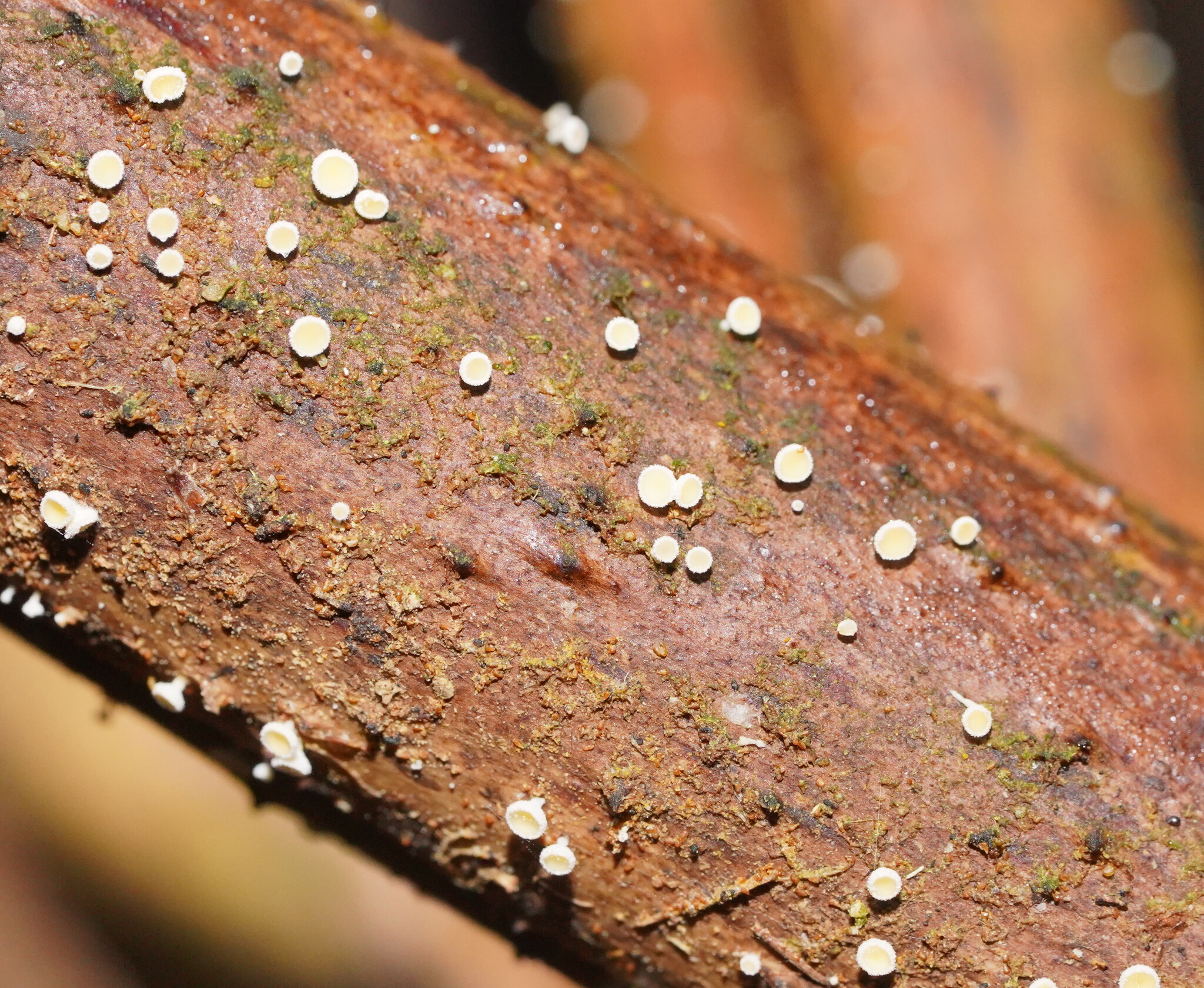 Fruchtkörper: Apothecien sitzend, mit krugförmiger, dann flach ausgebreiteter, blasser Fruchtscheibe, äusserlich zottig, schneeweiss, fast fleischig, 1—1,5 mm breit.
