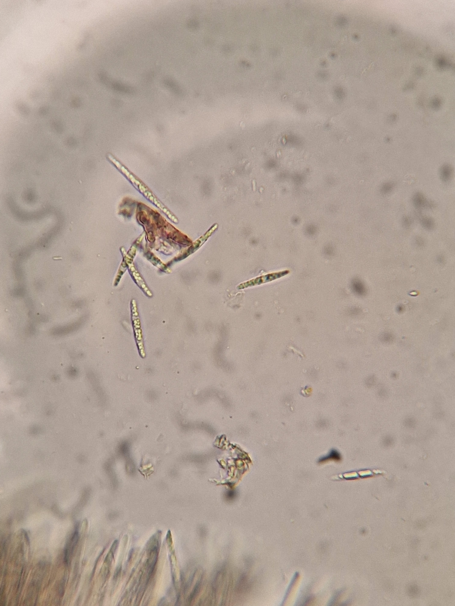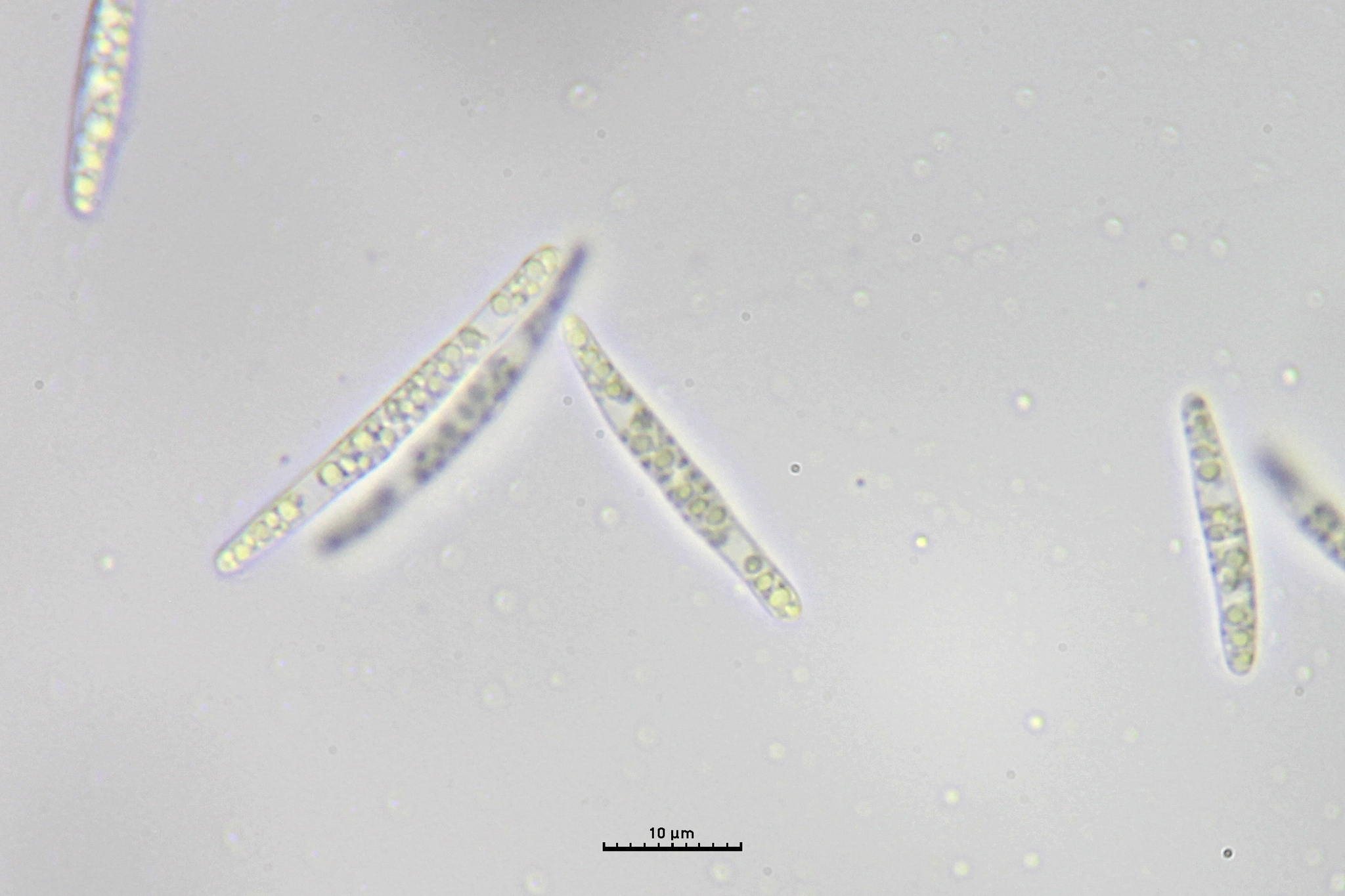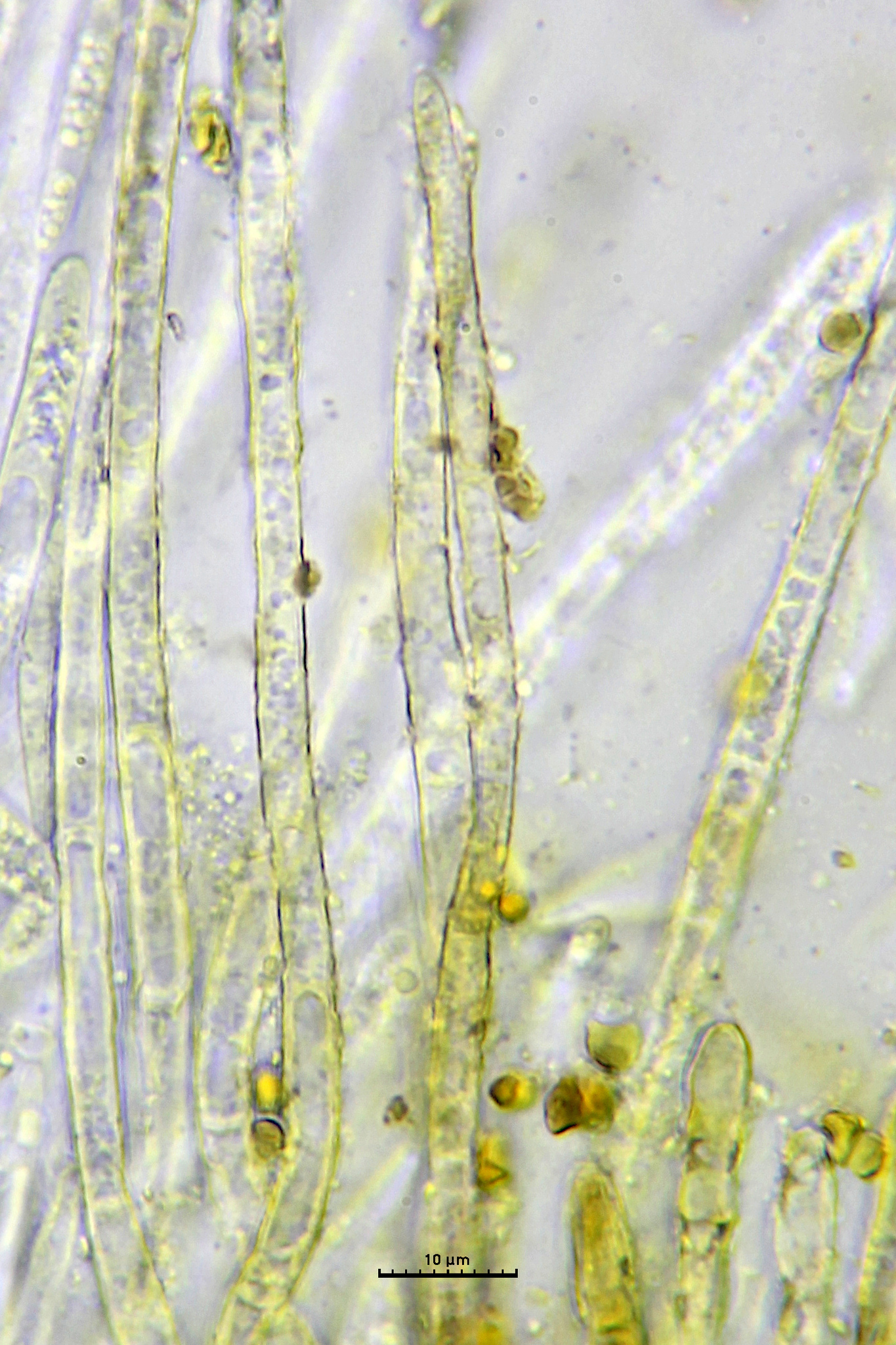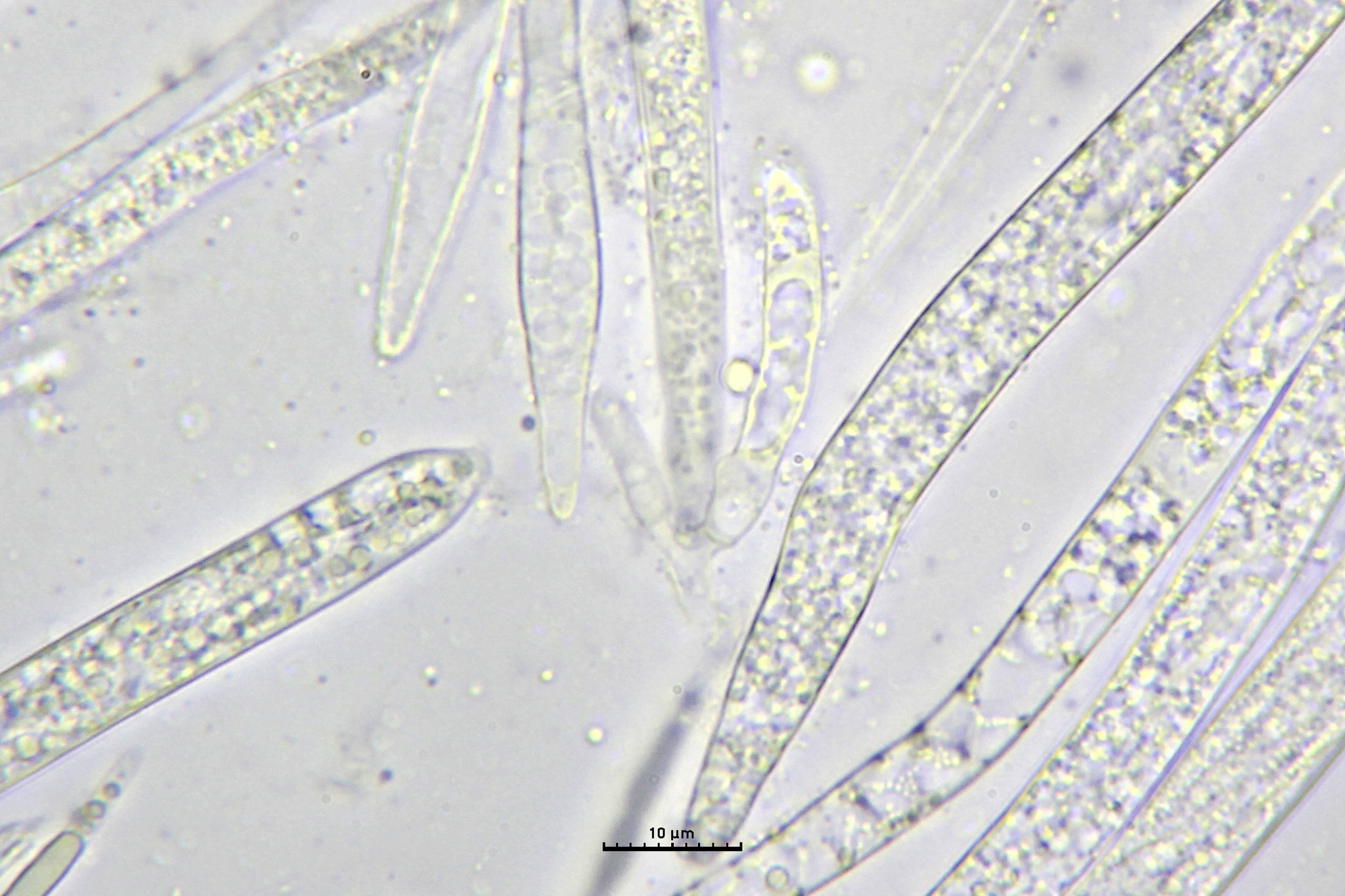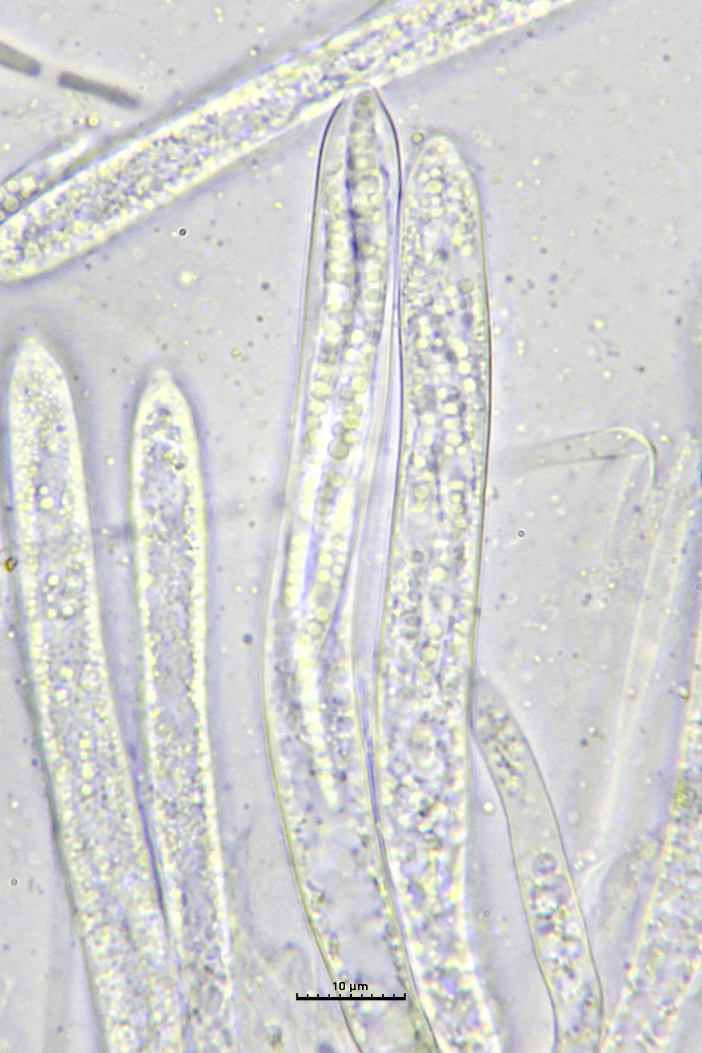Sporen: Schläuche zylindrisch-keulenförmig, 55—70 µm lang. 4 bis 5 µm breit. Sporen zweireihig, spindelförmig, meist 13—17 µm lang, 1,5 bis 2,5 jU breit. Paraphysen 4—5 µm breit, am Scheitel zugespitzt. —