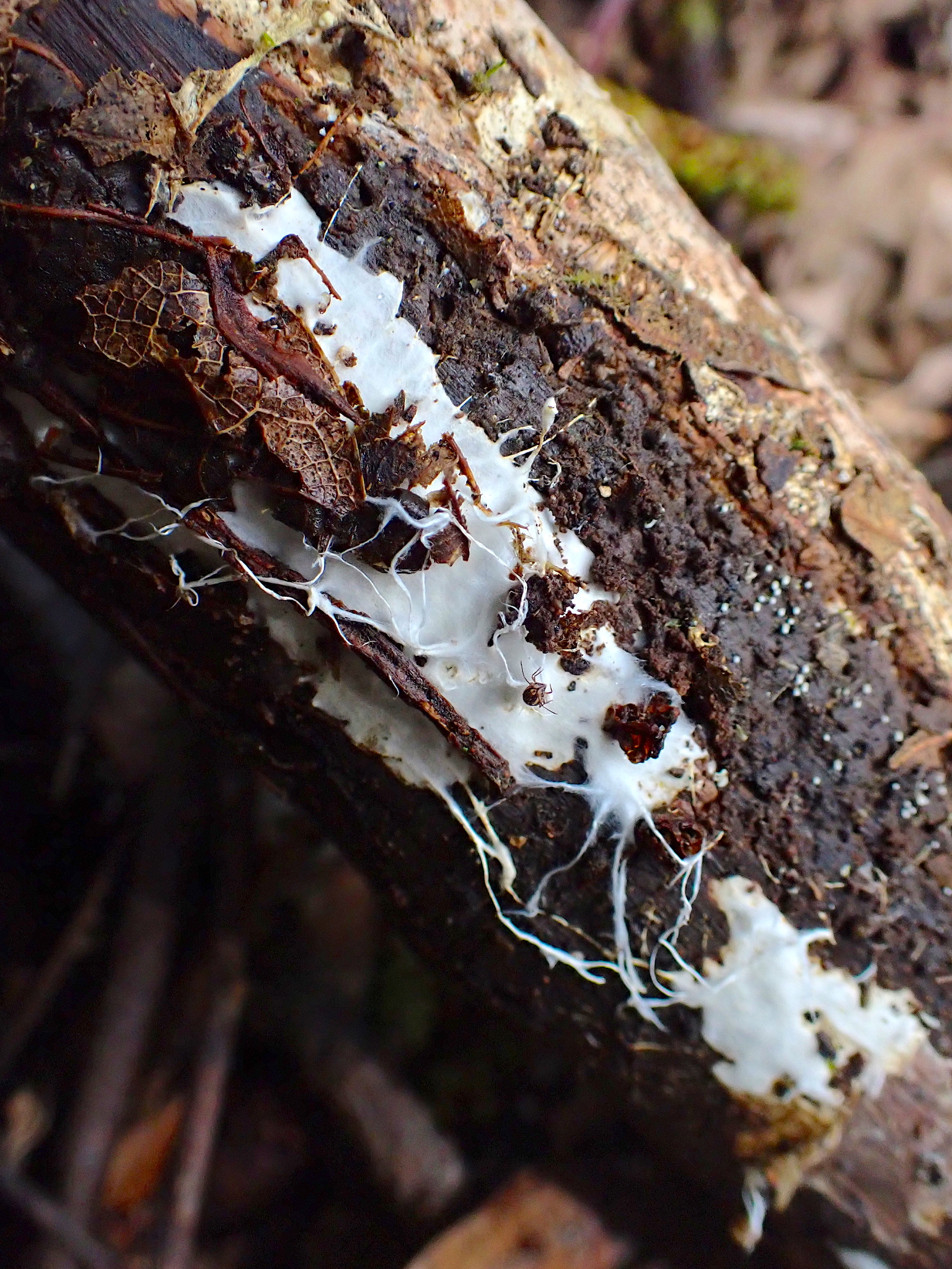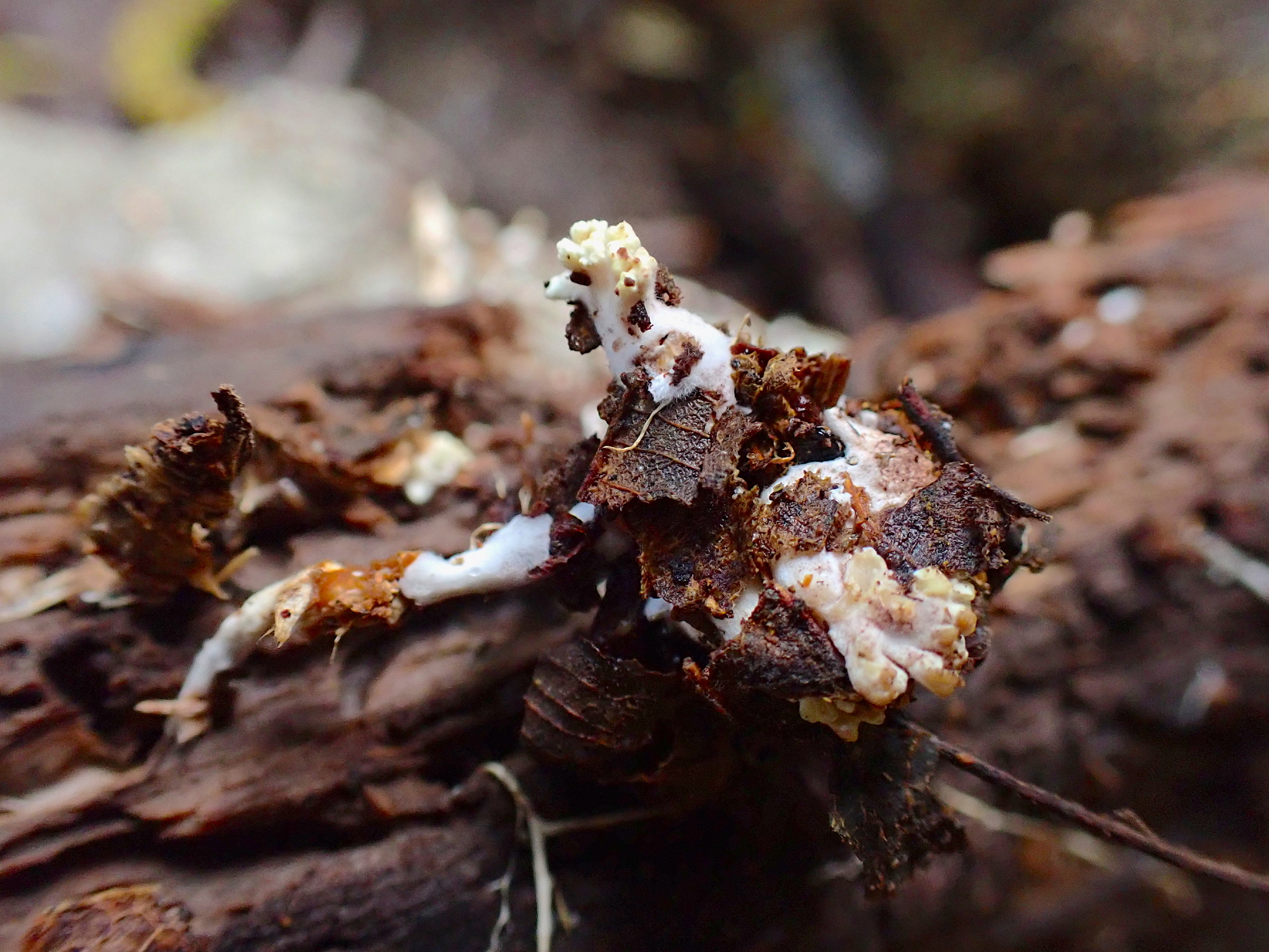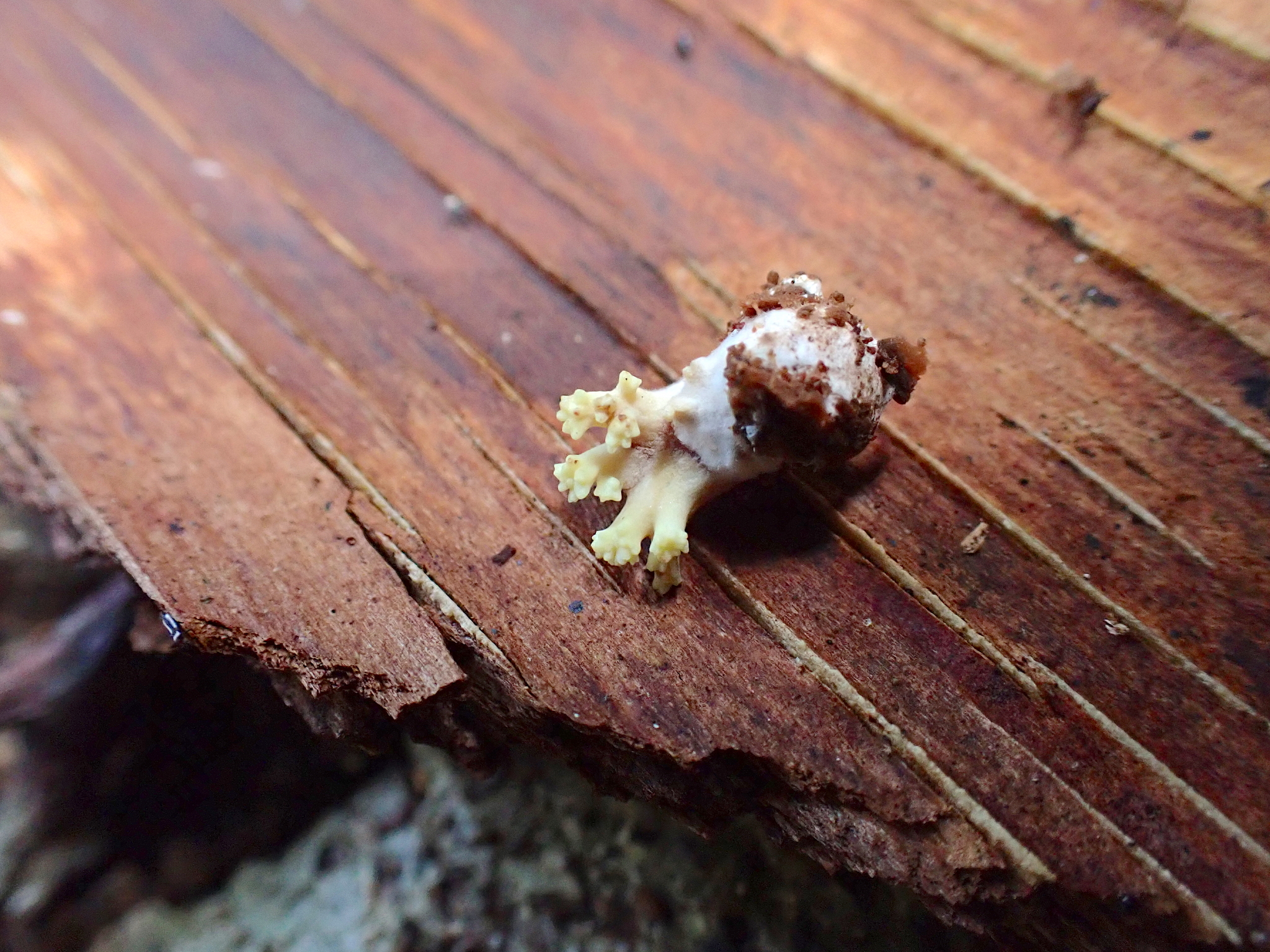 Sporokarp bis zu 80 mm hoch, bis zu 50 mm im Durchmesser, entspringt aus einem kleinen basalen Filz mit einem kleinen Gewirr aus schlanken Rhizomorphen. Stiel 6-7 mm dick, deutlich, bis zu 1,2 cm lang, wenige Hauptäste, kräftig, weinrot-zimtfarben oder rotbraun, Achseln grün, stark bruno-vineszent bei Verletzung. Spitzen bis zu 4 mm lang, cremegelb. Rhizomorphen dimitisch mit Skeletthyphen, generative Hyphen 2,4-4,5 µm im Durchmesser, dünnwandig, hyalin, dicht verflochten; Skeletthyphen 1,3-2,2 (-3,0) µm im Durchmesser, etwas dickwandig, gerade, aber flexibel, hyalin. Klammerverbindungen vorhanden. Sporen ellipsoid bis subzylindrisch, 7,0-9,3 x 3,5-4,2 µm, dünnwandig, cyanophil, mit verstreuten, niedrigen Warzen als Ornamentierung.